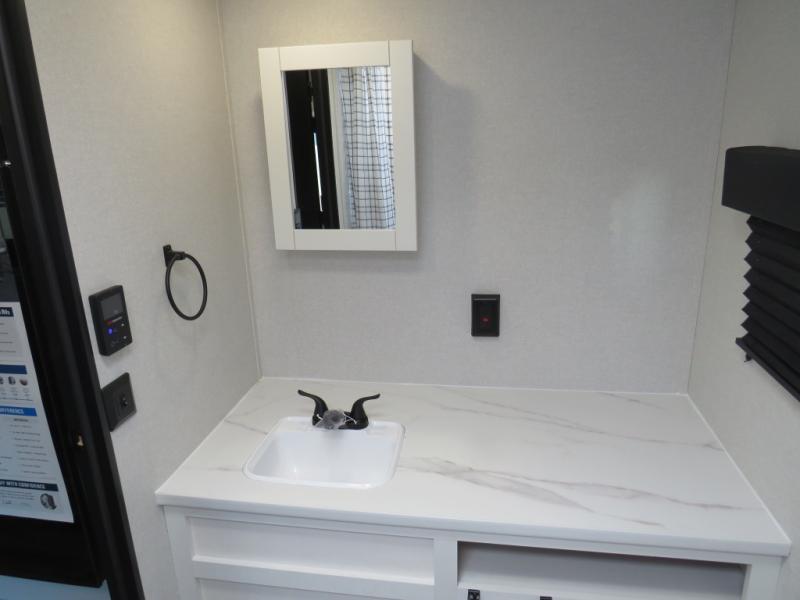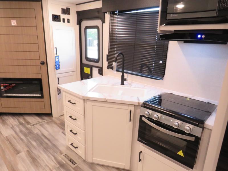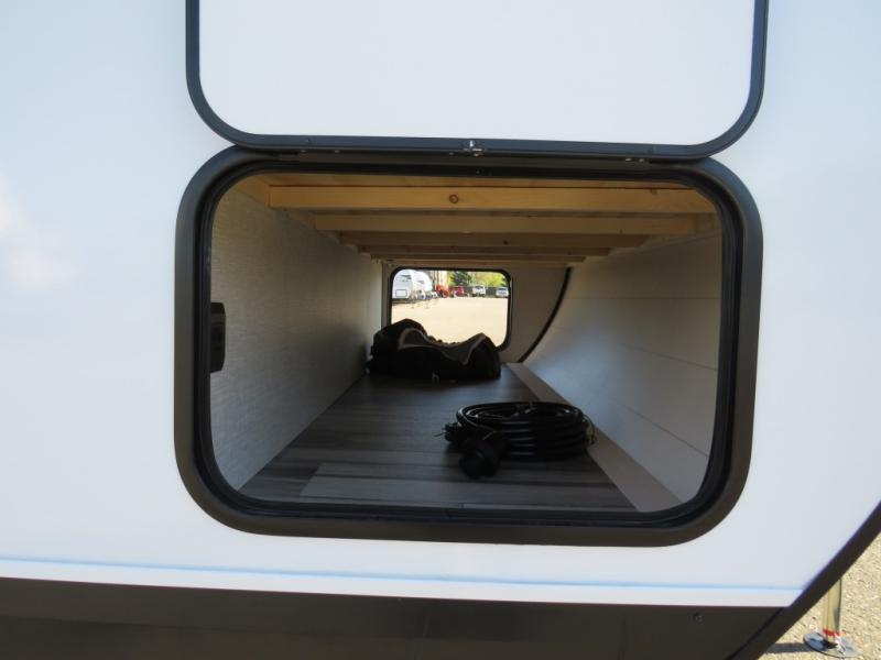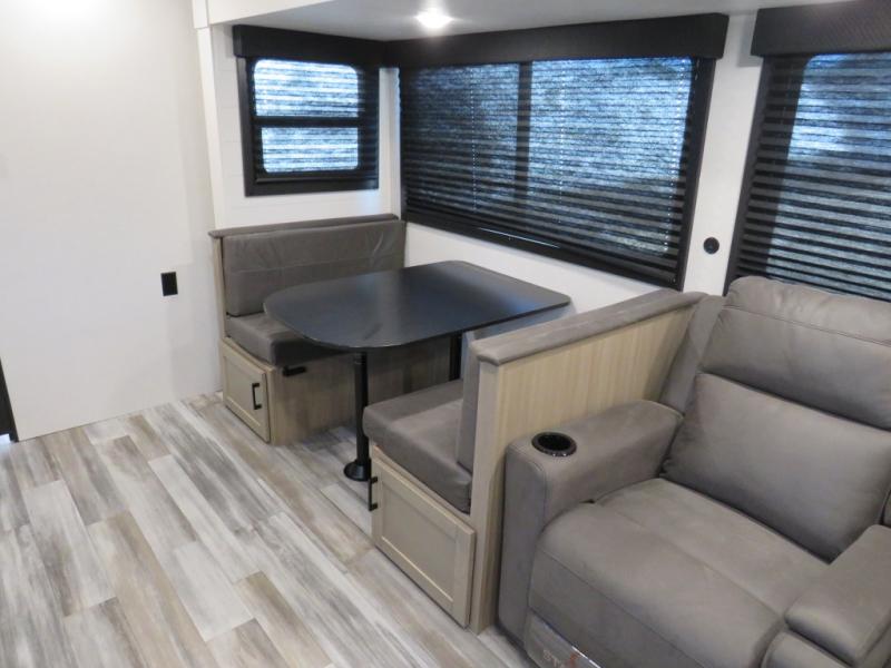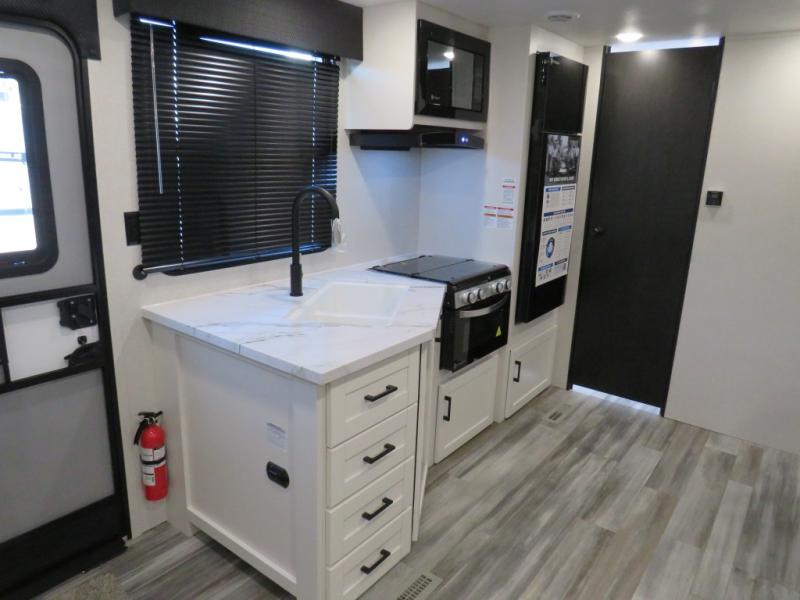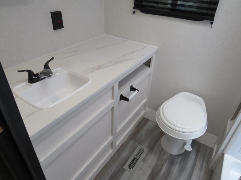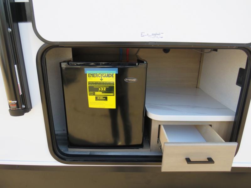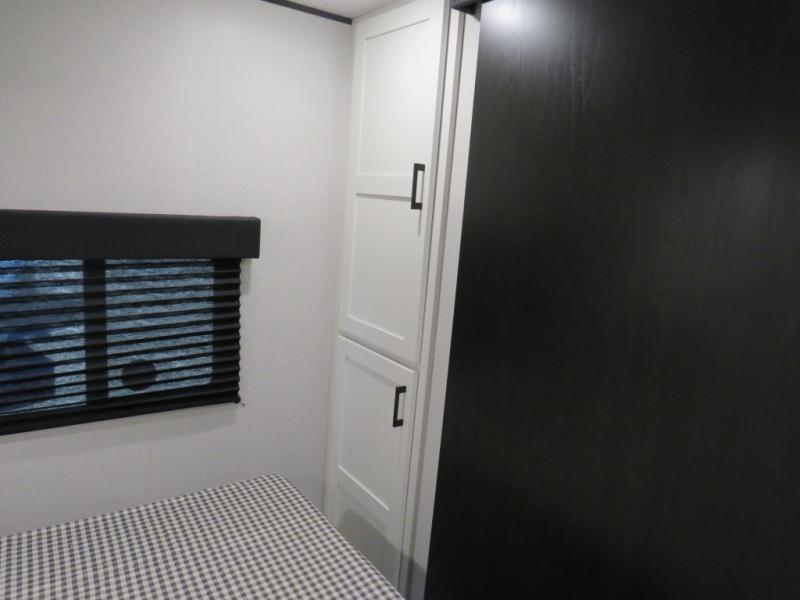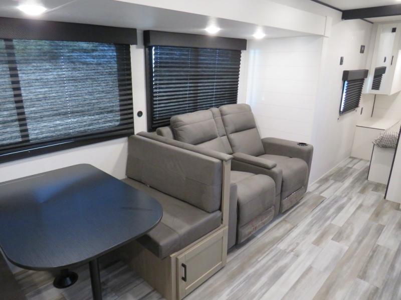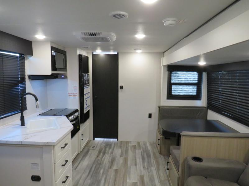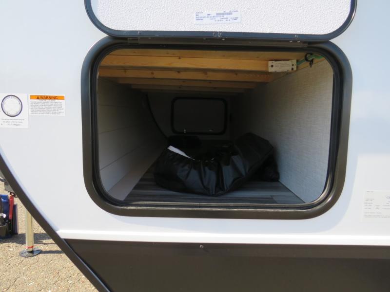 Camping trips just got a whole lot better in this spacious travel trailer for four! You'll love having a private bedroom up front with a queen bed and dual bedside wardrobes, while your guests sleep on the jack-knife sofa and booth dinette within the large slide out. There is a fully-equipped kitchen to make meals each day, plus a hidden pantry with shelves for games and a second pantry to keep snacks stocked. The full rear bath is both spacious and convenient since it's tuck away in the back. Start camping today!