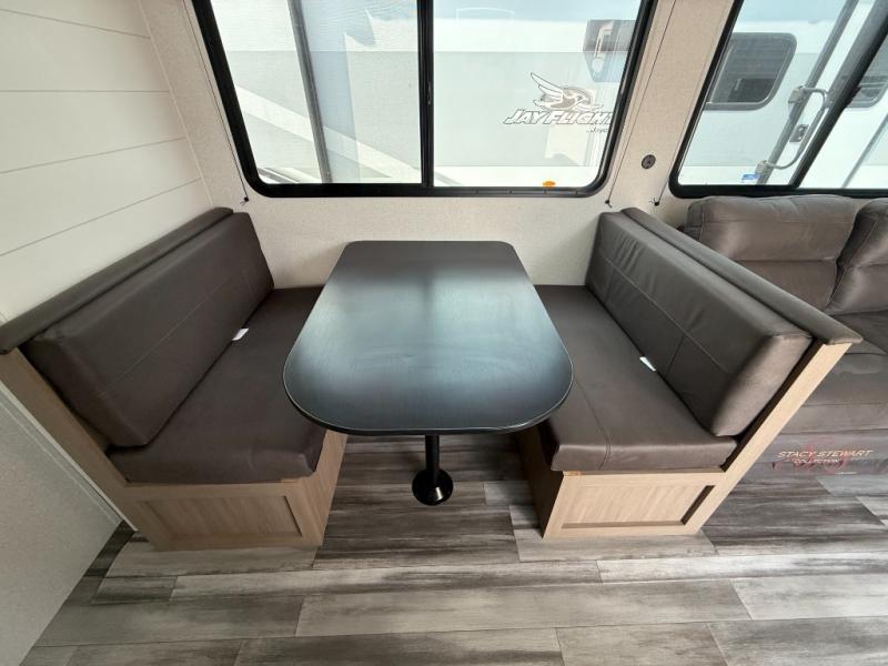 The Jayco Jay Flight SLX travel trailer is quite easy to own because it is lightweight for an easier towing experience. Built on a fully integrated A-frame with galvanized-steel, impact-resistant wheel wells, the Jay Flight SLX has quality at its very foundation. That quality continues on to the electric self-adjusting brakes, easy-lube hubs, Magnum Truss roof system, and LP quick connect. Some of what the mandatory Customer Value Package includes is backup camera prep, Keyed-Alike entry and baggage doors, and an on-demand tankless water heater.