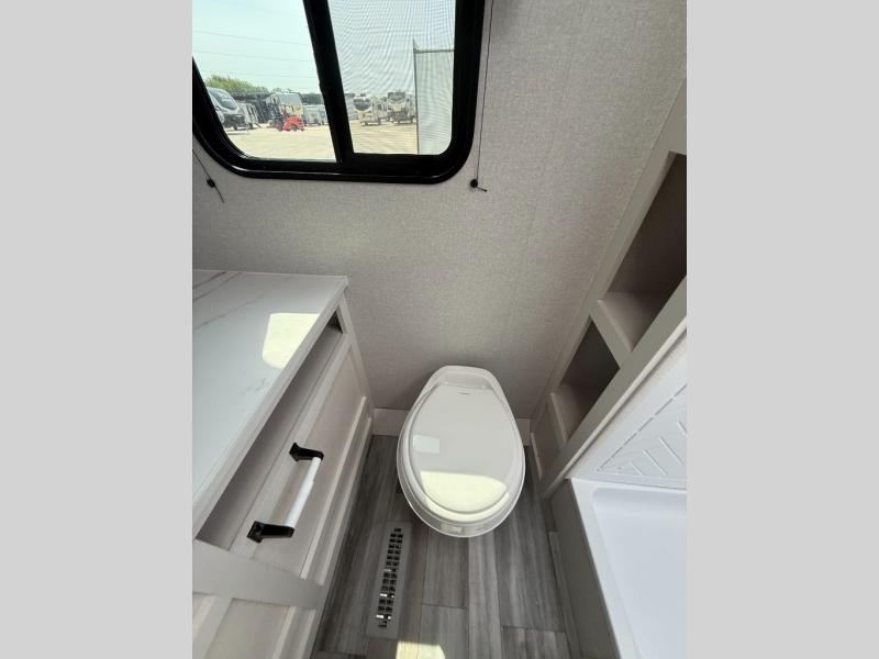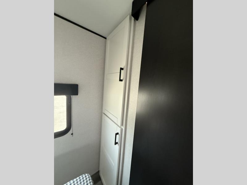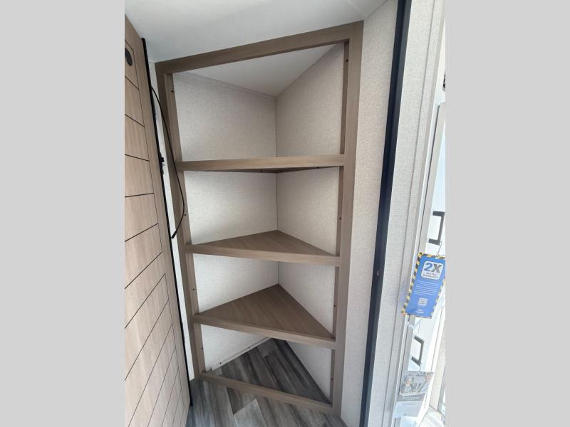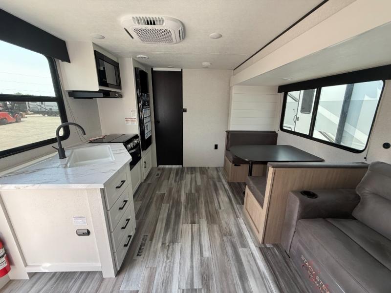 Camping trips just got a whole lot better in this spacious travel trailer for four! You'll love having a private bedroom up front with a queen bed and dual bedside wardrobes, while your guests sleep on the jack-knife sofa and booth dinette within the large slide out. There is a fully-equipped kitchen to make meals each day, plus a hidden pantry with shelves for games and a second pantry to keep snacks stocked. The full rear bath is both spacious and convenient since it's tuck away in the back. Start camping today!
