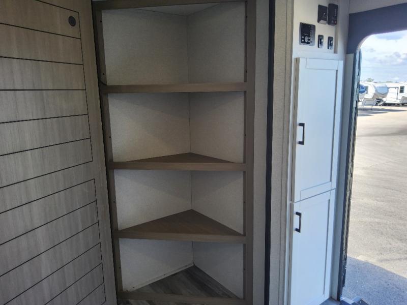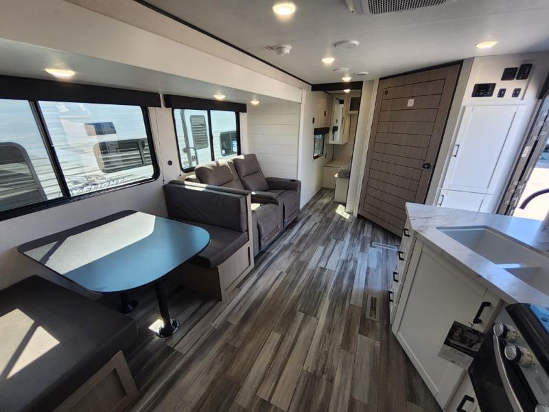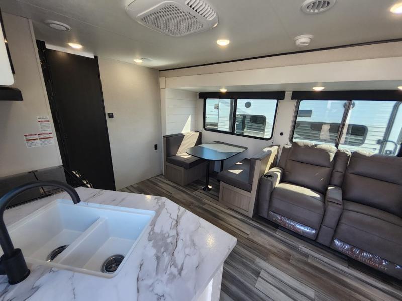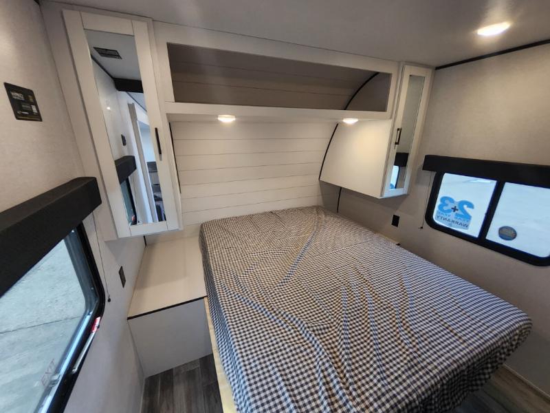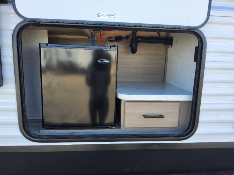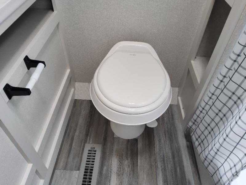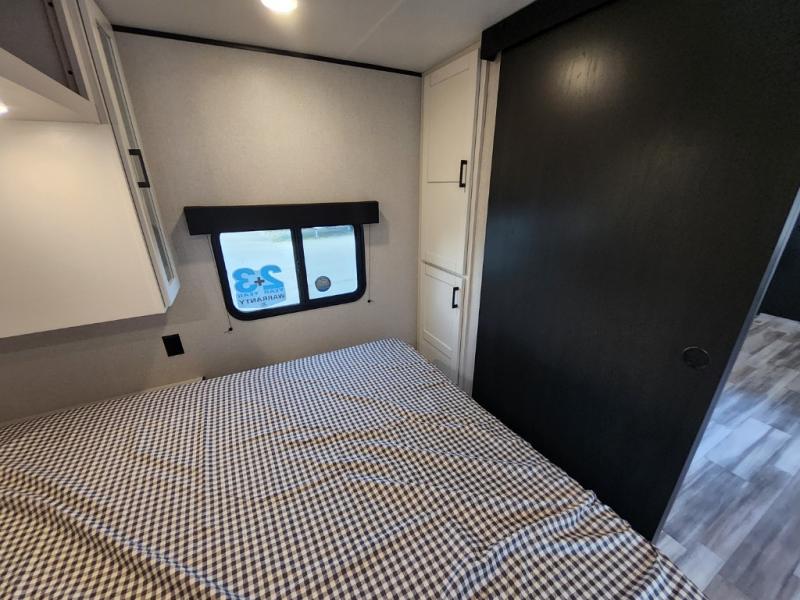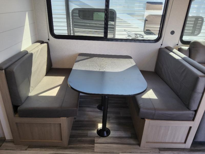 Camping trips just got a whole lot better in this spacious travel trailer for four! You'll love having a private bedroom up front with a queen bed and dual bedside wardrobes, while your guests sleep on the jack-knife sofa and booth dinette within the large slide out. There is a fully-equipped kitchen to make meals each day, plus a hidden pantry with shelves for games and a second pantry to keep snacks stocked. The full rear bath is both spacious and convenient since it's tuck away in the back. Start camping today!