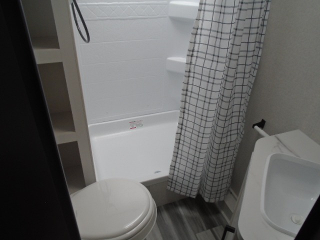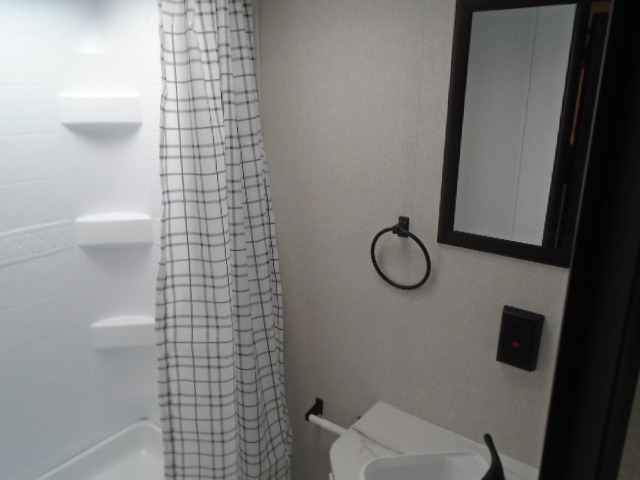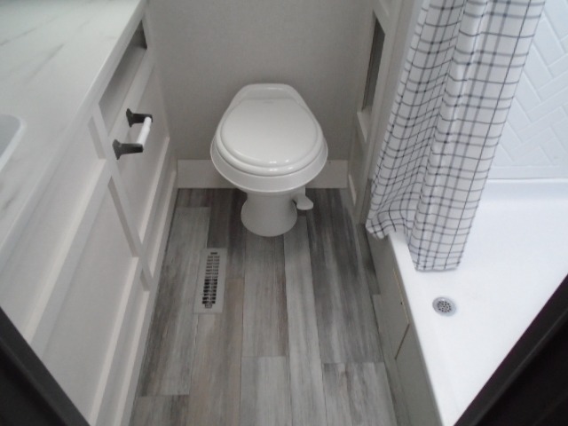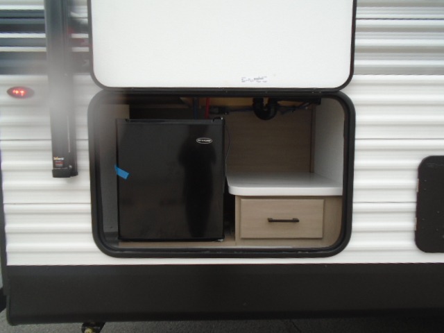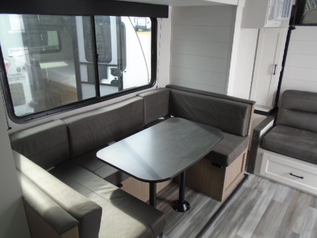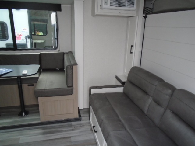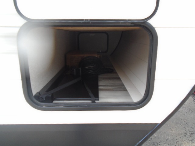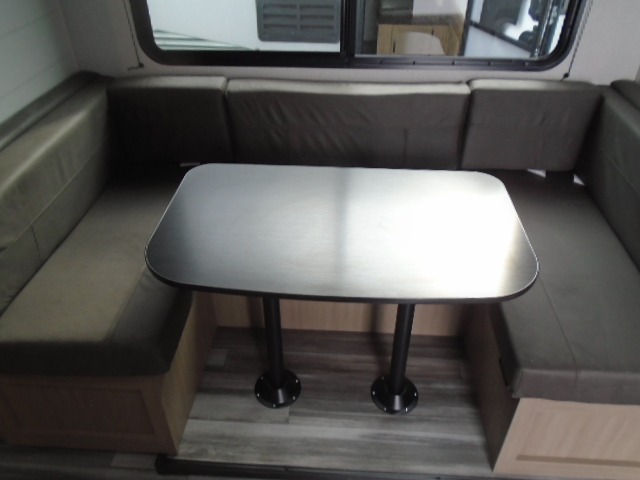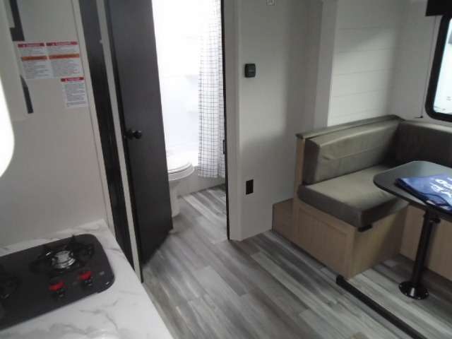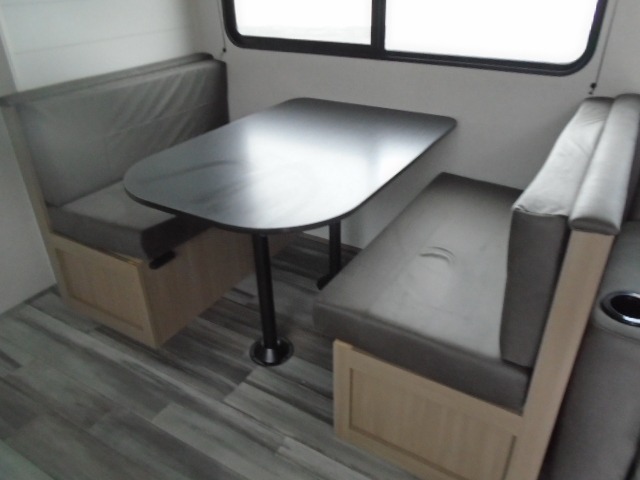 Camping trips just got a whole lot better in this spacious travel trailer for four! You'll love having a private bedroom up front with a queen bed and dual bedside wardrobes, while your guests sleep on the jack-knife sofa and booth dinette within the large slide out. There is a fully-equipped kitchen to make meals each day, plus a hidden pantry with shelves for games and a second pantry to keep snacks stocked. The full rear bath is both spacious and convenient since it's tuck away in the back. Start camping today!