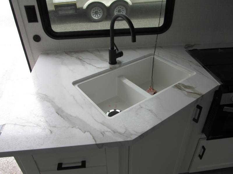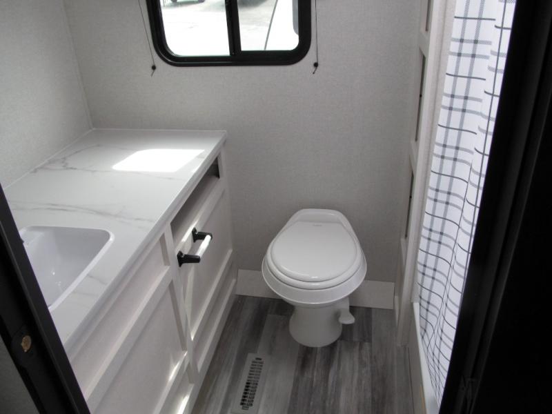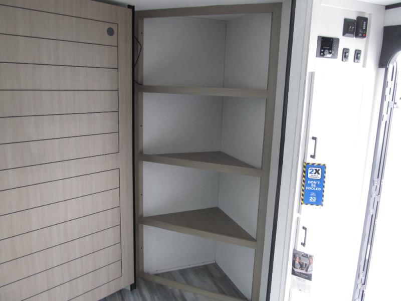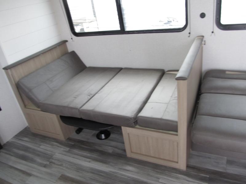 Camping trips just got a whole lot better in this spacious travel trailer for four! You'll love having a private bedroom up front with a queen bed and dual bedside wardrobes, while your guests sleep on the jack-knife sofa and booth dinette within the large slide out. There is a fully-equipped kitchen to make meals each day, plus a hidden pantry with shelves for games and a second pantry to keep snacks stocked. The full rear bath is both spacious and convenient since it's tuck away in the back. Start camping today!