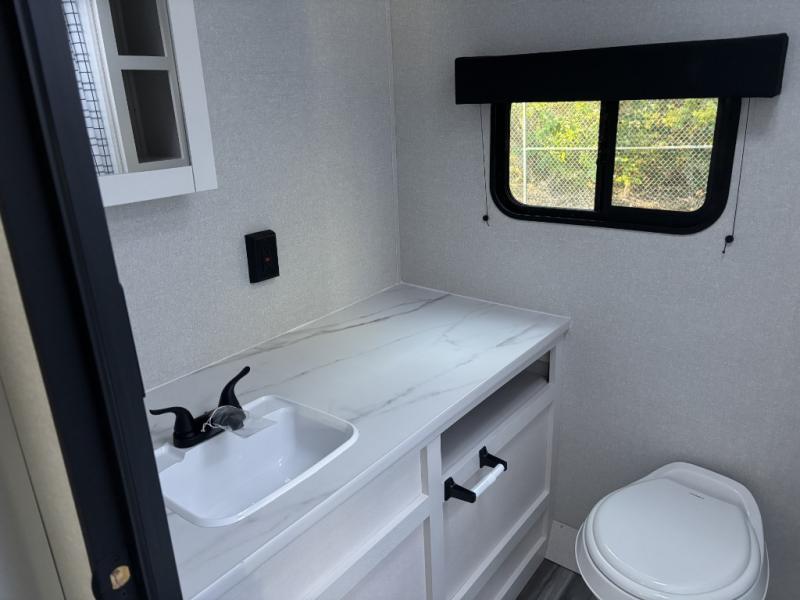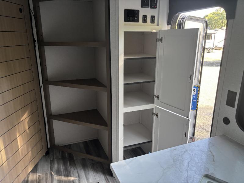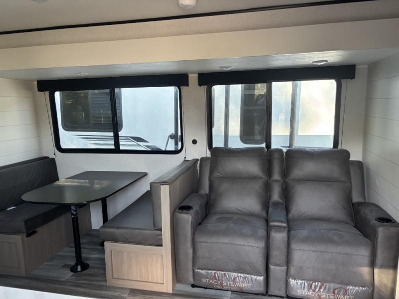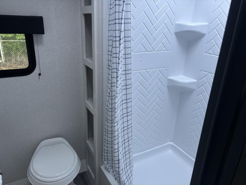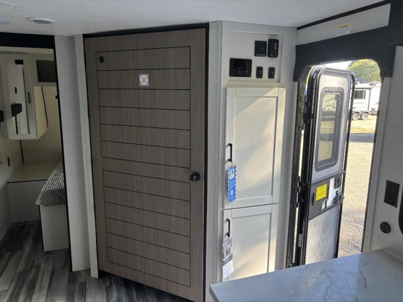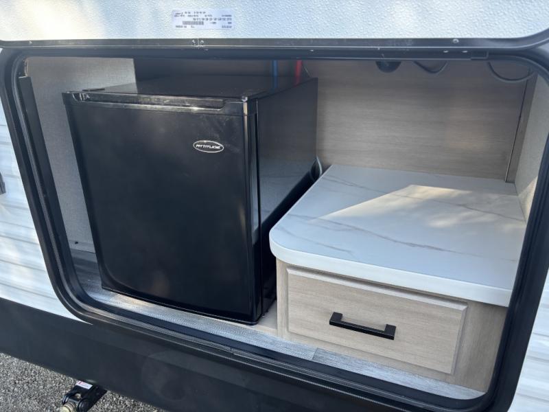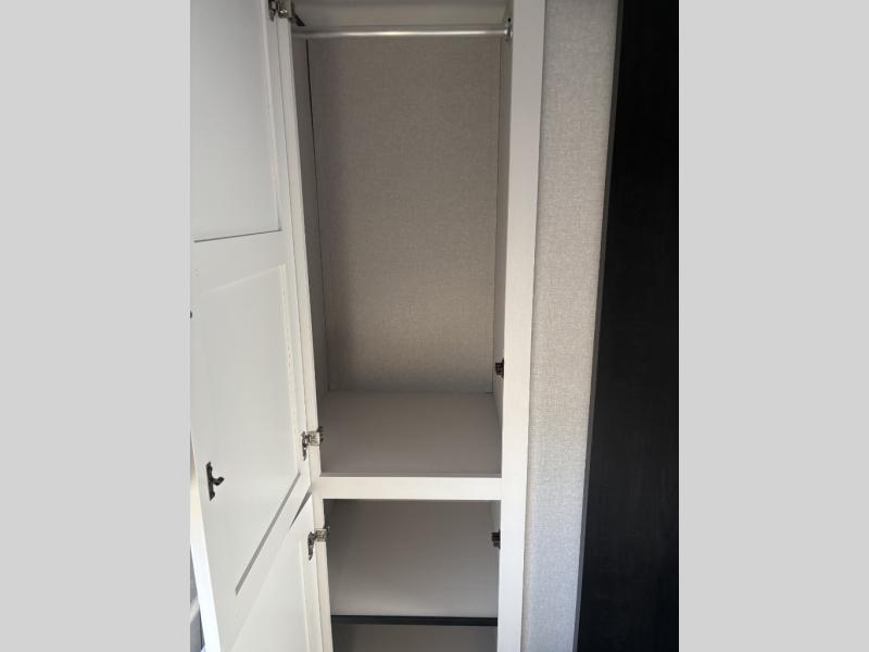 Camping trips just got a whole lot better in this spacious travel trailer for four! You'll love having a private bedroom up front with a queen bed and dual bedside wardrobes, while your guests sleep on the jack-knife sofa and booth dinette within the large slide out. There is a fully-equipped kitchen to make meals each day, plus a hidden pantry with shelves for games and a second pantry to keep snacks stocked. The full rear bath is both spacious and convenient since it's tuck away in the back. Start camping today!
