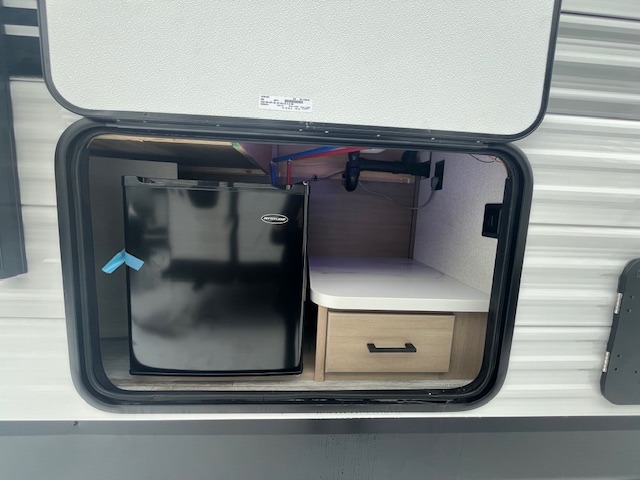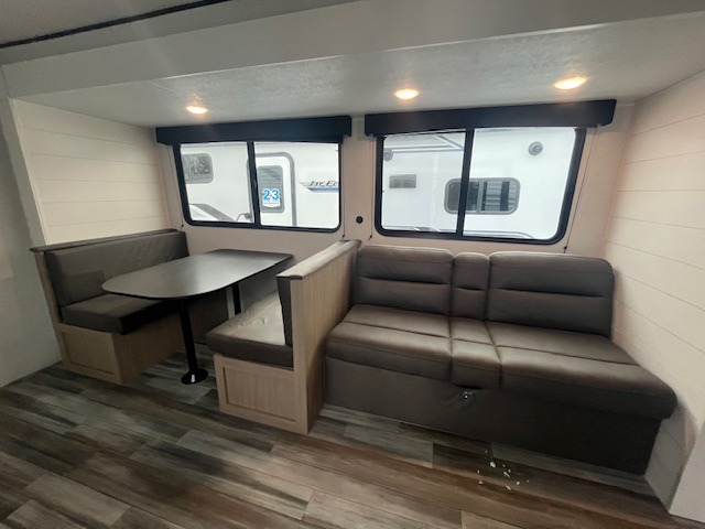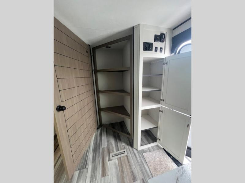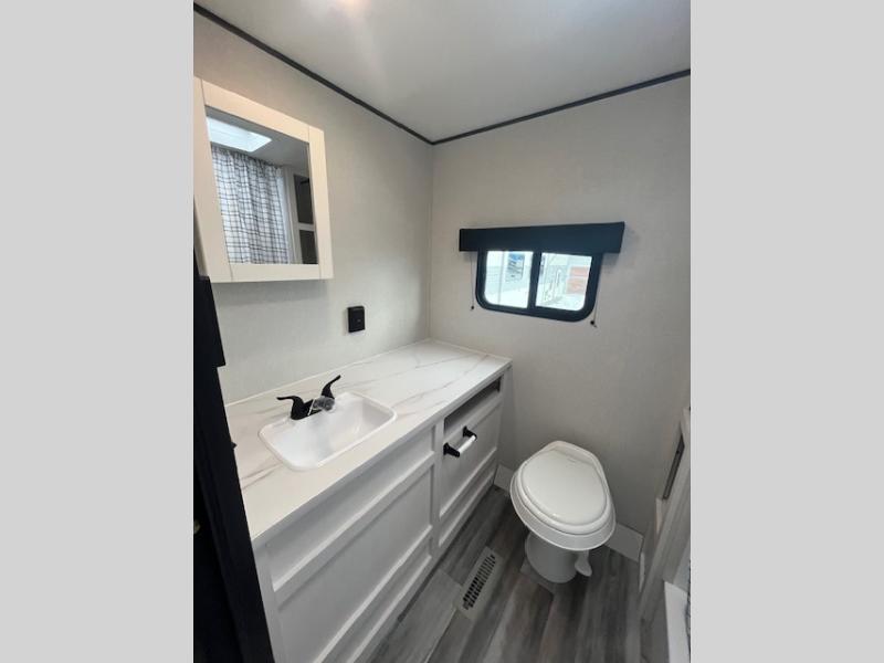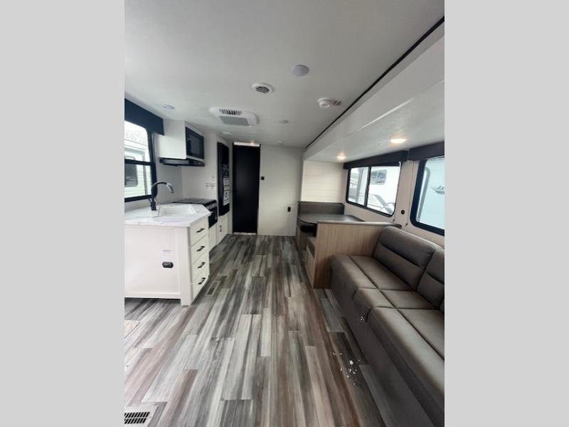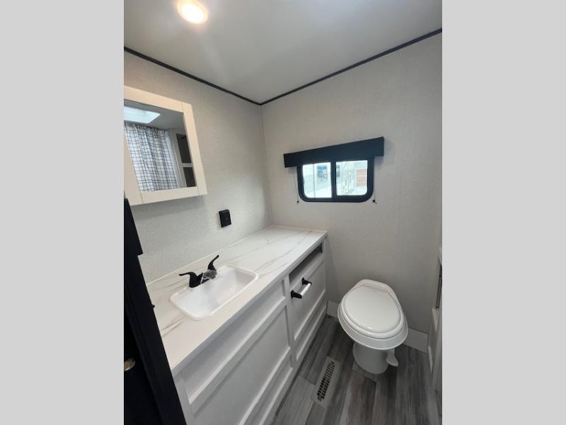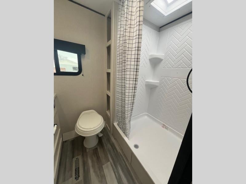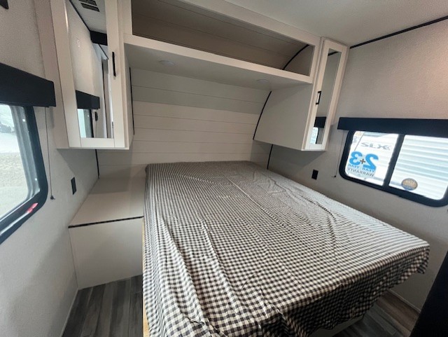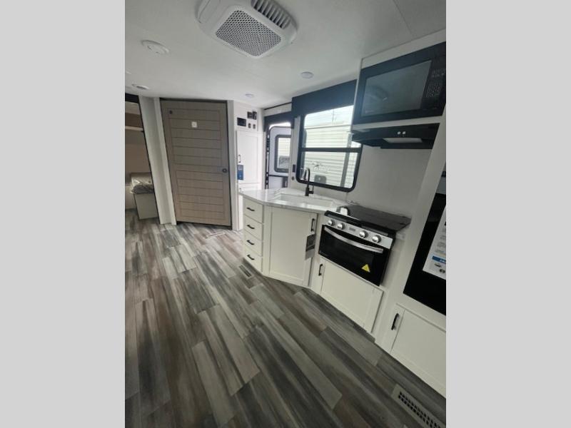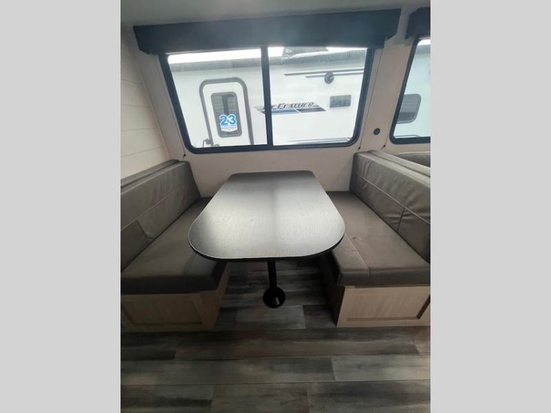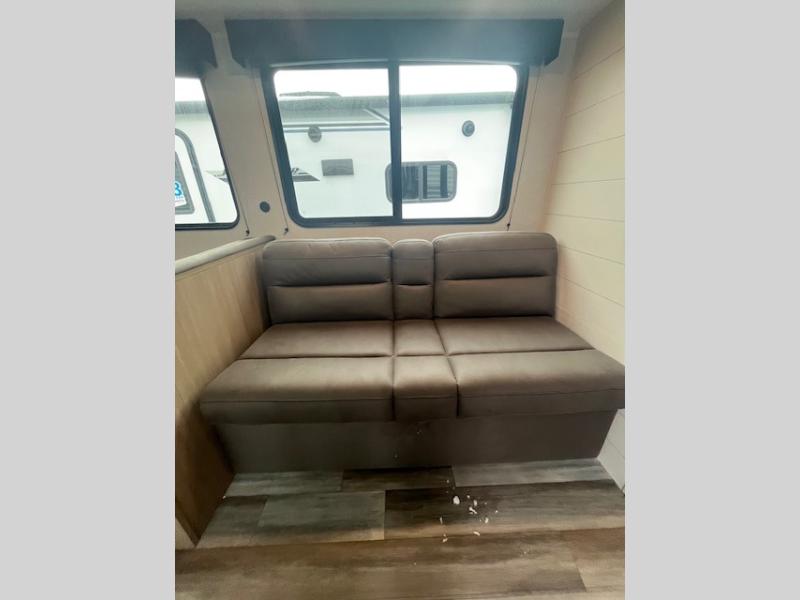 Camping trips just got a whole lot better in this spacious travel trailer for four! You'll love having a private bedroom up front with a queen bed and dual bedside wardrobes, while your guests sleep on the jack-knife sofa and booth dinette within the large slide out. There is a fully-equipped kitchen to make meals each day, plus a hidden pantry with shelves for games and a second pantry to keep snacks stocked. The full rear bath is both spacious and convenient since it's tuck away in the back. Start camping today!