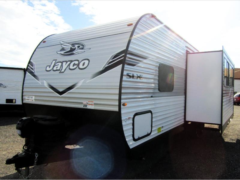 The Jayco Jay Flight SLX travel trailer is quite easy to own because it is lightweight for an easier towing experience. Built on a fully integrated A-frame with galvanized-steel, impact-resistant wheel wells, the Jay Flight SLX has quality at its very foundation. That quality continues on to the electric self-adjusting brakes, easy-lube hubs, Magnum Truss roof system, and LP quick connect. Some of what the mandatory Customer Value Package includes is backup camera prep, Keyed-Alike entry and baggage doors, and an on-demand tankless water heater.