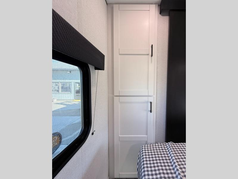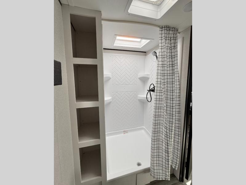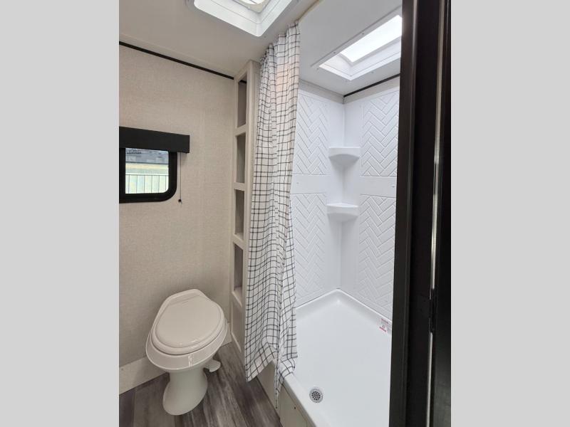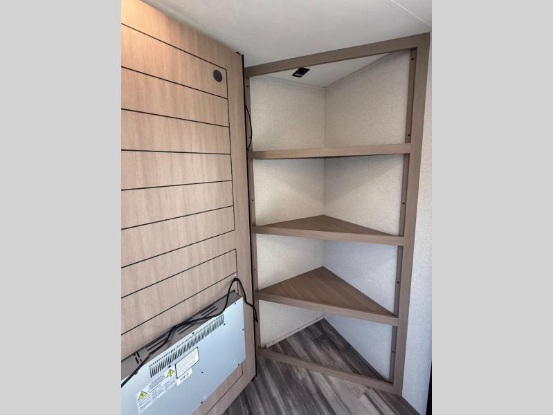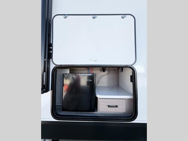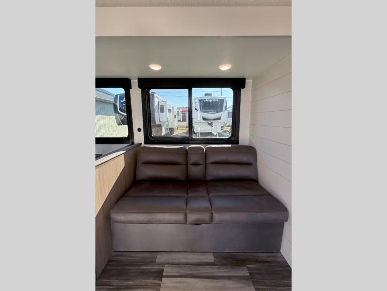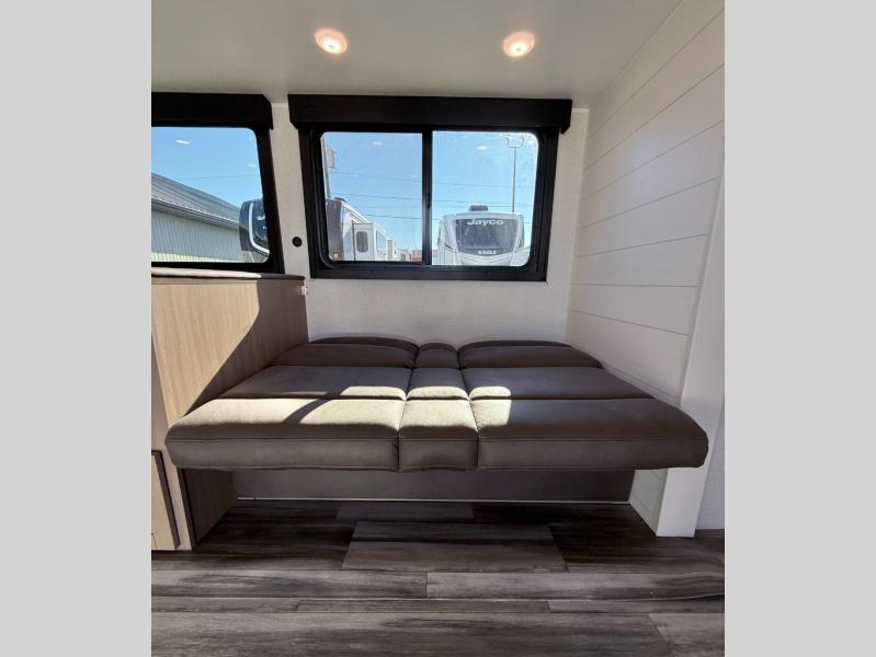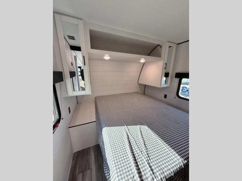 Camping trips just got a whole lot better in this spacious travel trailer for four! You'll love having a private bedroom up front with a queen bed and dual bedside wardrobes, while your guests relax on the theater seats and booth dinette within the large slide out. There is a fully-equipped kitchen to make meals each day, plus a hidden pantry with shelves for games and a second pantry to keep snacks stocked. The full rear bath is both spacious and convenient since it's tuck away in the back. Start camping today!