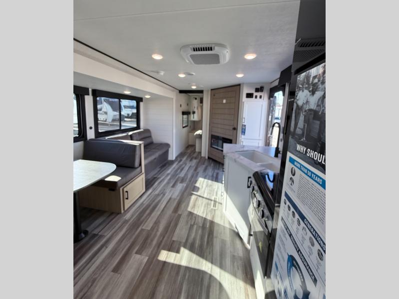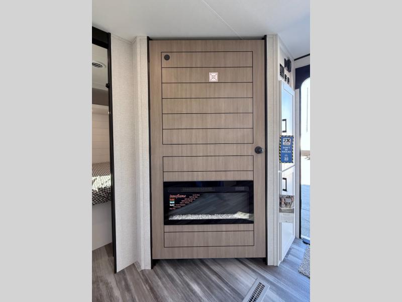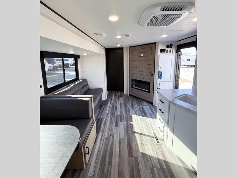 With Upgrade Fiberglass Elite Package & 15K A/C. Fireplace, Full Rear Bath, Private Queen Bedroom, Booth Dinette, Jackknife Sofa, Hidden Pantry, On Demand Water Heater, Outdoor Kitchen and Shower, Dual Axle, Power Awning, Power Tongue Jack & Spare Tire