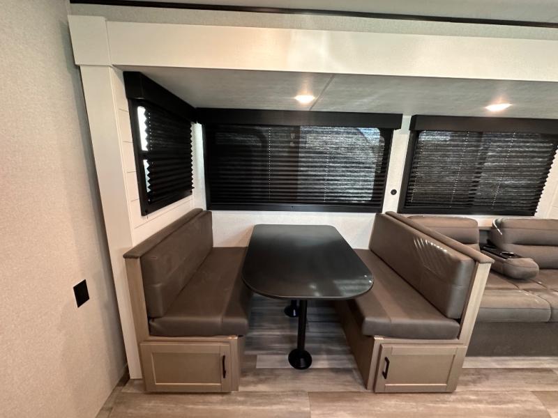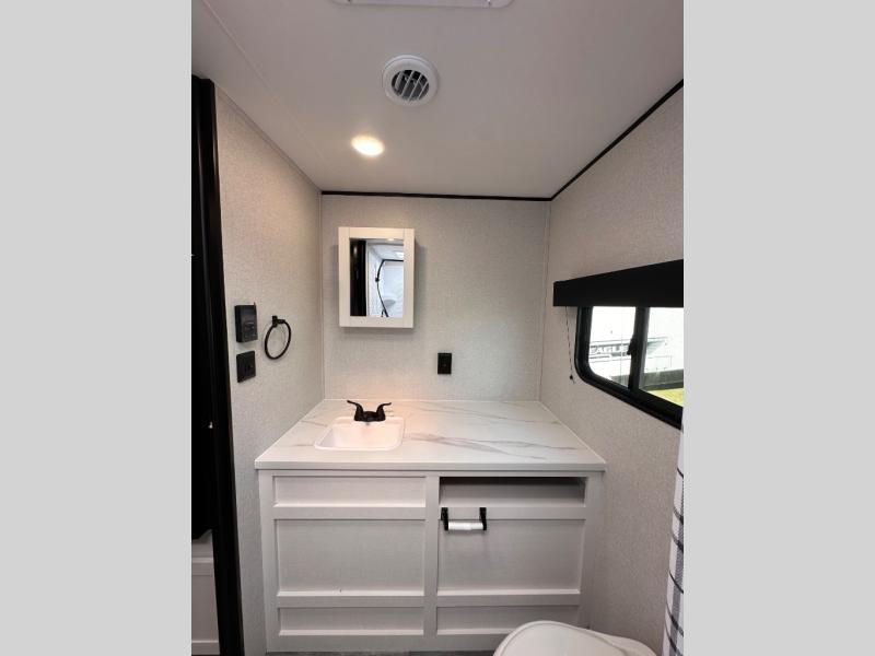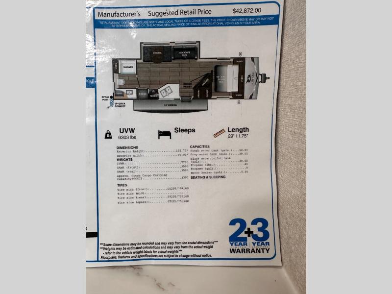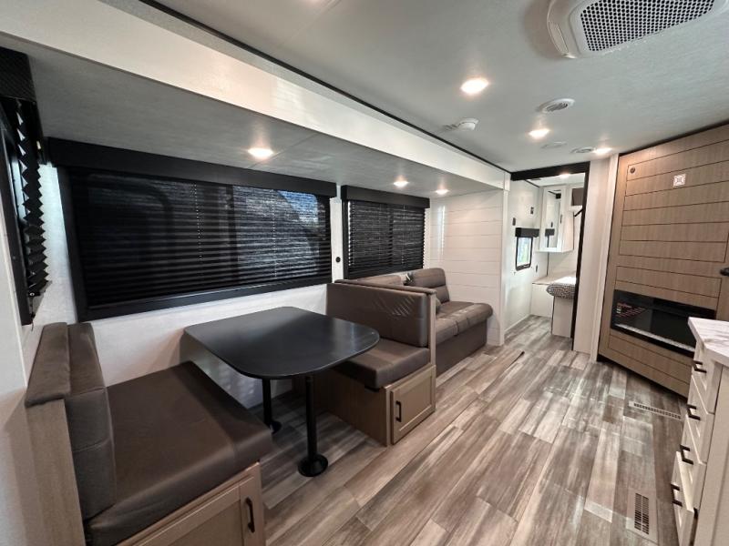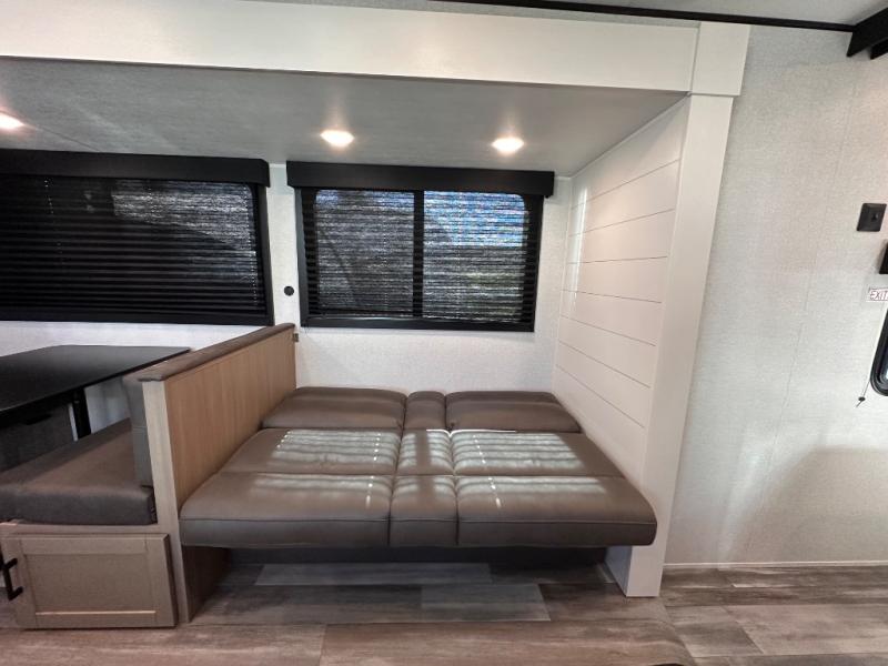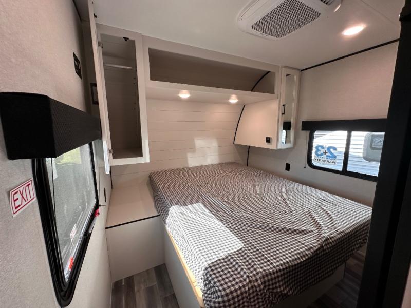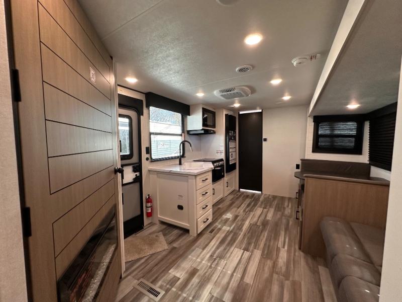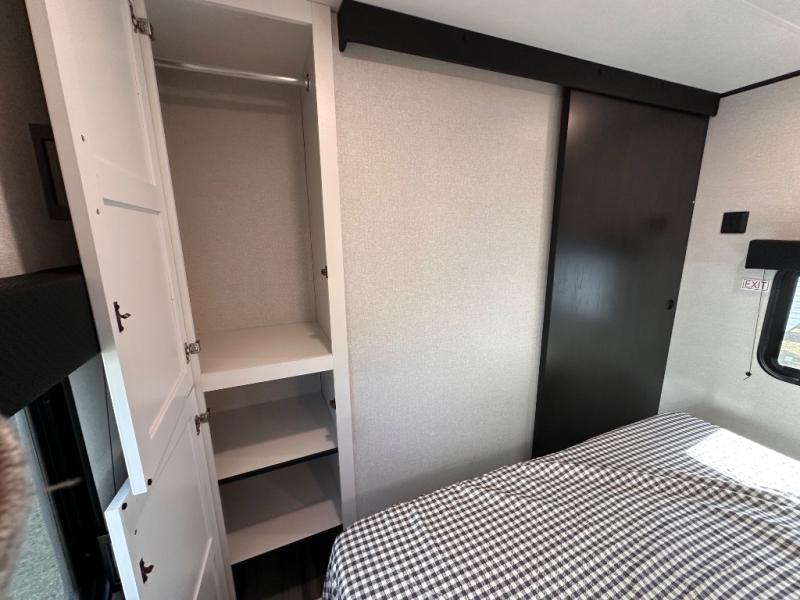 Camping trips just got a whole lot better in this spacious travel trailer for four! You'll love having a private bedroom up front with a queen bed and dual bedside wardrobes, while your guests sleep on the jack-knife sofa and booth dinette within the large slide out. There is a fully-equipped kitchen to make meals each day, plus a hidden pantry with shelves for games and a second pantry to keep snacks stocked. The full rear bath is both spacious and convenient since it's tuck away in the back. Start camping today!