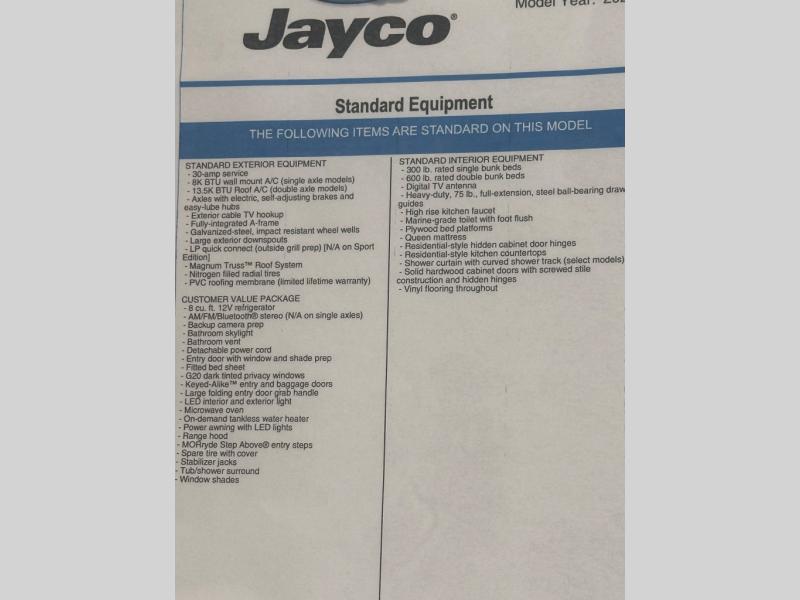 The Jayco Jay Flight SLX travel trailer is quite easy to own because it is lightweight for an easier towing experience. Built on a fully integrated A-frame with galvanized-steel, impact-resistant wheel wells, the Jay Flight SLX has quality at its very foundation. That quality continues on to the electric self-adjusting brakes, easy-lube hubs, Magnum Truss roof system, and LP quick connect. Some of what the mandatory Customer Value Package includes is backup camera prep, Keyed-Alike entry and baggage doors, and an on-demand tankless water heater.