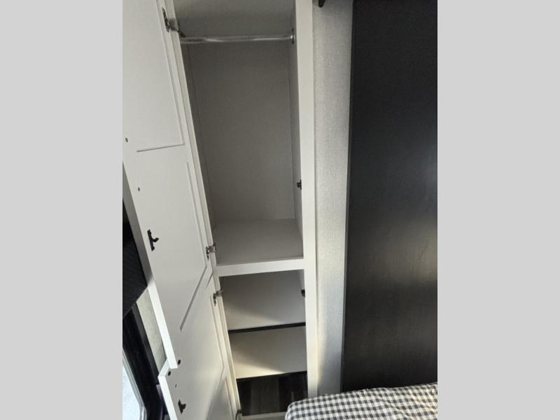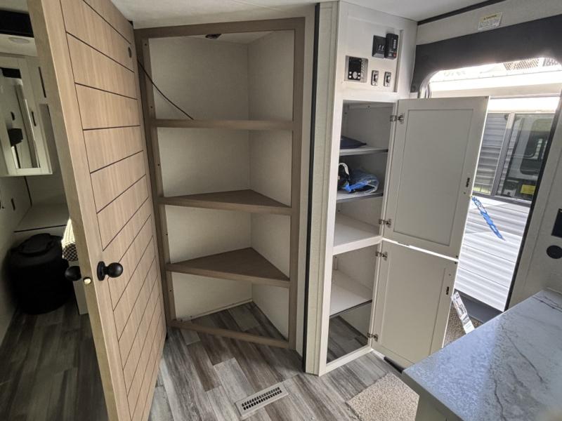 Camping trips just got a whole lot better in this spacious travel trailer for four! You'll love having a private bedroom up front with a queen bed and dual bedside wardrobes, while your guests sleep on the jack-knife sofa and booth dinette within the large slide out. There is a fully-equipped kitchen to make meals each day, plus a hidden pantry with shelves for games and a second pantry to keep snacks stocked. The full rear bath is both spacious and convenient since it's tuck away in the back. Start camping today!