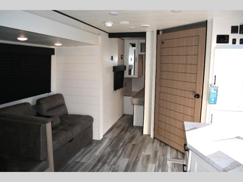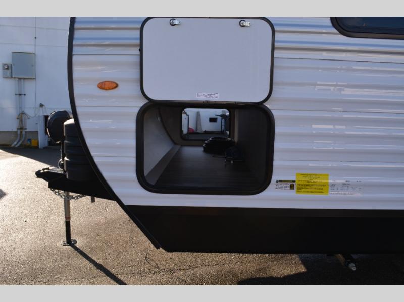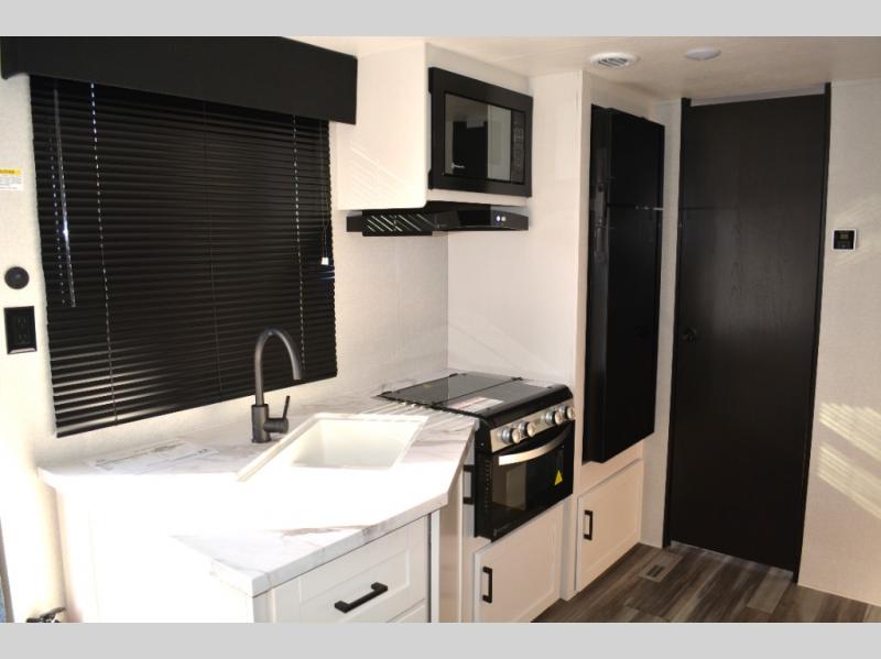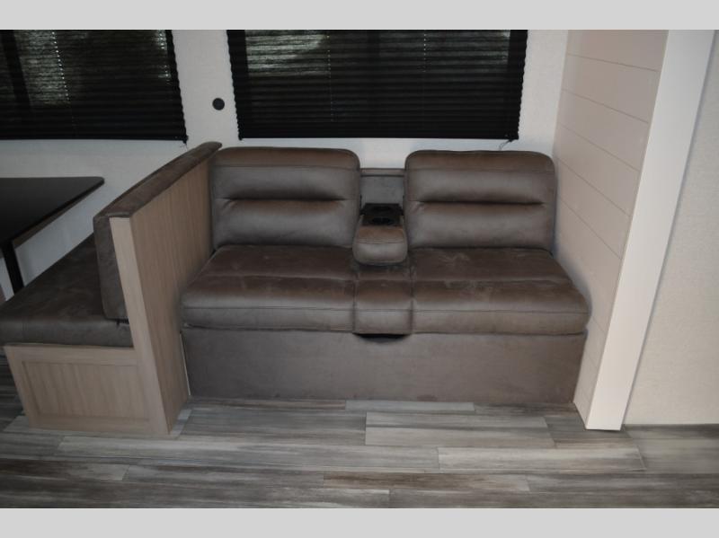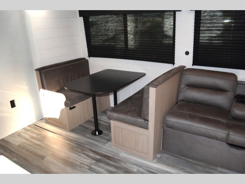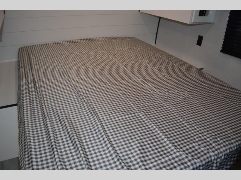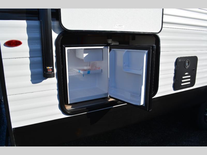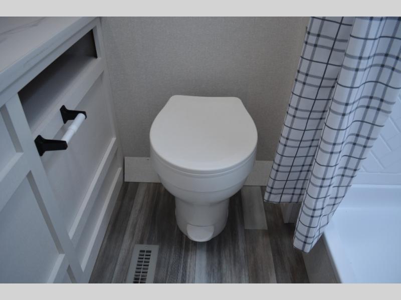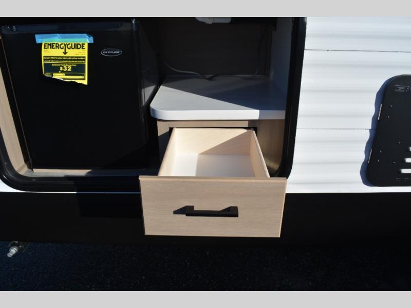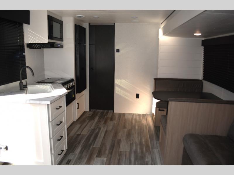 Camping trips just got a whole lot better in this spacious travel trailer for four! You'll love having a private bedroom up front with a queen bed and dual bedside wardrobes, while your guests sleep on the jack-knife sofa and booth dinette within the large slide out. There is a fully-equipped kitchen to make meals each day, plus a hidden pantry with shelves for games and a second pantry to keep snacks stocked. The full rear bath is both spacious and convenient since it's tuck away in the back. Start camping today!