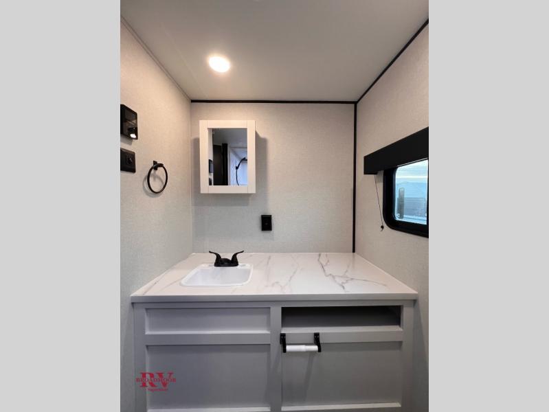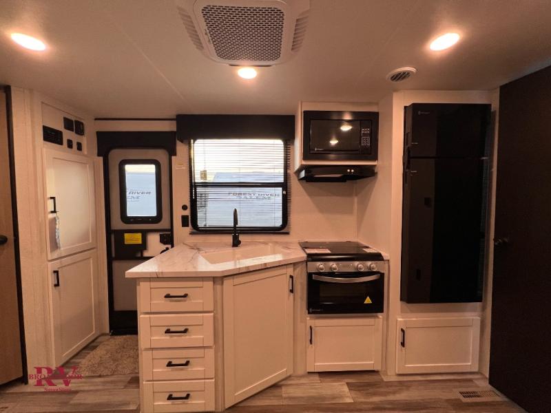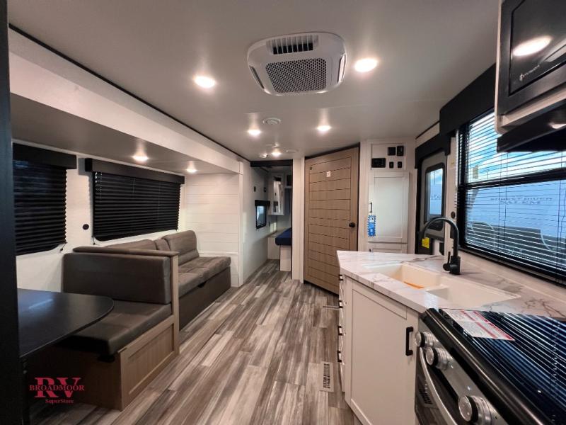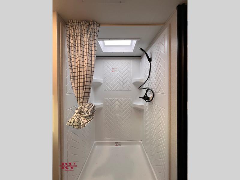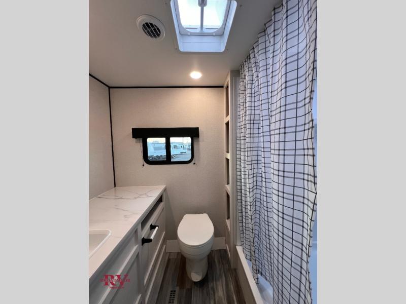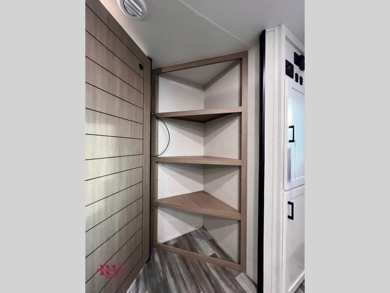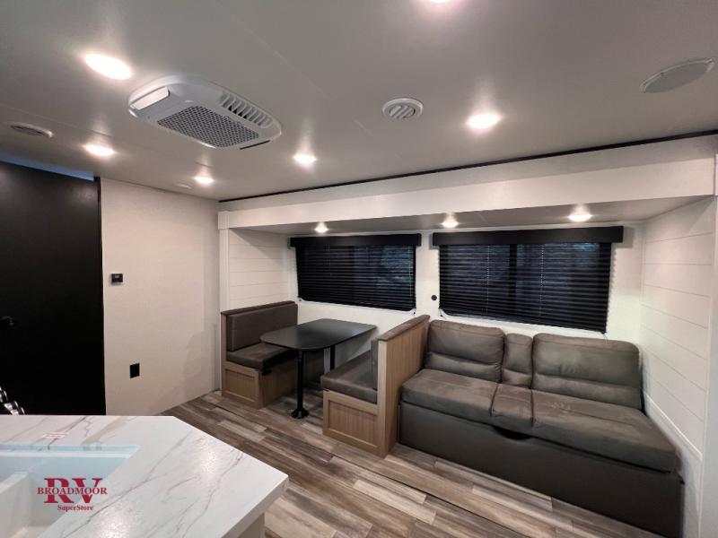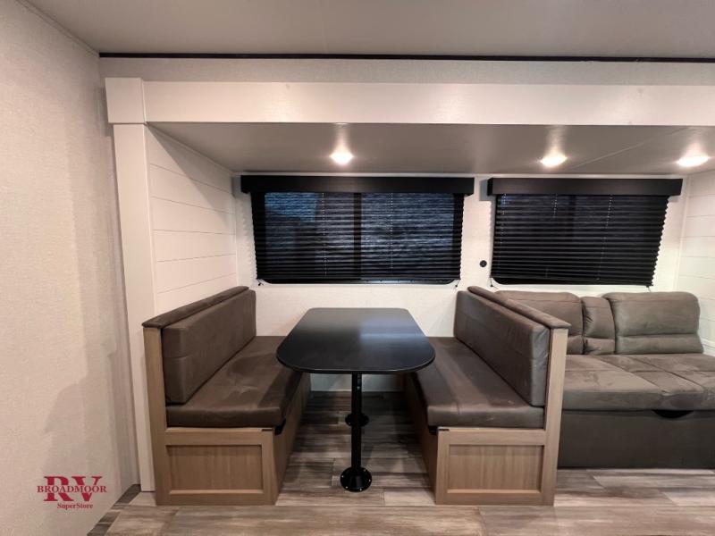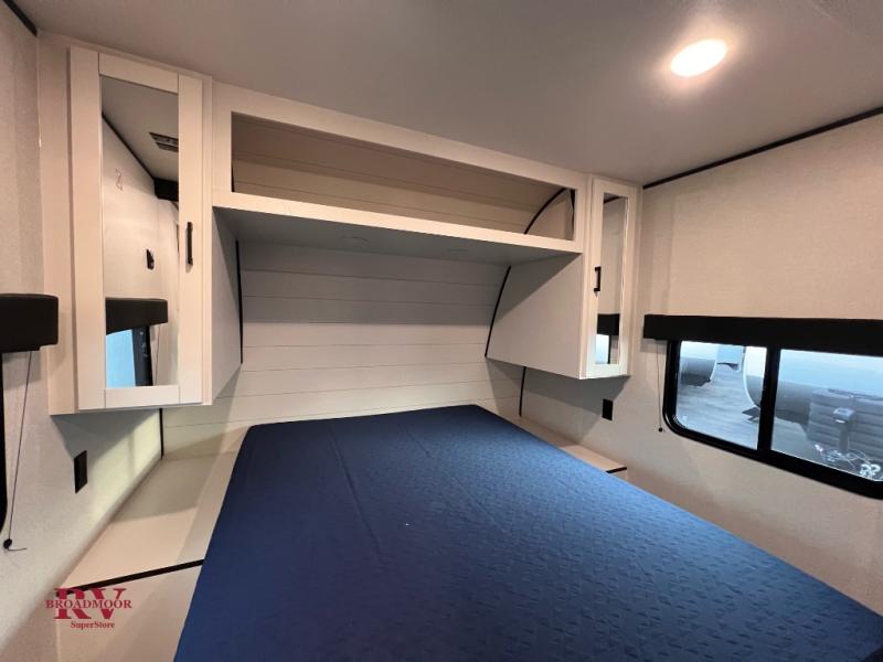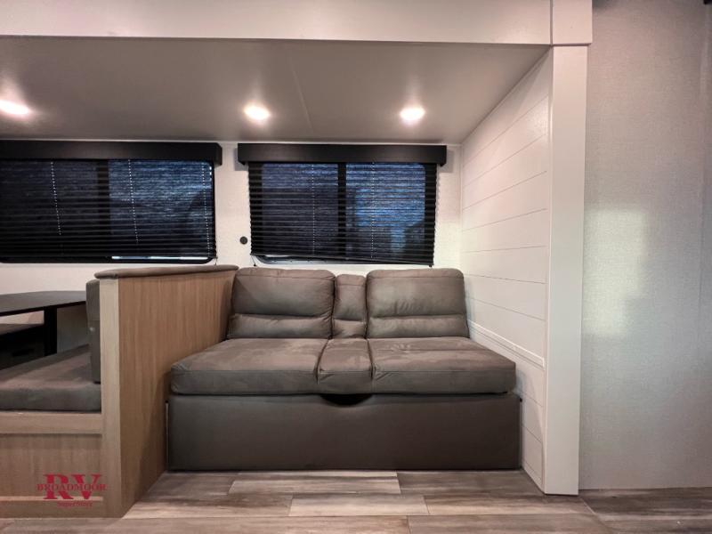 Camping trips just got a whole lot better in this spacious travel trailer for four! You'll love having a private bedroom up front with a queen bed and dual bedside wardrobes, while your guests sleep on the jack-knife sofa and booth dinette within the large slide out. There is a fully-equipped kitchen to make meals each day, plus a hidden pantry with shelves for games and a second pantry to keep snacks stocked. The full rear bath is both spacious and convenient since it's tuck away in the back. Start camping today!