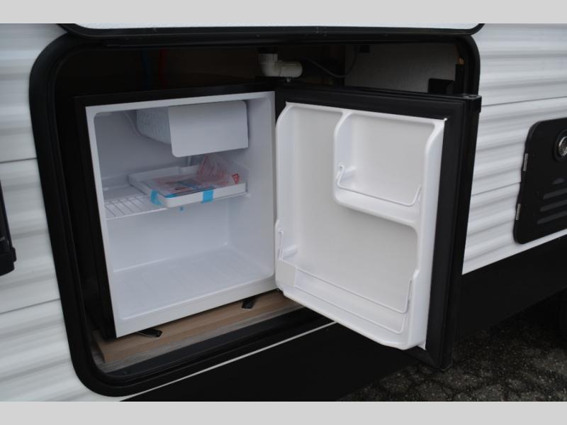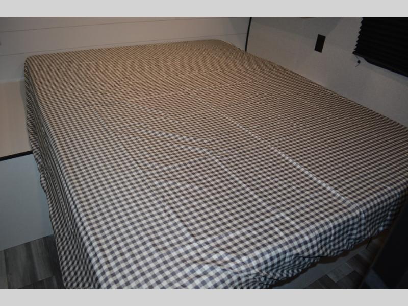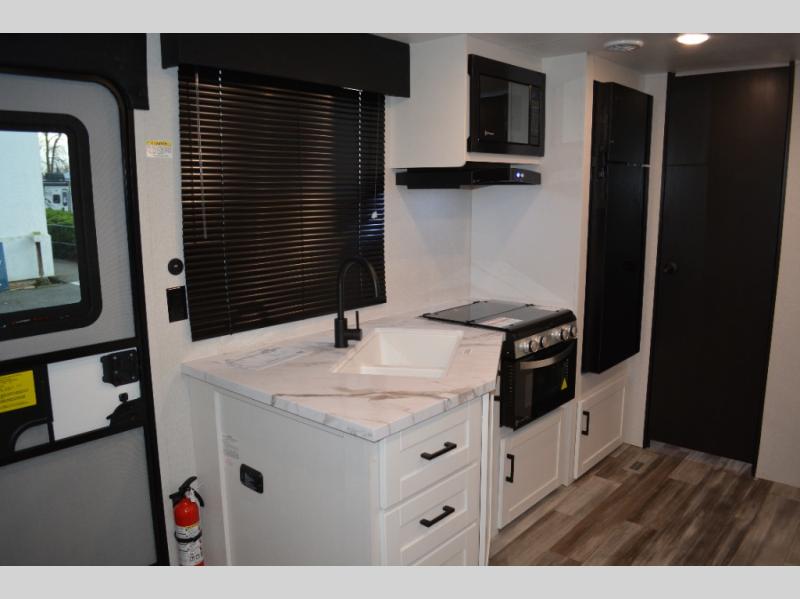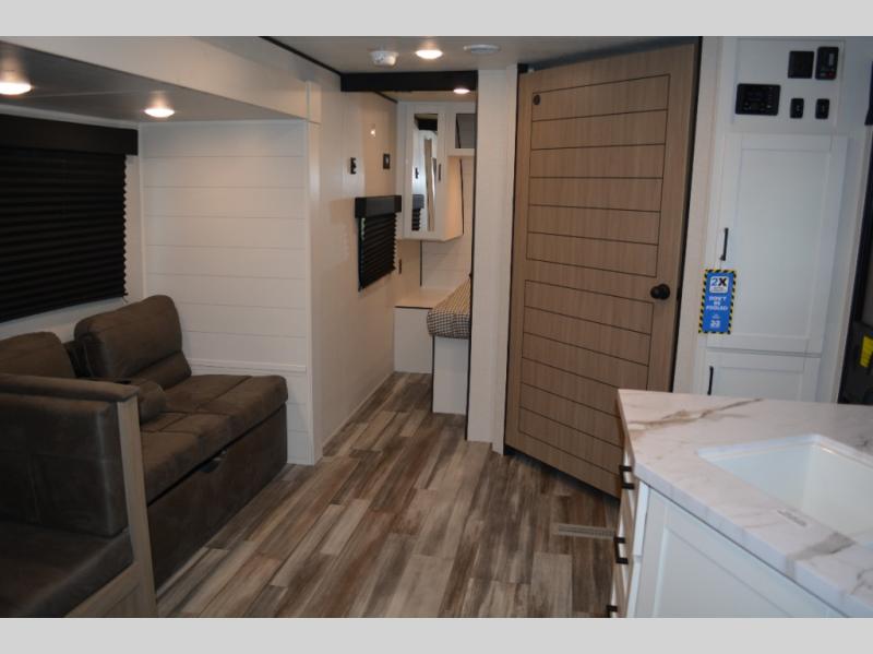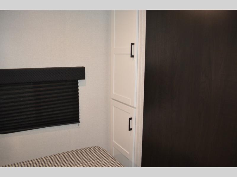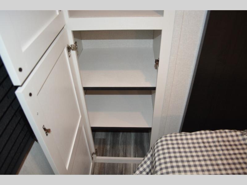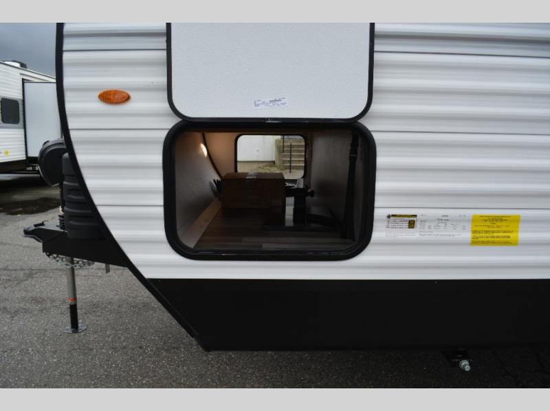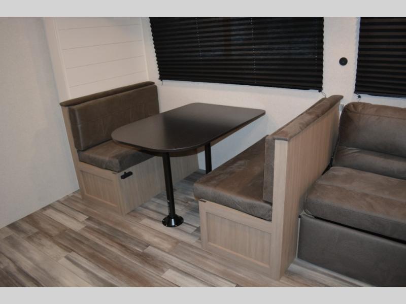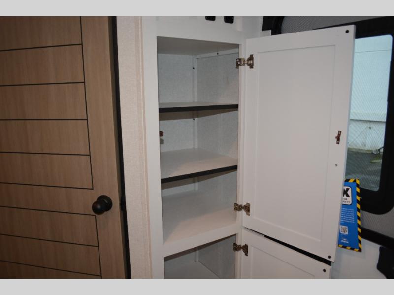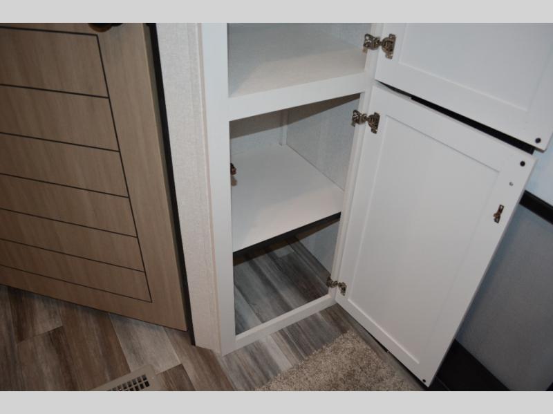 Camping trips just got a whole lot better in this spacious travel trailer for four! You'll love having a private bedroom up front with a queen bed and dual bedside wardrobes, while your guests sleep on the jack-knife sofa and booth dinette within the large slide out. There is a fully-equipped kitchen to make meals each day, plus a hidden pantry with shelves for games and a second pantry to keep snacks stocked. The full rear bath is both spacious and convenient since it's tuck away in the back. Start camping today!