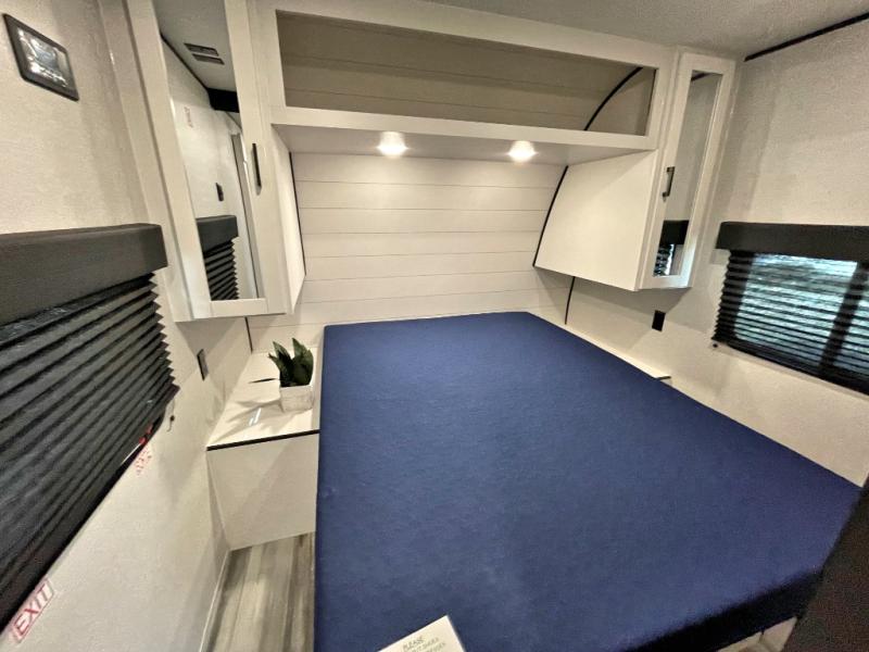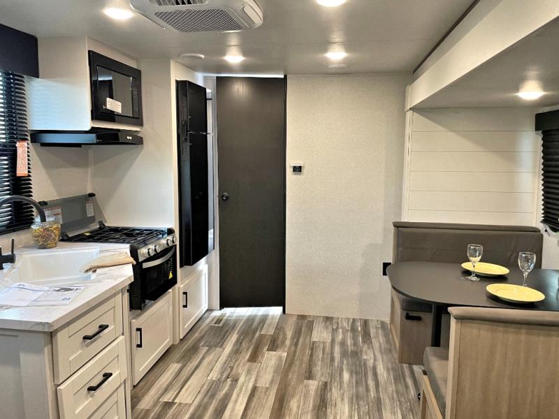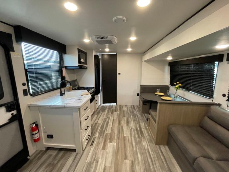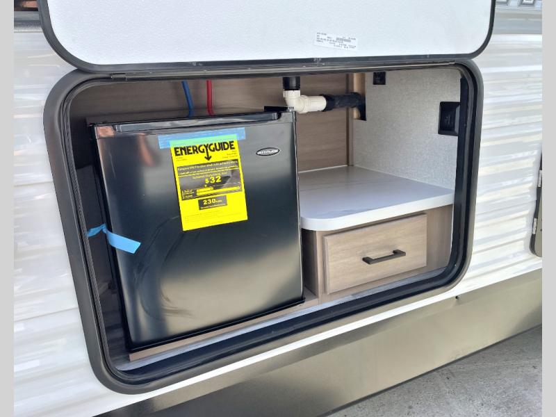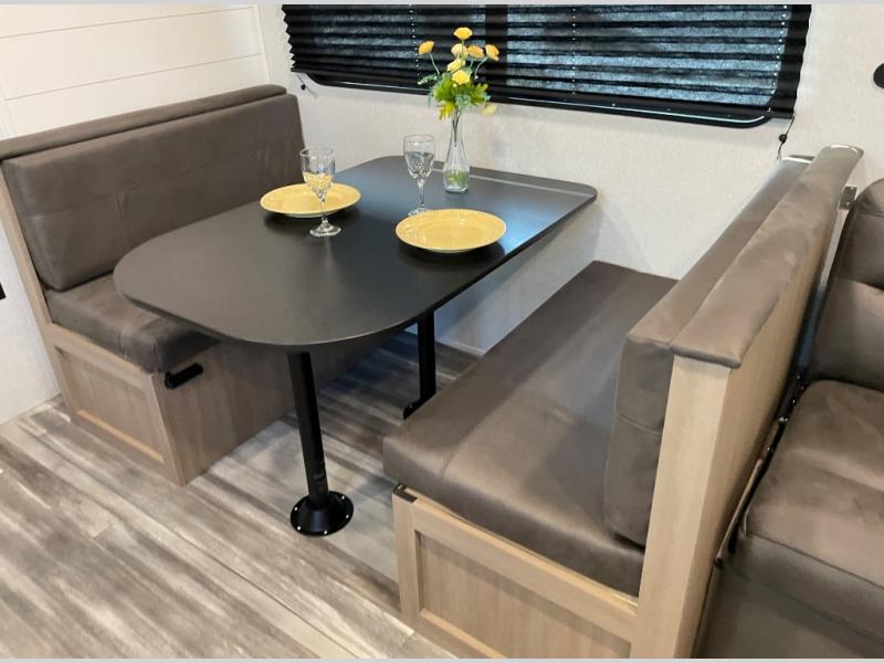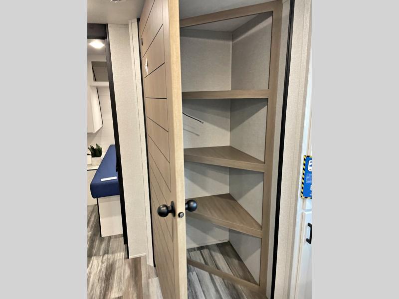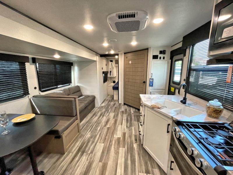 Camping trips just got a whole lot better in this spacious travel trailer for four! You'll love having a private bedroom up front with a queen bed and dual bedside wardrobes, while your guests sleep on the jack-knife sofa and booth dinette within the large slide out. There is a fully-equipped kitchen to make meals each day, plus a hidden pantry with shelves for games and a second pantry to keep snacks stocked. The full rear bath is both spacious and convenient since it's tuck away in the back. Start camping today!