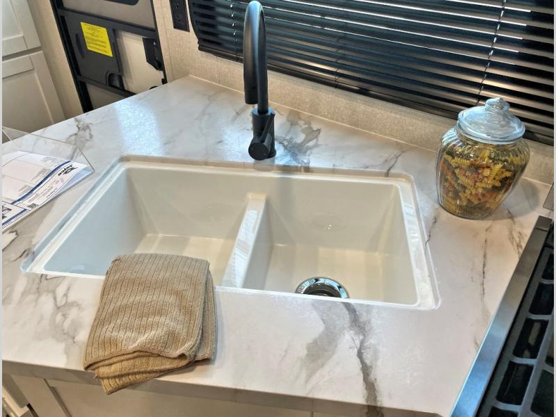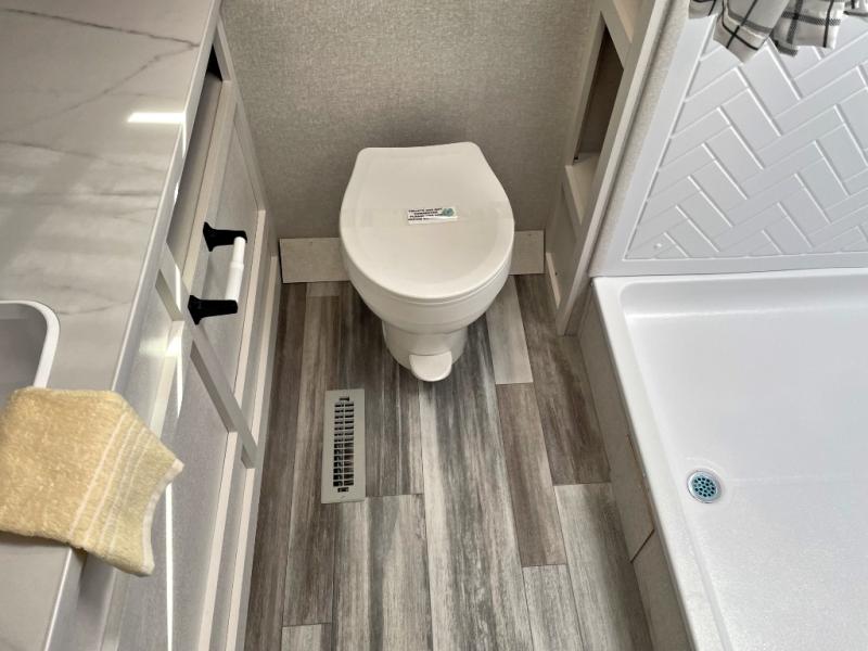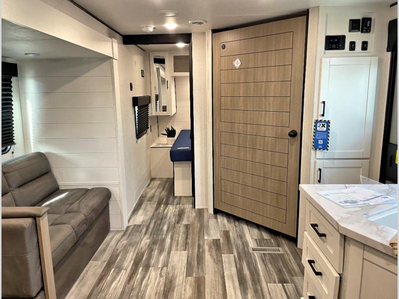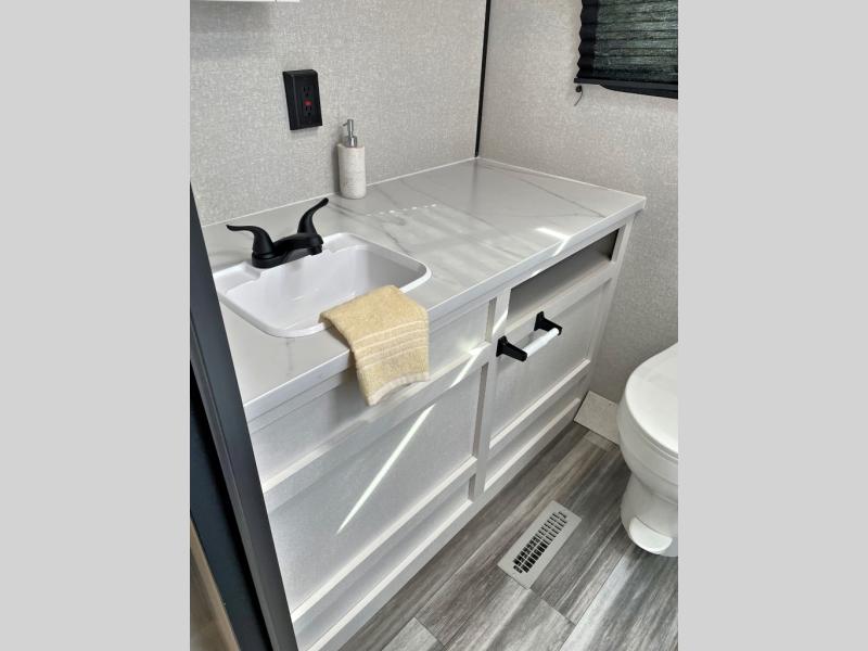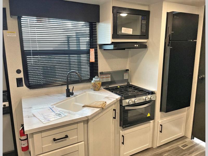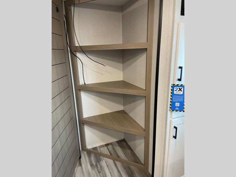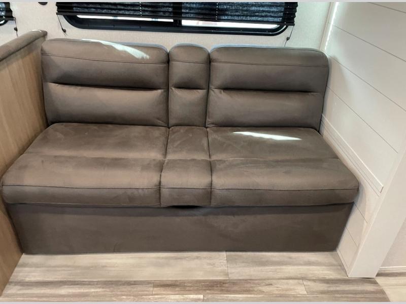 Camping trips just got a whole lot better in this spacious travel trailer for four! You'll love having a private bedroom up front with a queen bed and dual bedside wardrobes, while your guests sleep on the jack-knife sofa and booth dinette within the large slide out. There is a fully-equipped kitchen to make meals each day, plus a hidden pantry with shelves for games and a second pantry to keep snacks stocked. The full rear bath is both spacious and convenient since it's tuck away in the back. Start camping today!