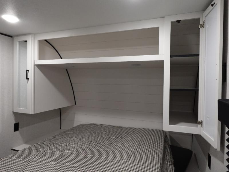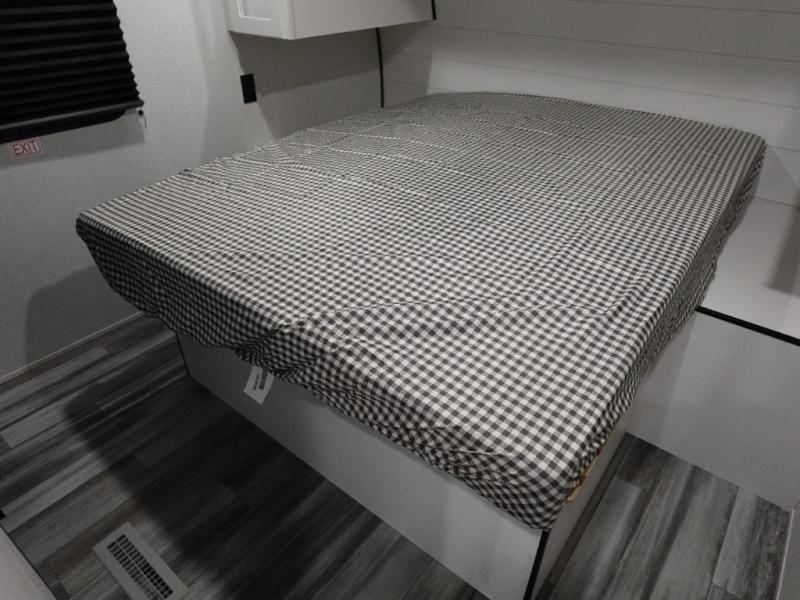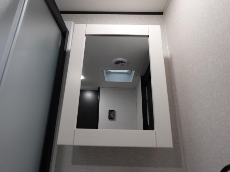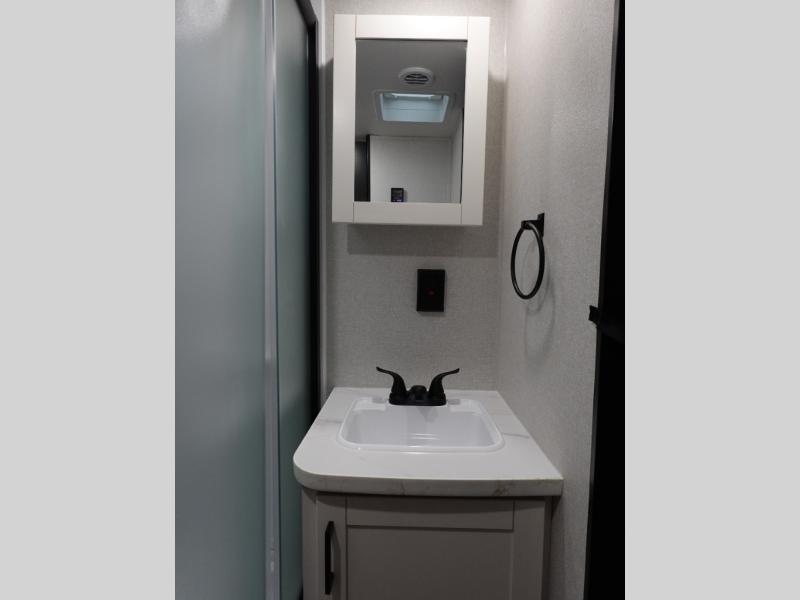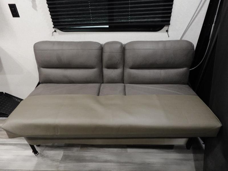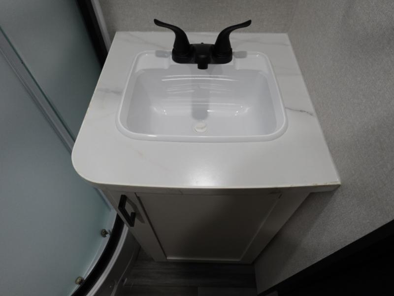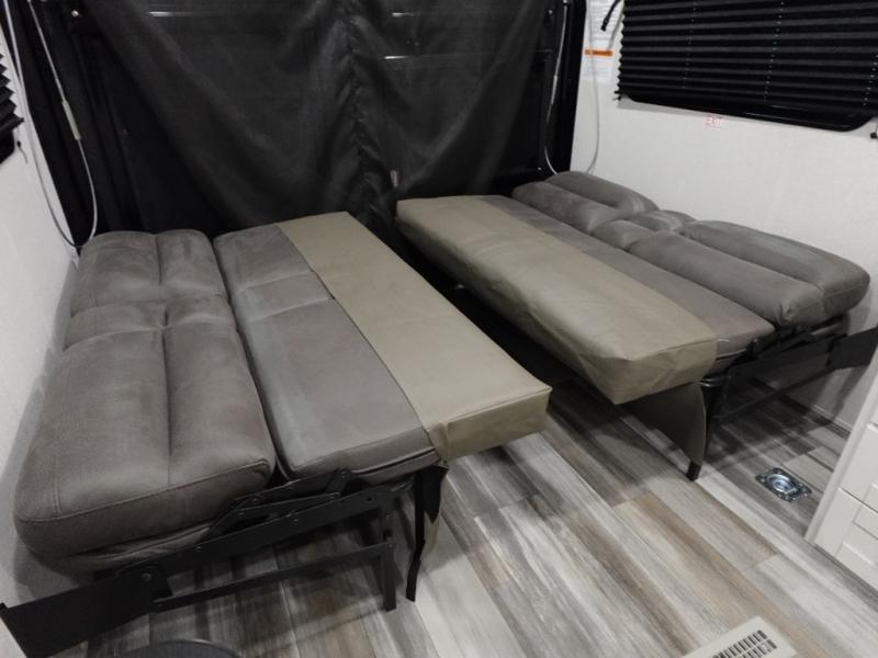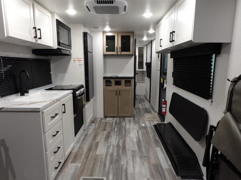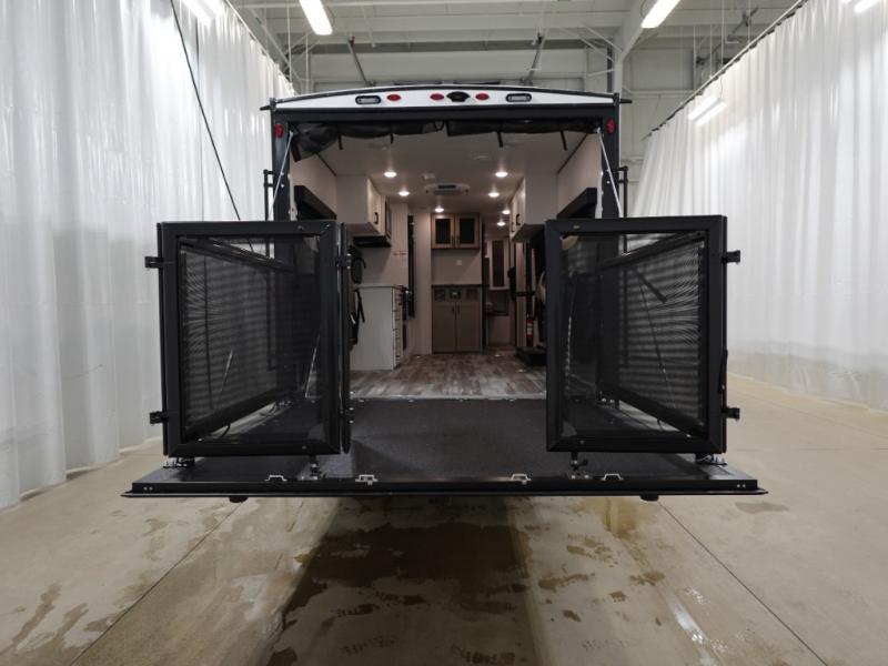 When you are ready to ride your off-road toys, relax in the great outdoors and unwind after a ride and do it all over again the next day, then load up and head to the campsite! You will have 5' 11" of cargo space plus a little more space in between the kitchen amenities and the flip-up bar top with stools to load more gear and such. The 7' 3" opening and 7' ramp door makes unloading easy as well. The convertible sofas and removable table allow more to dine, and the double entry bathroom will keep everyone clean before bedtime. The front bedroom offers privacy for the owners, and comfortable nights on a queen bed. And the power awning offers shade during the daytime when you want to relax outside.