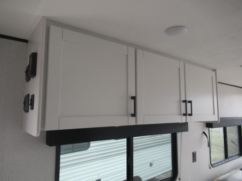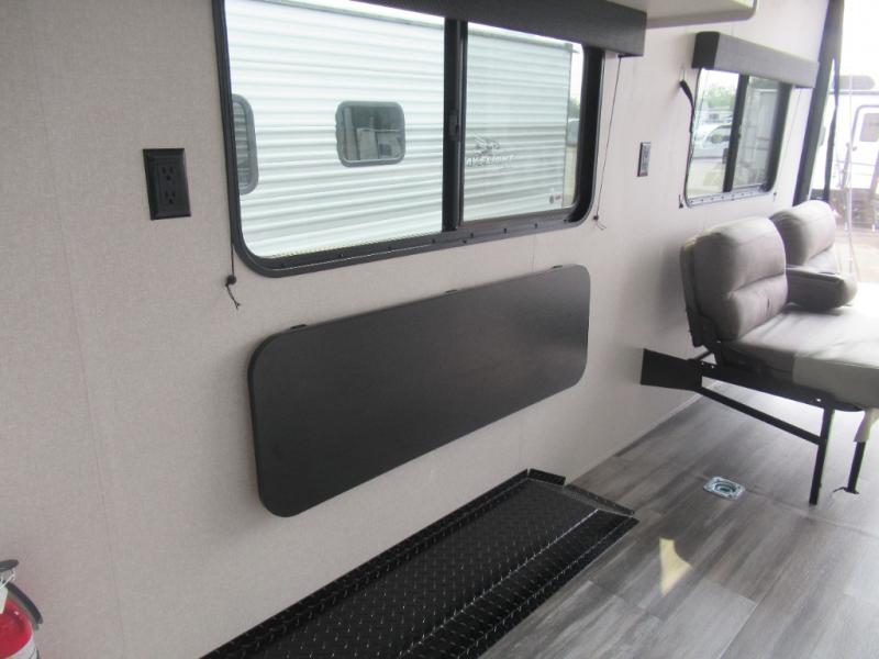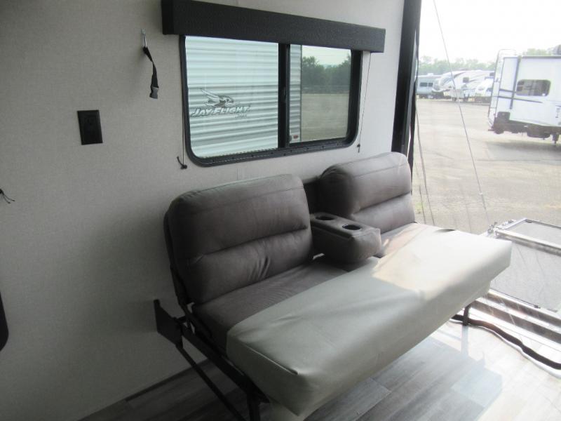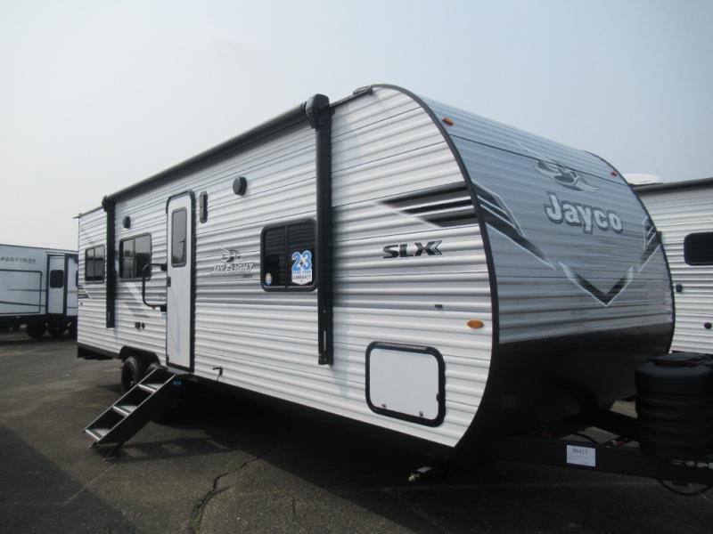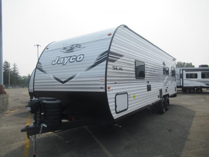 The Jayco Jay Flight SLX toy hauler travel trailer is quite easy to own because it is lightweight for an easier towing experience. Built on a fully integrated A-frame with galvanized-steel, impact-resistant wheel wells, the Jay Flight SLX has quality at its very foundation. That quality continues on to the electric self-adjusting brakes, easy-lube hubs, Magnum Truss roof system, and LP quick connect. Some of what the mandatory Customer Value Package includes is backup camera prep, Keyed-Alike entry and baggage doors, and an on-demand tankless water heater.