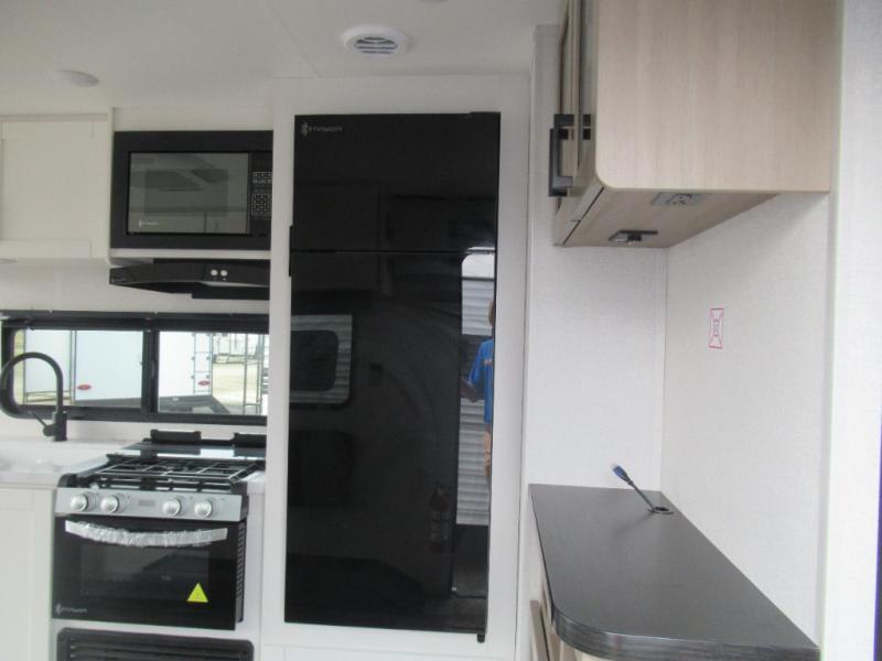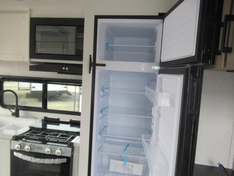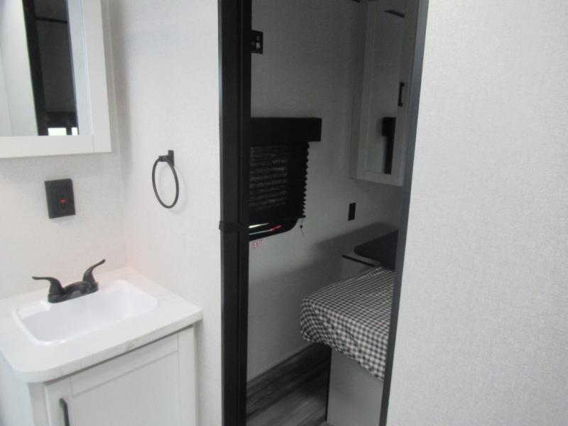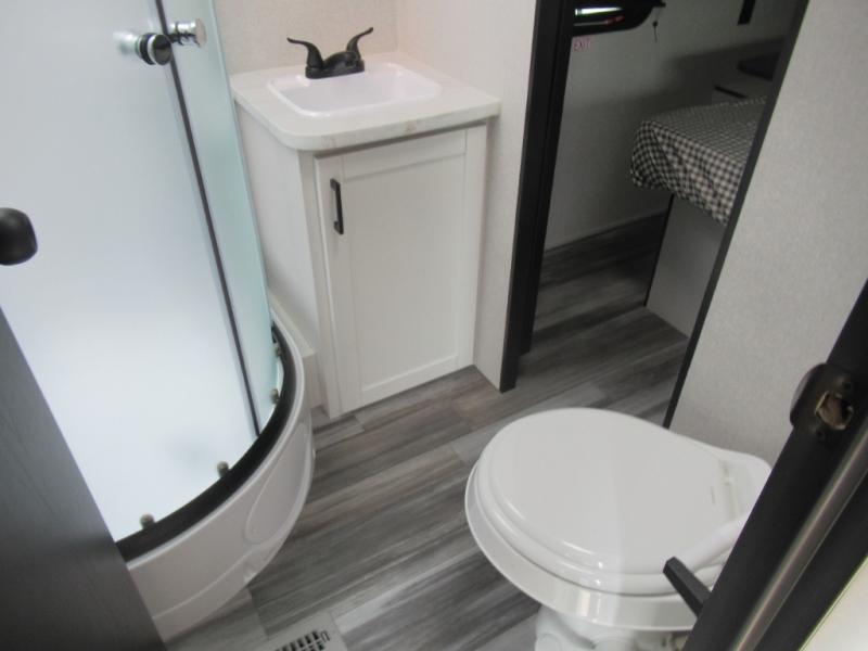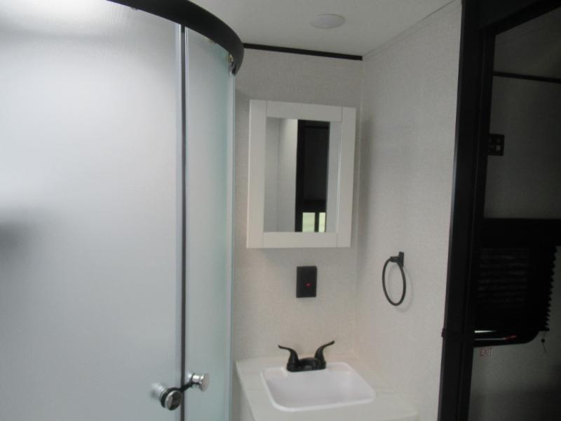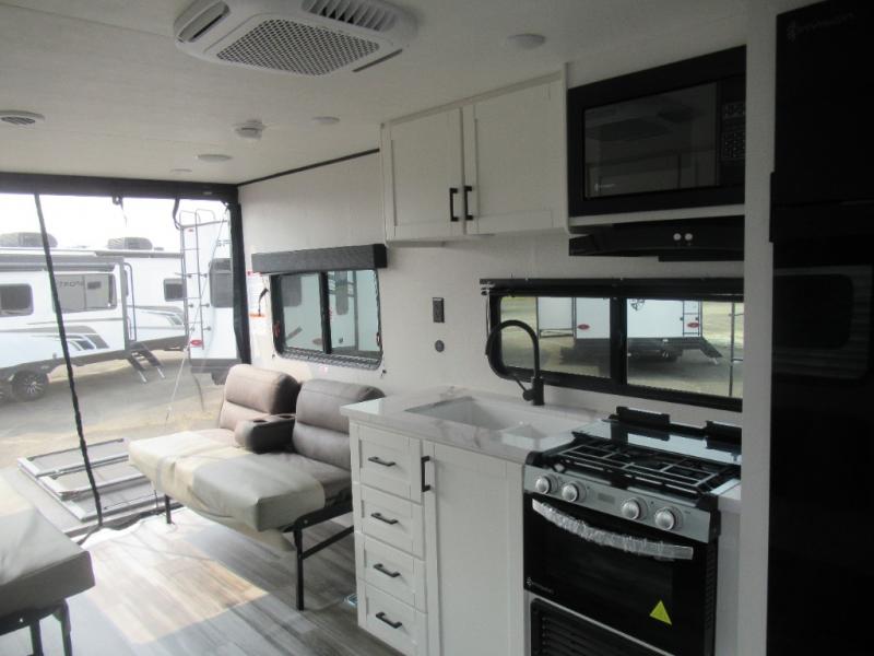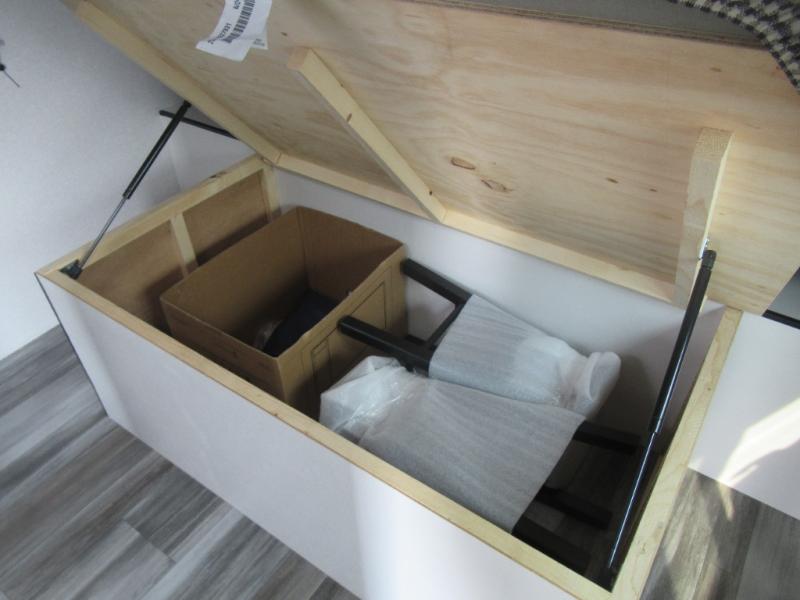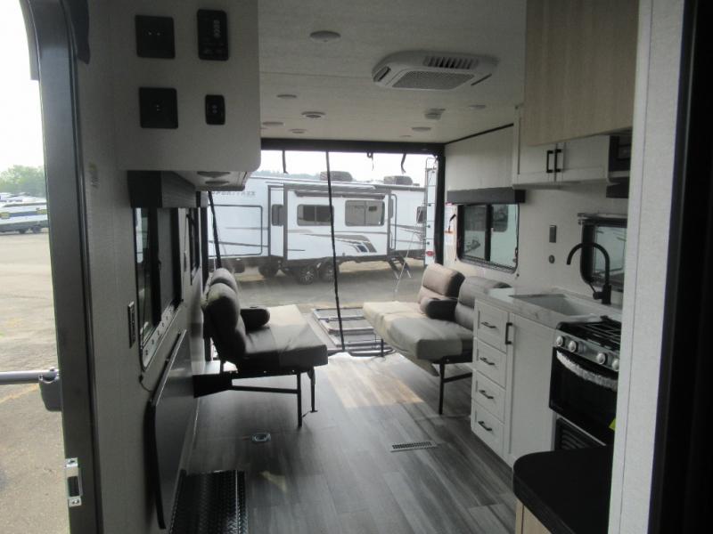 When you are ready to ride your off-road toys, relax in the great outdoors and unwind after a ride and do it all over again the next day, then load up and head to the campsite! You will have 5' 11" of cargo space plus a little more space in between the kitchen amenities and the flip-up bar top with stools to load more gear and such. The 7' 3" opening and 7' ramp door makes unloading easy as well. The convertible sofas and removable table allow more to dine, and the double entry bathroom will keep everyone clean before bedtime. The front bedroom offers privacy for the owners, and comfortable nights on a queen bed. And the power awning offers shade during the daytime when you want to relax outside.