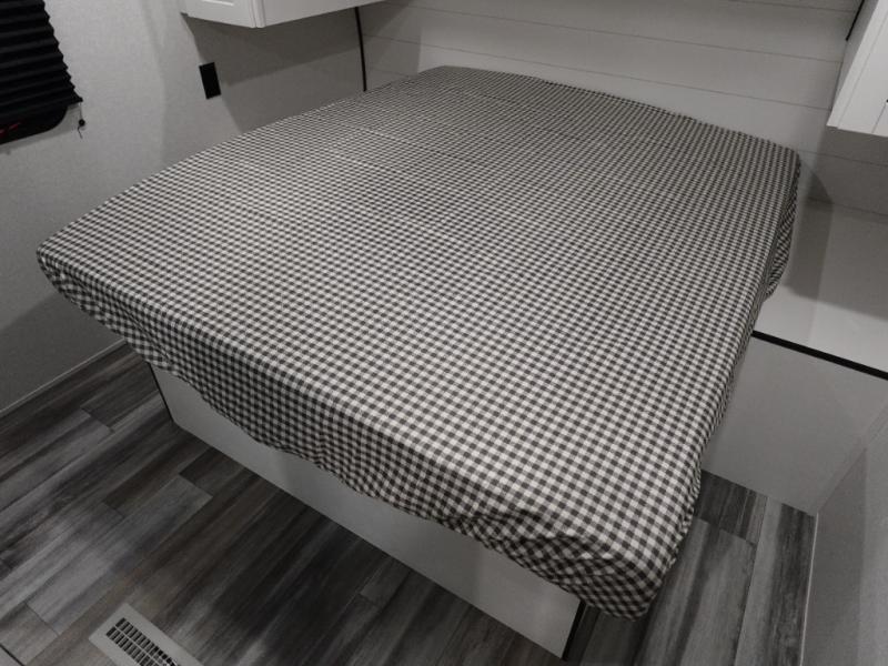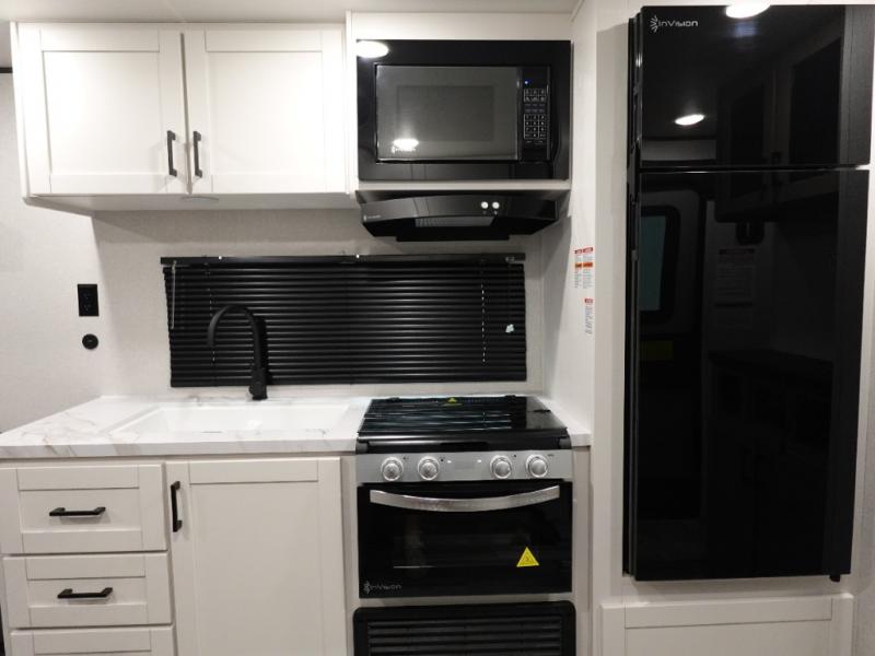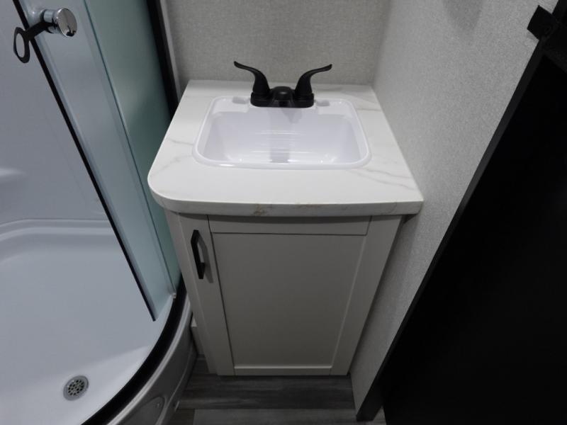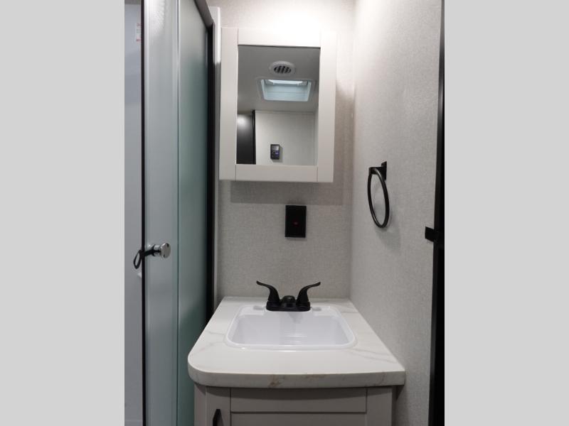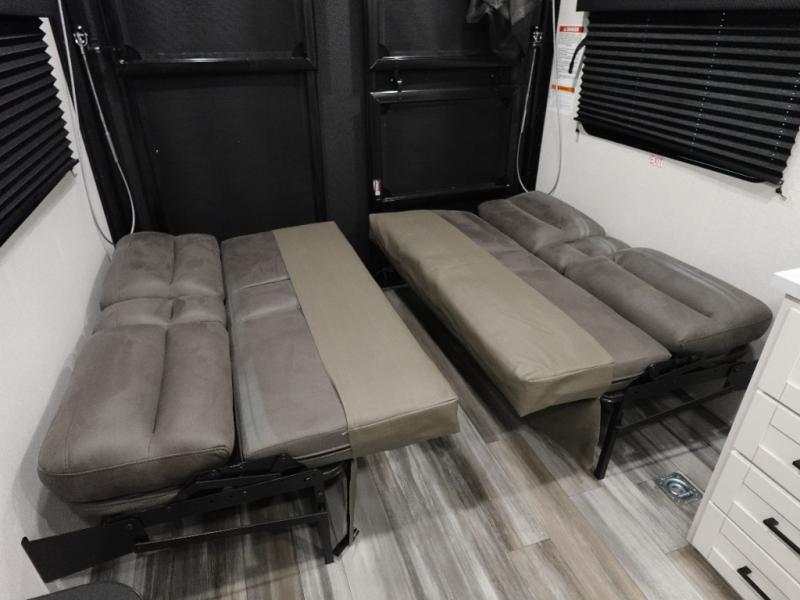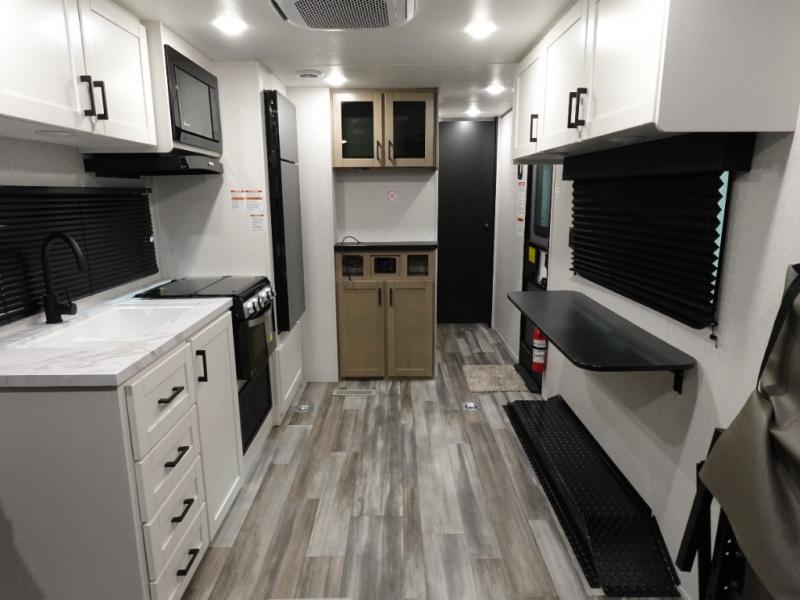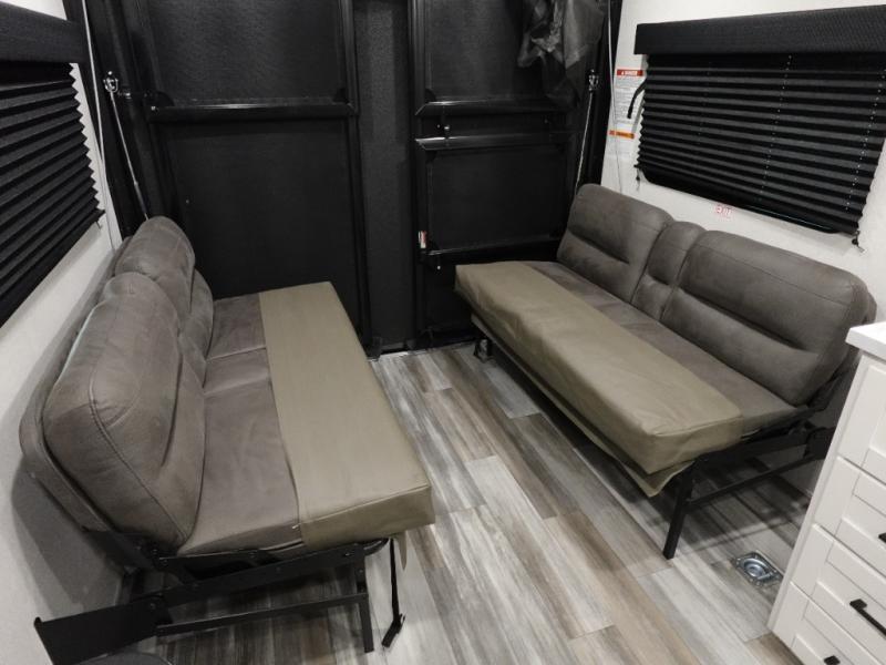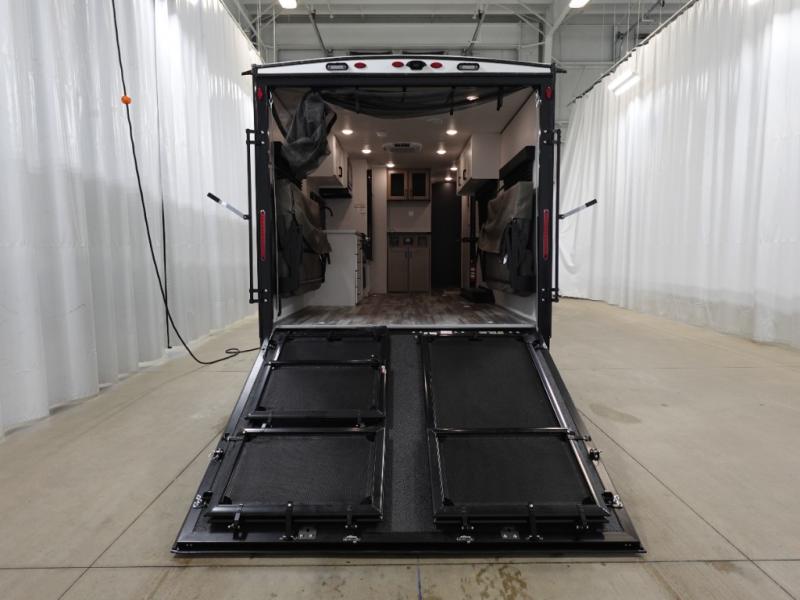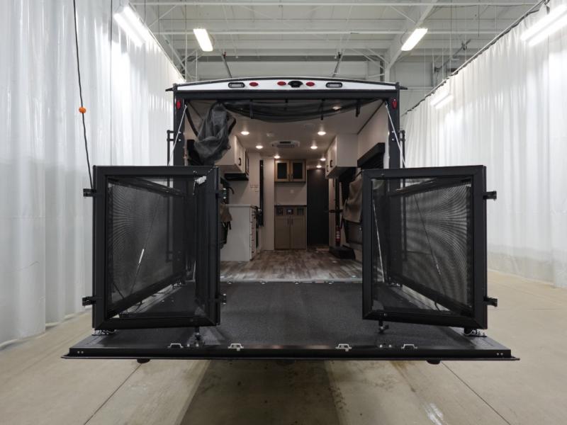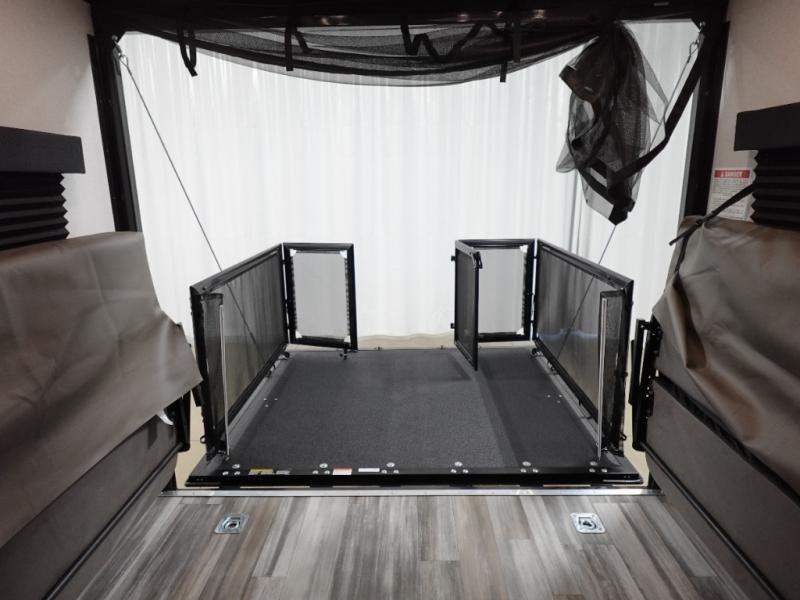 When you are ready to ride your off-road toys, relax in the great outdoors and unwind after a ride and do it all over again the next day, then load up and head to the campsite! You will have 5' 11" of cargo space plus a little more space in between the kitchen amenities and the flip-up bar top with stools to load more gear and such. The 7' 3" opening and 7' ramp door makes unloading easy as well. The convertible sofas and removable table allow more to dine, and the double entry bathroom will keep everyone clean before bedtime. The front bedroom offers privacy for the owners, and comfortable nights on a queen bed. And the power awning offers shade during the daytime when you want to relax outside.