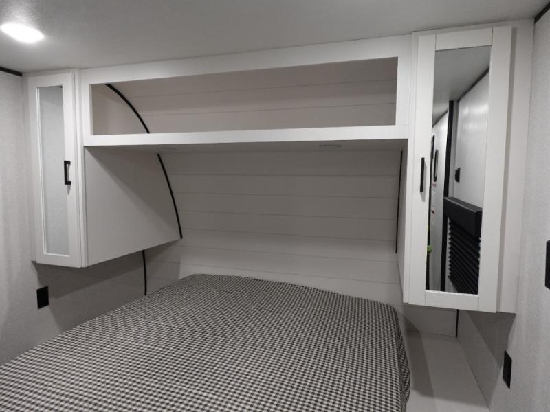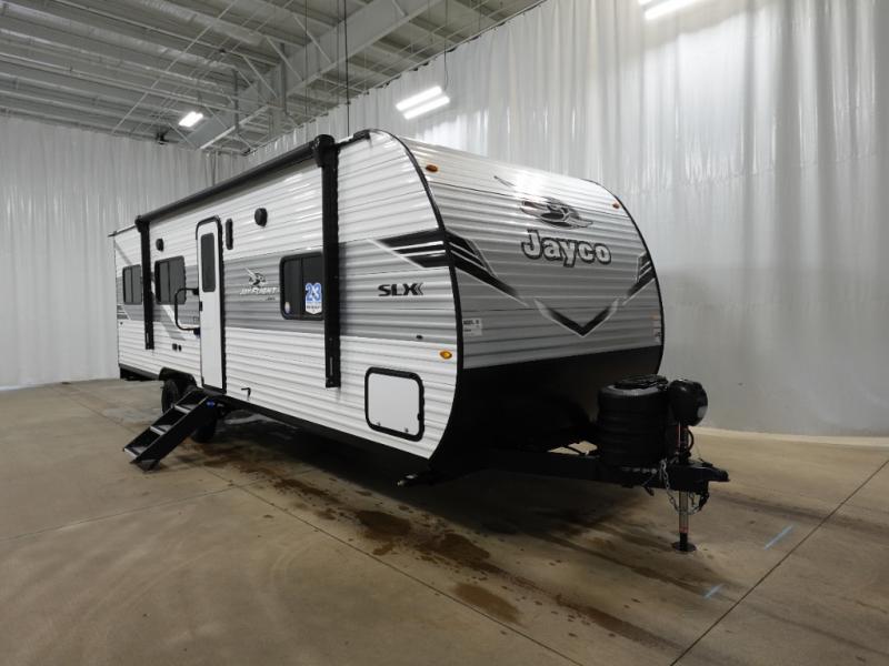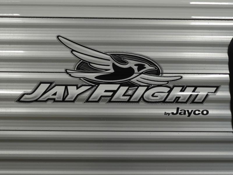 The Jayco Jay Flight SLX toy hauler travel trailer is quite easy to own because it is lightweight for an easier towing experience. Built on a fully integrated A-frame with galvanized-steel, impact-resistant wheel wells, the Jay Flight SLX has quality at its very foundation. That quality continues on to the electric self-adjusting brakes, easy-lube hubs, Magnum Truss roof system, and LP quick connect. Some of what the mandatory Customer Value Package includes is backup camera prep, Keyed-Alike entry and baggage doors, and an on-demand tankless water heater.