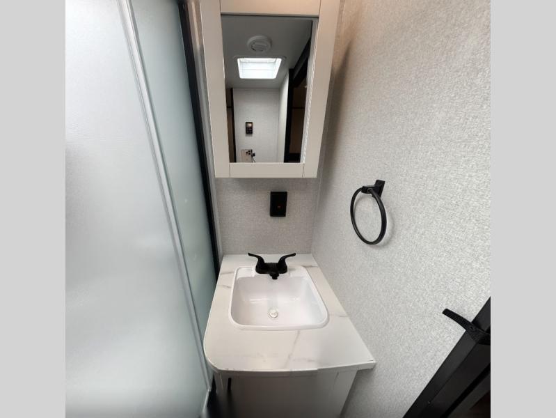 When you are ready to ride your off-road toys, relax in the great outdoors and unwind after a ride and do it all over again the next day, then load up and head to the campsite! You will have 5' 11" of cargo space plus a little more space in between the kitchen amenities and the flip-up bar top with stools to load more gear and such. The 7' 3" opening and 7' ramp door makes unloading easy as well. The convertible sofas and removable table allow more to dine, and the double entry bathroom will keep everyone clean before bedtime. The front bedroom offers privacy for the owners, and comfortable nights on a queen bed. And the power awning offers shade during the daytime when you want to relax outside.