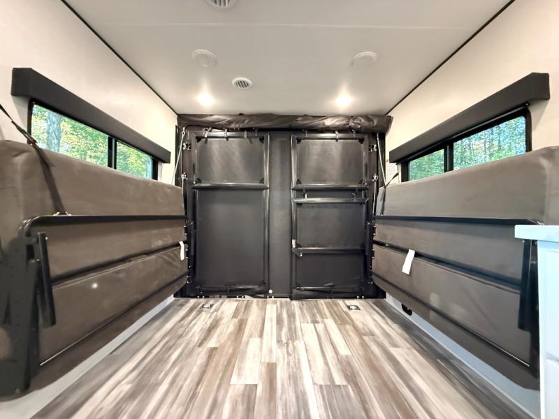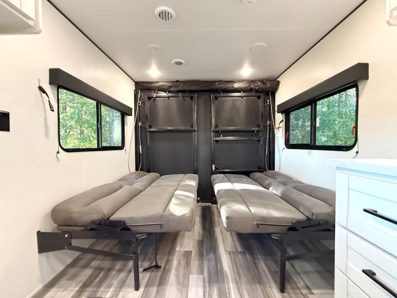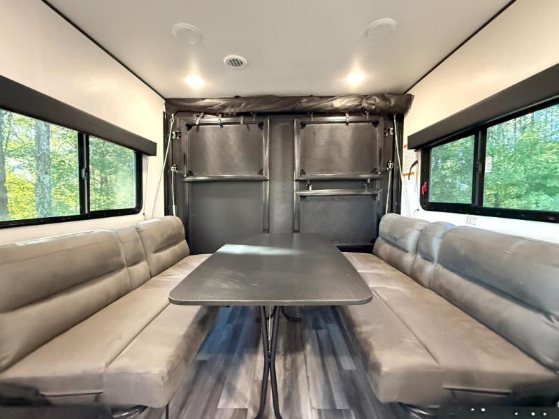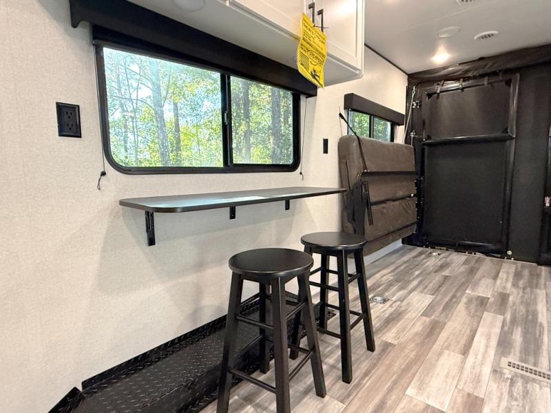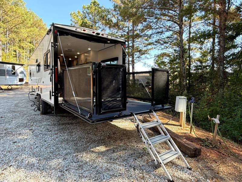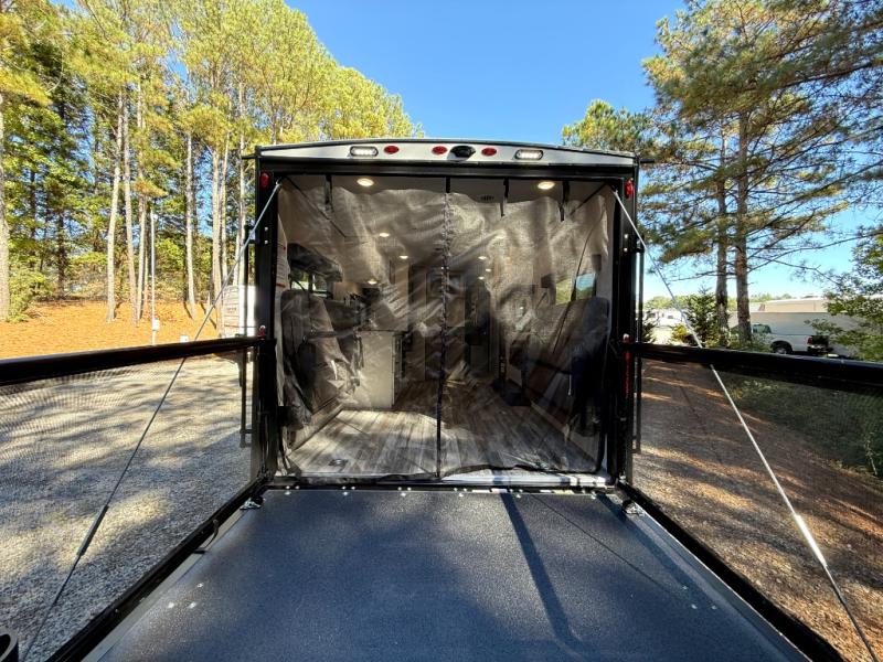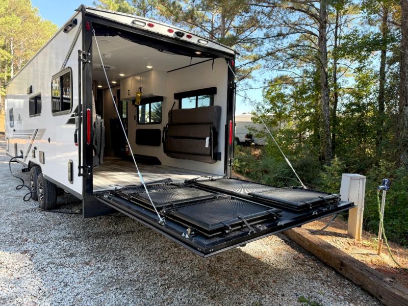When you are ready to ride your off-road toys, relax in the great outdoors and unwind after a ride and do it all over again the next day, then load up and head to the campsite! You will have 5' 11" of cargo space plus a little more space in between the kitchen amenities and the flip-up bar top with stools to load more gear and such. The 7' 3" opening and 7' ramp door makes unloading easy as well. The convertible sofas and removable table allow more to dine, and the double entry bathroom will keep everyone clean before bedtime. The front bedroom offers privacy for the owners, and comfortable nights on a queen bed. And the power awning offers shade during the daytime when you want to relax outside.