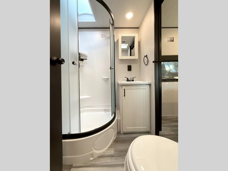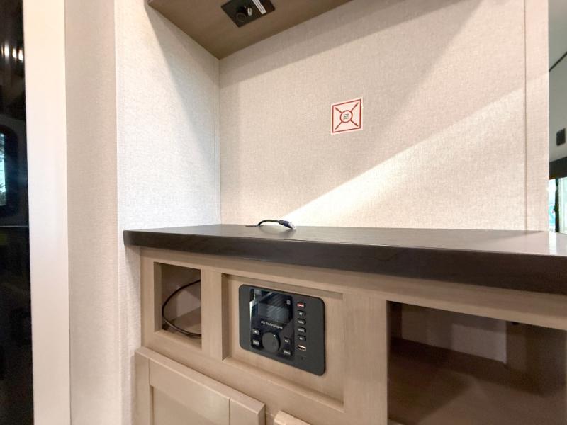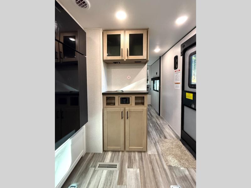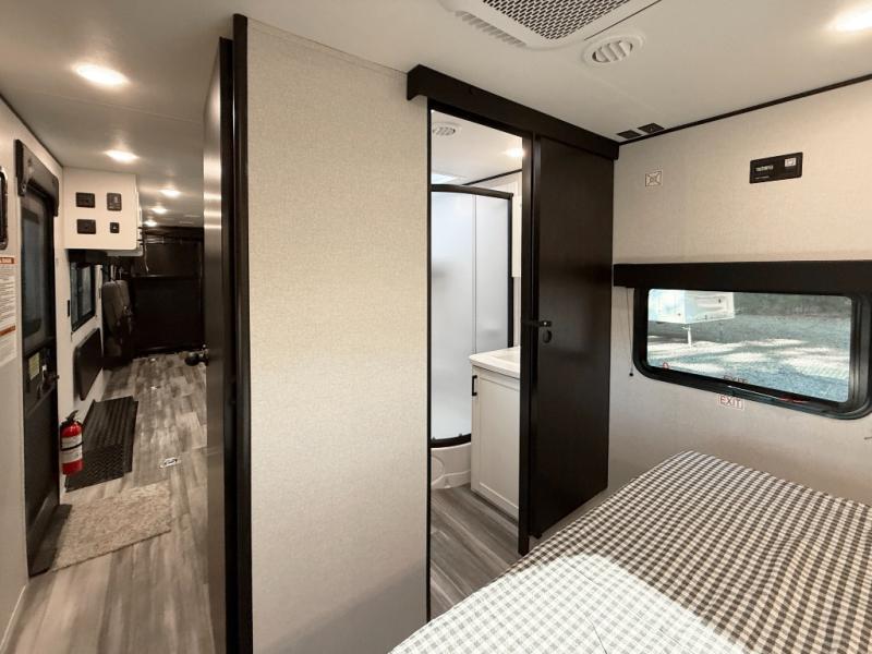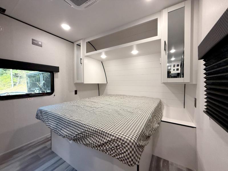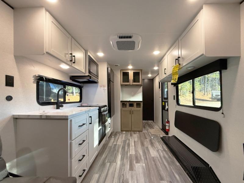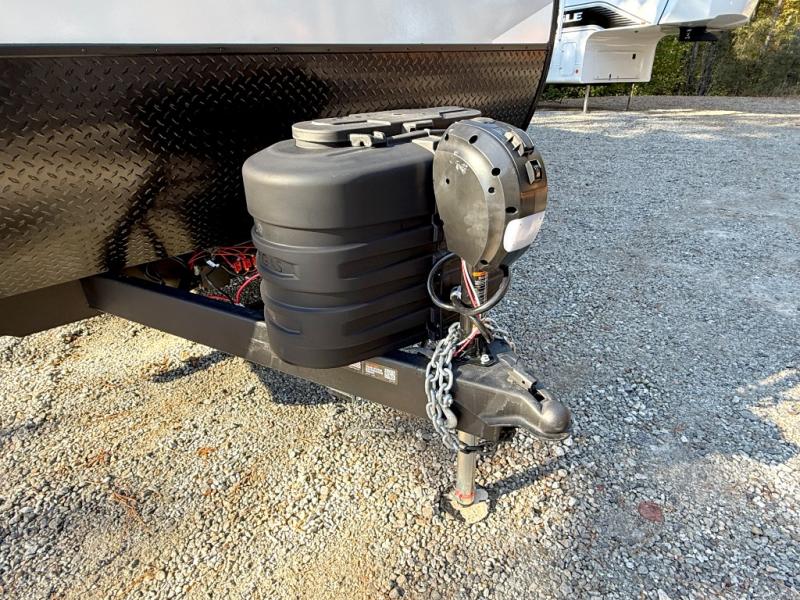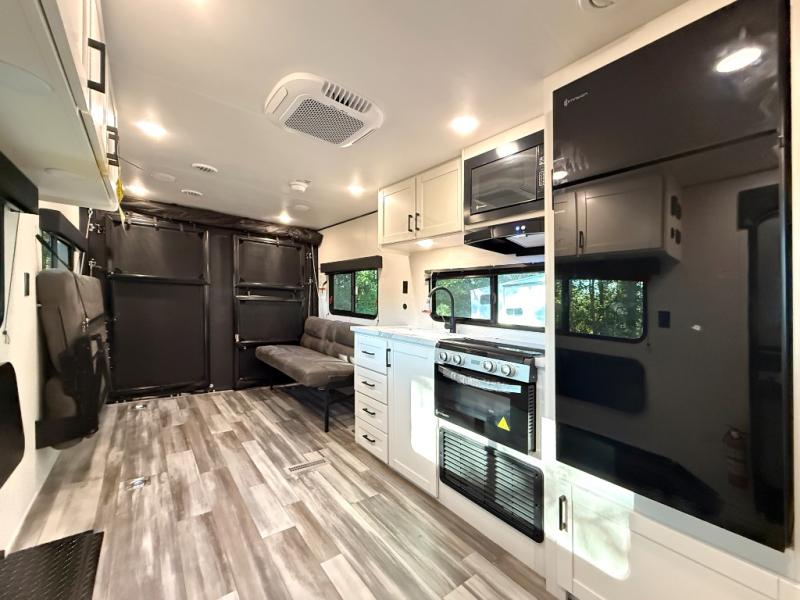 When you are ready to ride your off-road toys, relax in the great outdoors and unwind after a ride and do it all over again the next day, then load up and head to the campsite! You will have 5' 11" of cargo space plus a little more space in between the kitchen amenities and the flip-up bar top with stools to load more gear and such. The 7' 3" opening and 7' ramp door makes unloading easy as well. The convertible sofas and removable table allow more to dine, and the double entry bathroom will keep everyone clean before bedtime. The front bedroom offers privacy for the owners, and comfortable nights on a queen bed. And the power awning offers shade during the daytime when you want to relax outside.