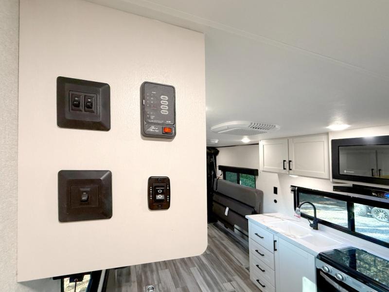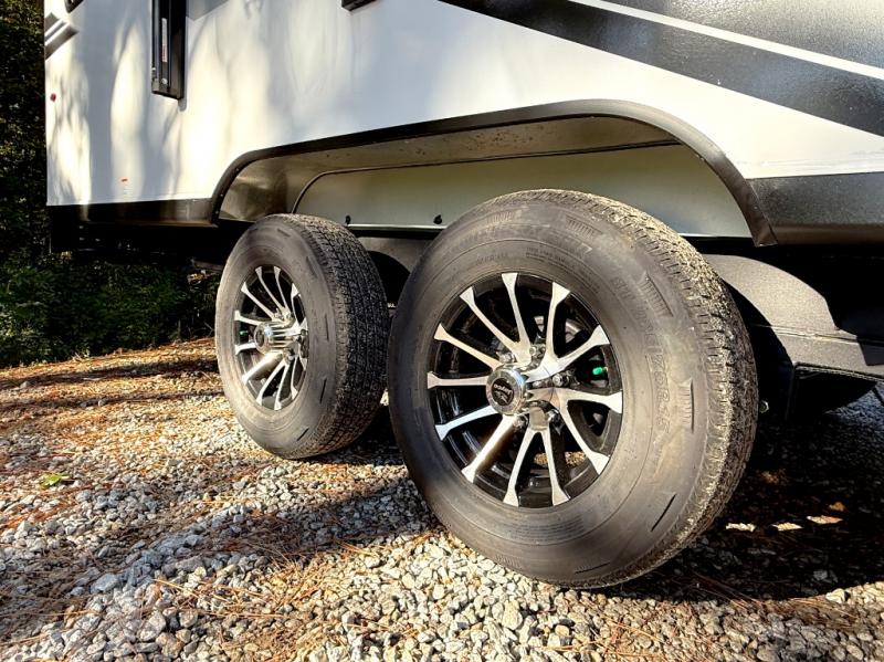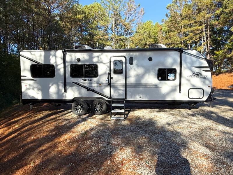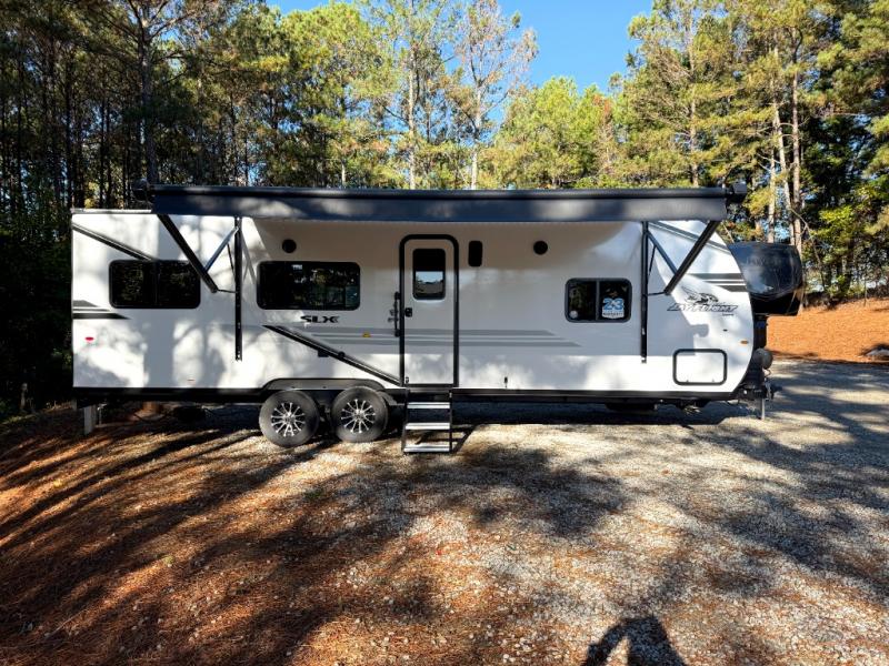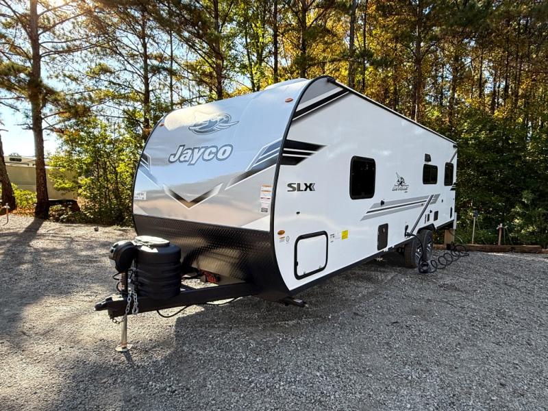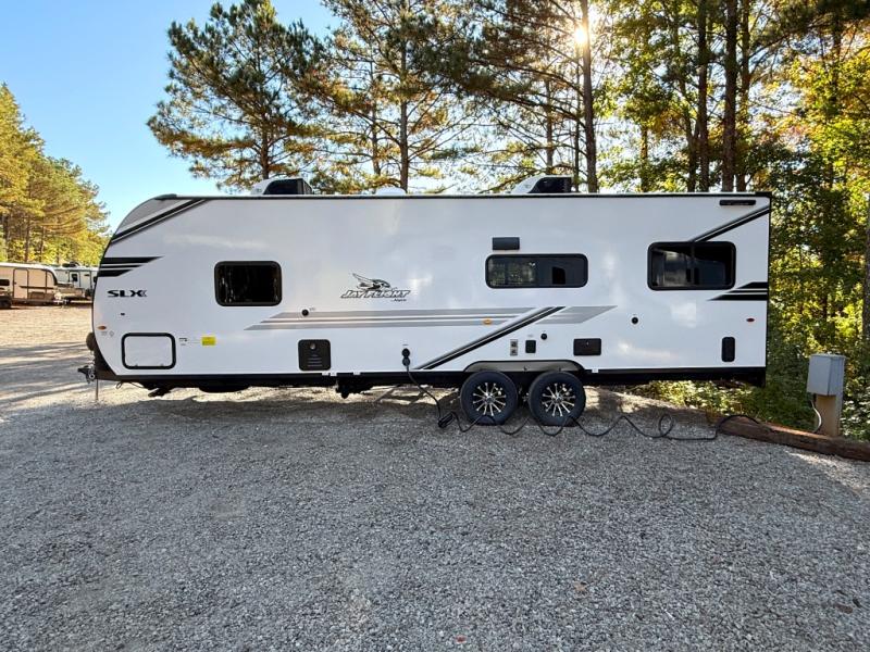 The Jayco Jay Flight SLX toy hauler travel trailer is quite easy to own because it is lightweight for an easier towing experience. Built on a fully integrated A-frame with galvanized-steel, impact-resistant wheel wells, the Jay Flight SLX has quality at its very foundation. That quality continues on to the electric self-adjusting brakes, easy-lube hubs, Magnum Truss roof system, and LP quick connect. Some of what the mandatory Customer Value Package includes is backup camera prep, Keyed-Alike entry and baggage doors, and an on-demand tankless water heater.
