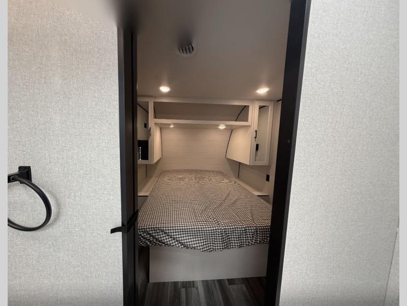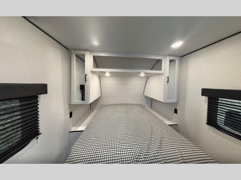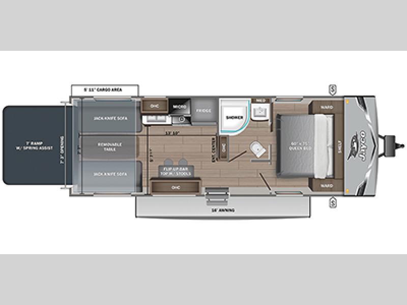 When you are ready to ride your off-road toys, relax in the great outdoors and unwind after a ride and do it all over again the next day, then load up and head to the campsite! You will have 5' 11" of cargo space plus a little more space in between the kitchen amenities and the flip-up bar top with stools to load more gear and such. The 7' 3" opening and 7' ramp door makes unloading easy as well. The convertible sofas and removable table allow more to dine, and the double entry bathroom will keep everyone clean before bedtime. The front bedroom offers privacy for the owners, and comfortable nights on a queen bed. And the power awning offers shade during the daytime when you want to relax outside.