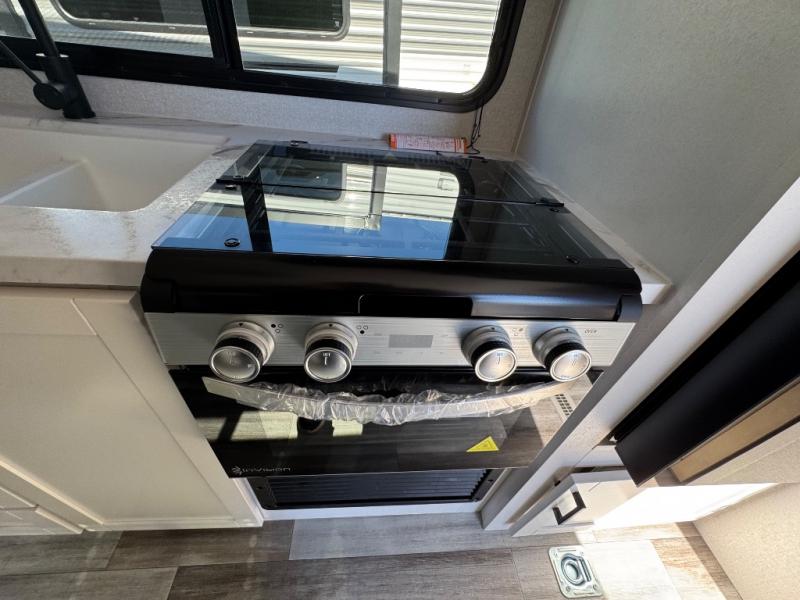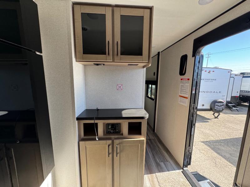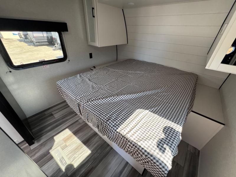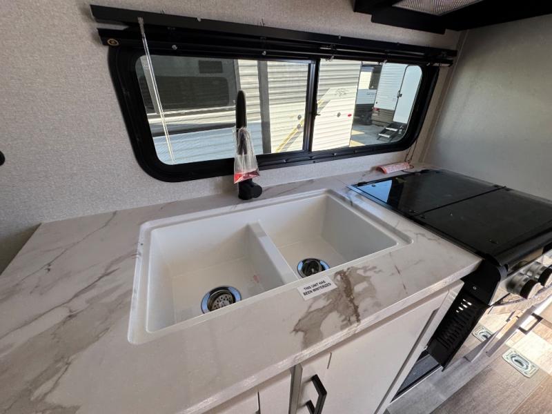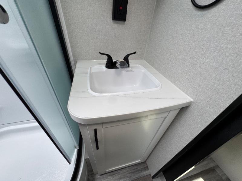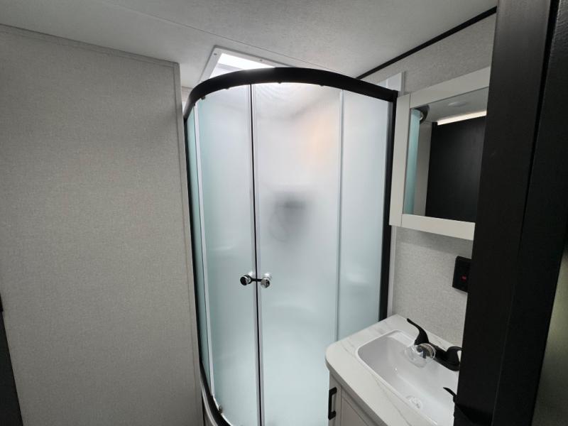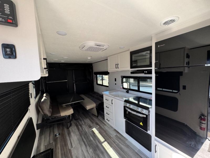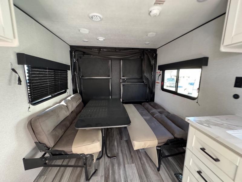 When you are ready to ride your off-road toys, relax in the great outdoors and unwind after a ride and do it all over again the next day, then load up and head to the campsite! You will have 5' 11" of cargo space plus a little more space in between the kitchen amenities and the flip-up bar top with stools to load more gear and such. The 7' 3" opening and 7' ramp door makes unloading easy as well. The convertible sofas and removable table allow more to dine, and the double entry bathroom will keep everyone clean before bedtime. The front bedroom offers privacy for the owners, and comfortable nights on a queen bed. And the power awning offers shade during the daytime when you want to relax outside.
