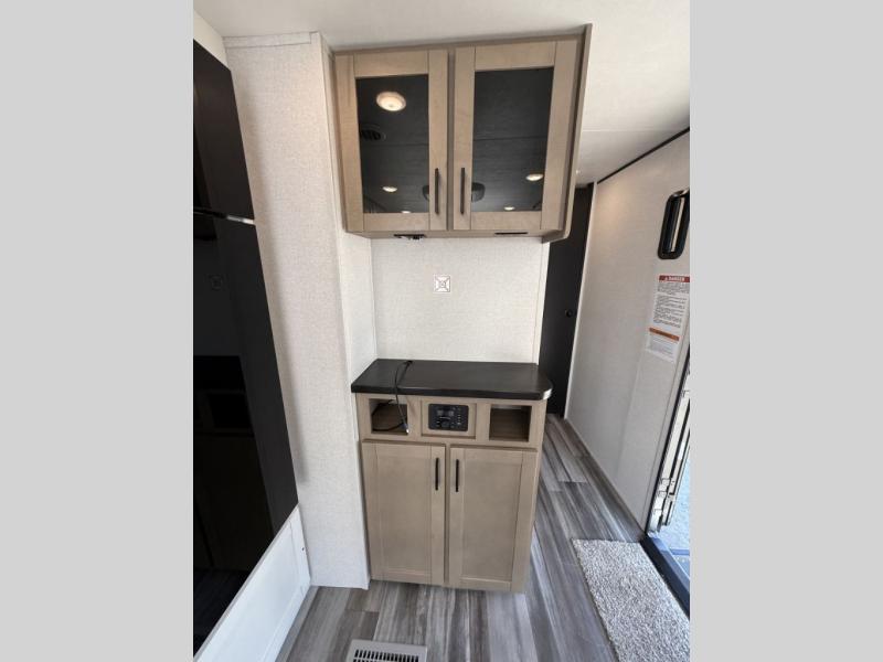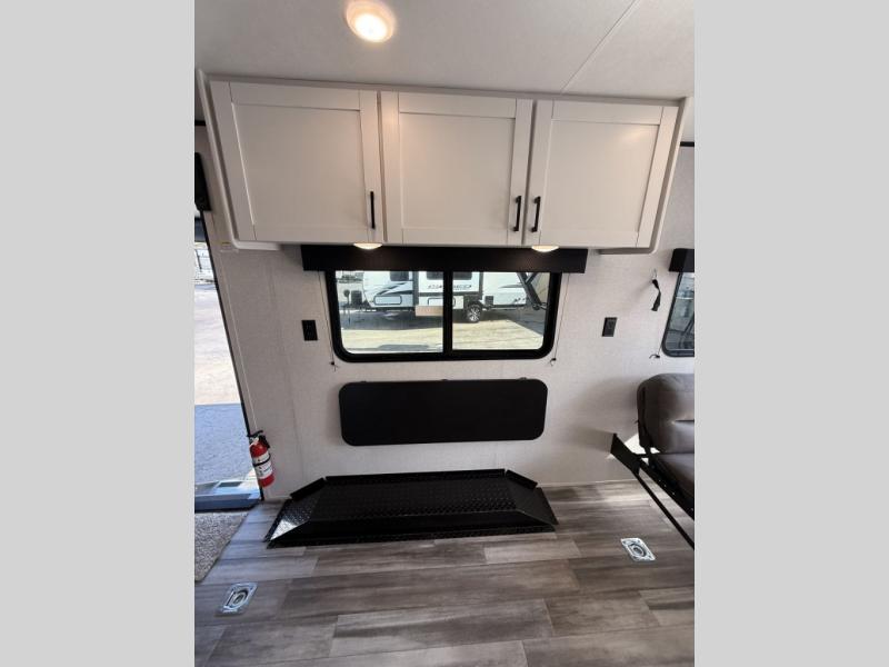 Inside, you’ll find solid hardwood cabinet doors with hidden hinges, giving the space a modern, residential feel. Oversized cabinets and under-bed storage ensure there’s room for everything you need, while the lit exterior passthrough storage makes packing and unpacking a breeze.