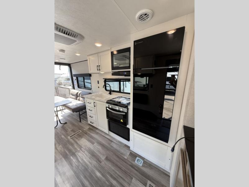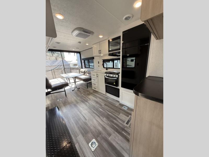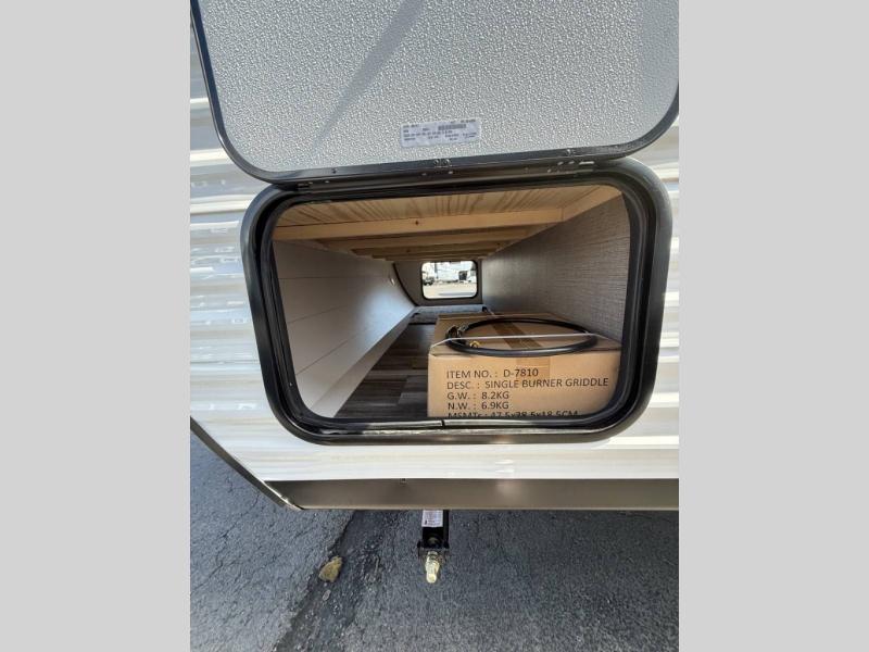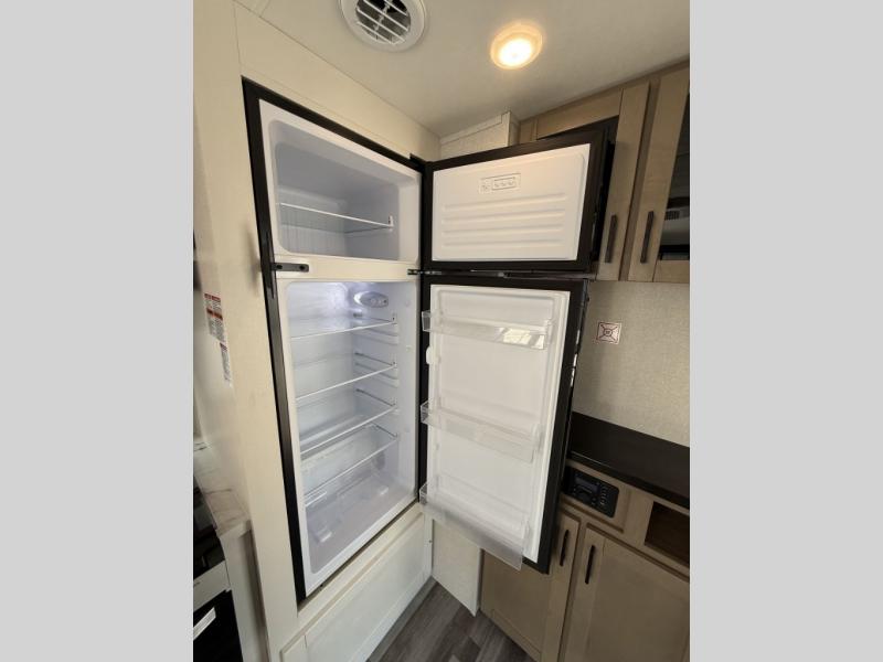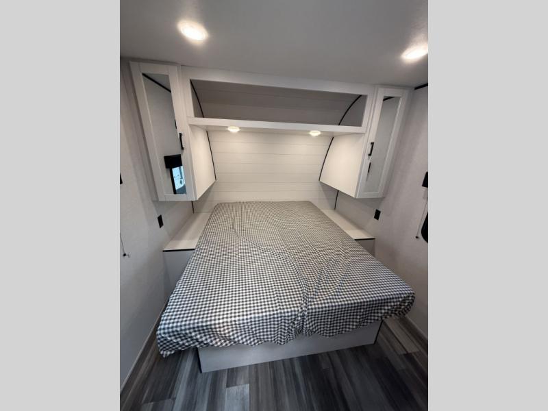 Inside, you’ll find solid hardwood cabinet doors with hidden hinges, giving the space a modern, residential feel. Oversized cabinets and under-bed storage ensure there’s room for everything you need, while the lit exterior passthrough storage makes packing and unpacking a breeze.