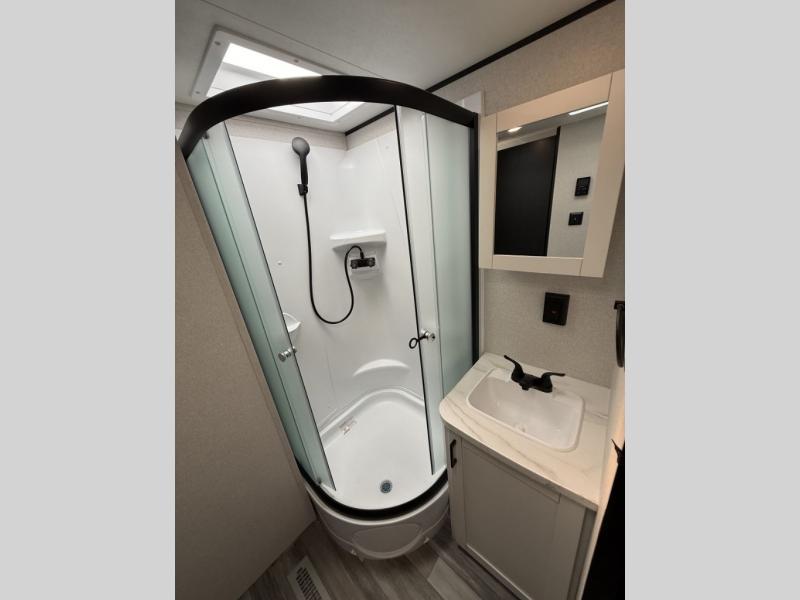 After a long day of exploring, step inside to enjoy instant hot water from the on-demand tankless water heater—up to 60,000 BTU in standard models and 42,000 BTU in the Sport Edition—so you can clean up comfortably, just like at home. Oversized G20 dark-tinted windows flood the space with natural light while blocking heat and UV rays, giving you both stunning views and added privacy.