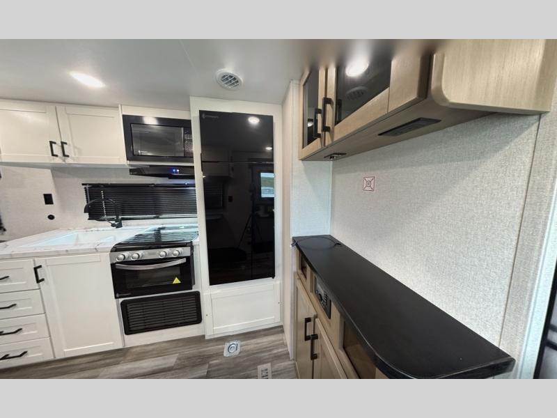 The Jayco Jay Flight SLX toy hauler travel trailer is quite easy to own because it is lightweight for an easier towing experience. Built on a fully integrated A-frame with galvanized-steel, impact-resistant wheel wells, the Jay Flight SLX has quality at its very foundation. That quality continues on to the electric self-adjusting brakes, easy-lube hubs, Magnum Truss roof system, and LP quick connect. Some of what the mandatory Customer Value Package includes is backup camera prep, Keyed-Alike entry and baggage doors, and an on-demand tankless water heater.