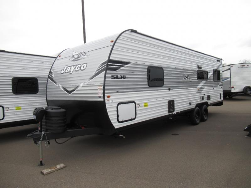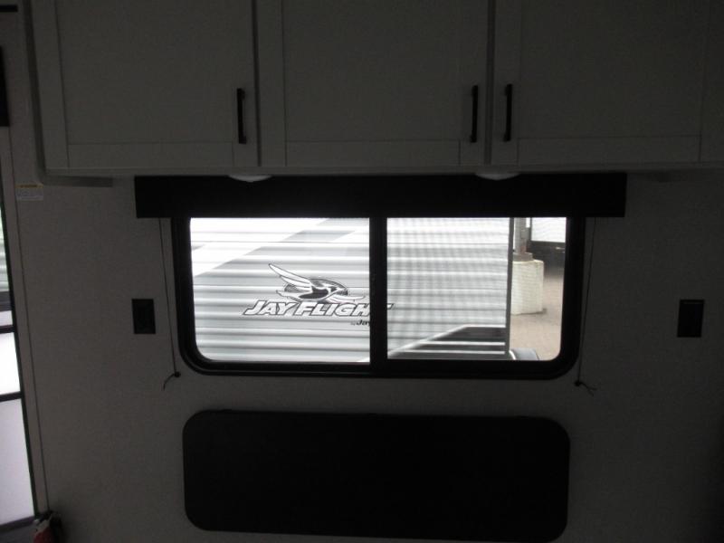 The Jayco Jay Flight SLX toy hauler travel trailer is quite easy to own because it is lightweight for an easier towing experience. Built on a fully integrated A-frame with galvanized-steel, impact-resistant wheel wells, the Jay Flight SLX has quality at its very foundation. That quality continues on to the electric self-adjusting brakes, easy-lube hubs, Magnum Truss roof system, and LP quick connect. Some of what the mandatory Customer Value Package includes is backup camera prep, Keyed-Alike entry and baggage doors, and an on-demand tankless water heater.