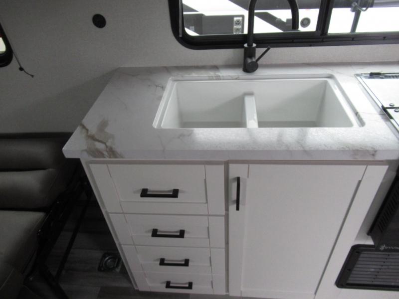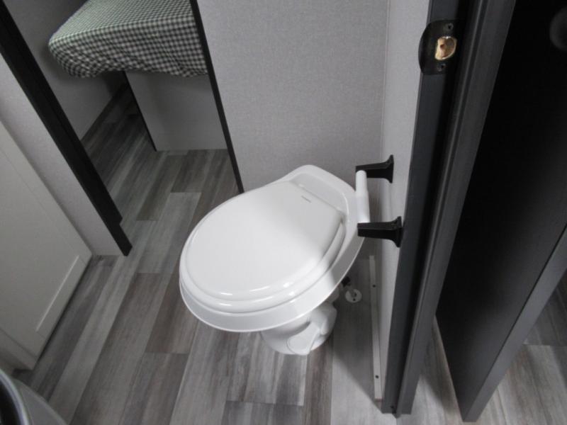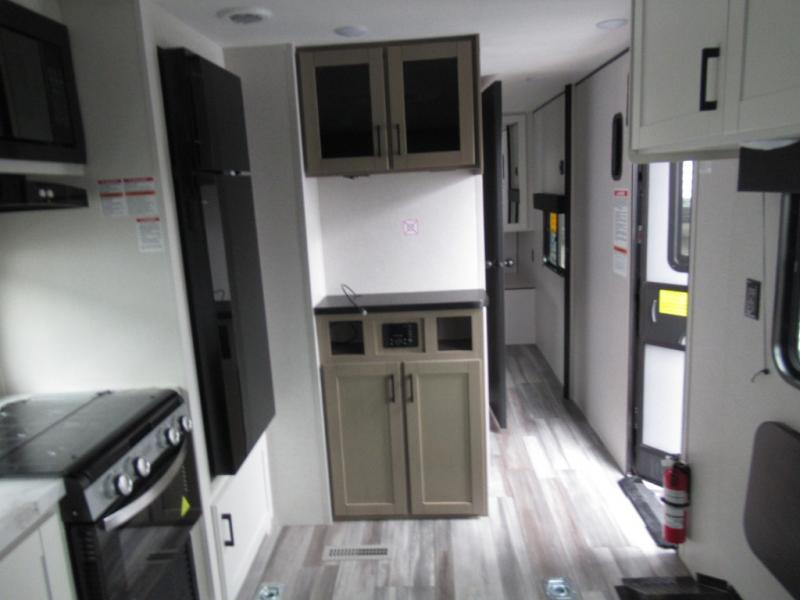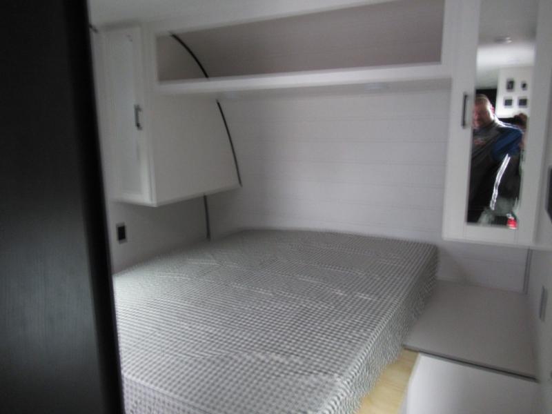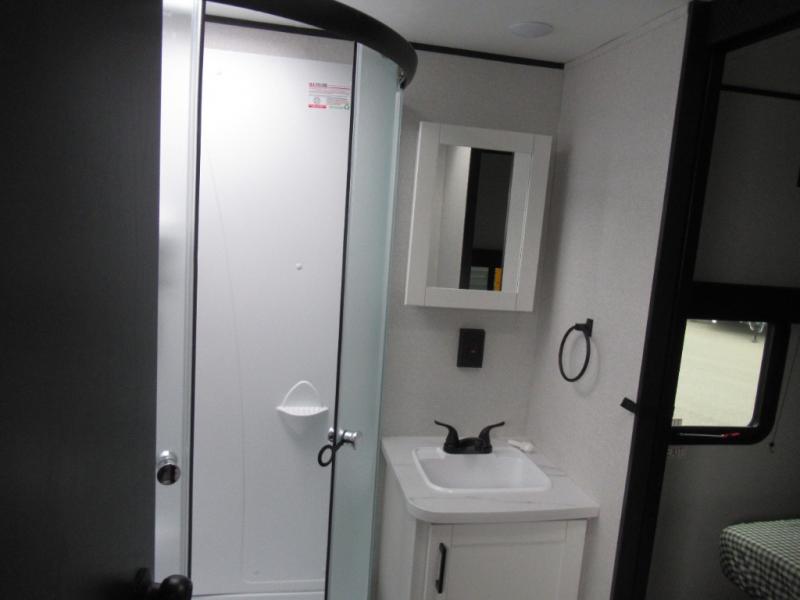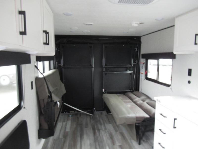 When you are ready to ride your off-road toys, relax in the great outdoors and unwind after a ride and do it all over again the next day, then load up and head to the campsite! You will have 5' 11" of cargo space plus a little more space in between the kitchen amenities and the flip-up bar top with stools to load more gear and such. The 7' 3" opening and 7' ramp door makes unloading easy as well. The convertible sofas and removable table allow more to dine, and the double entry bathroom will keep everyone clean before bedtime. The front bedroom offers privacy for the owners, and comfortable nights on a queen bed. And the power awning offers shade during the daytime when you want to relax outside.
