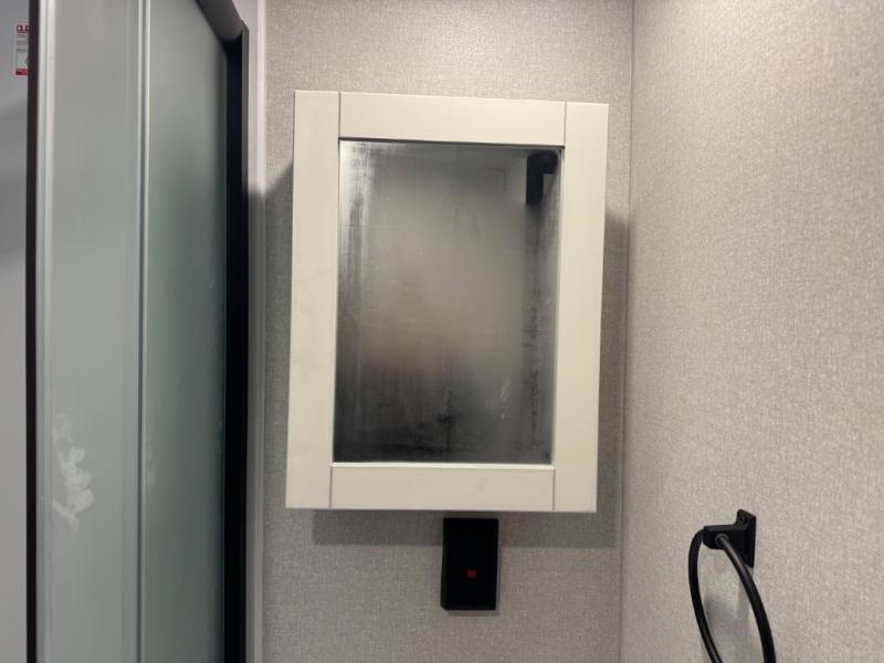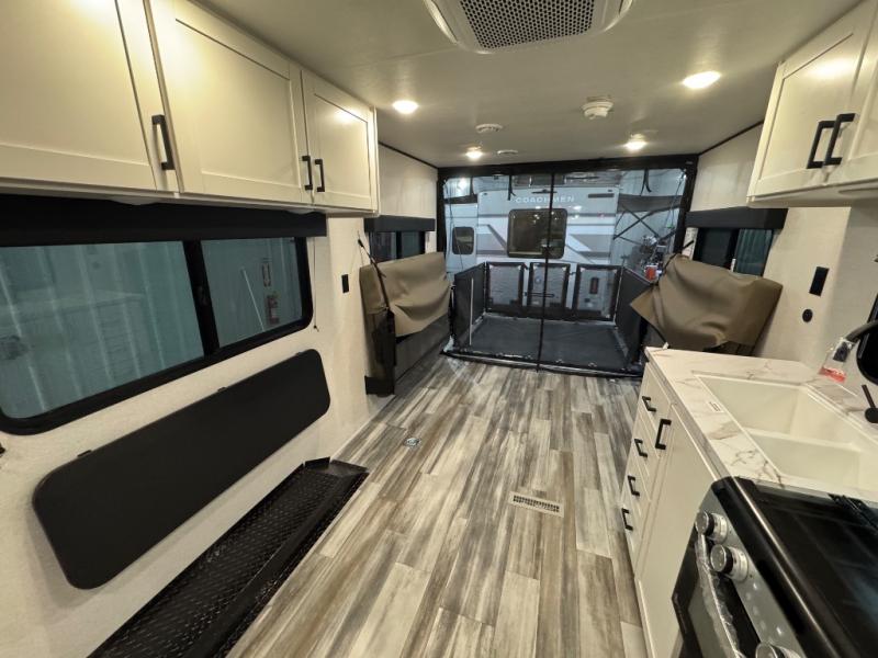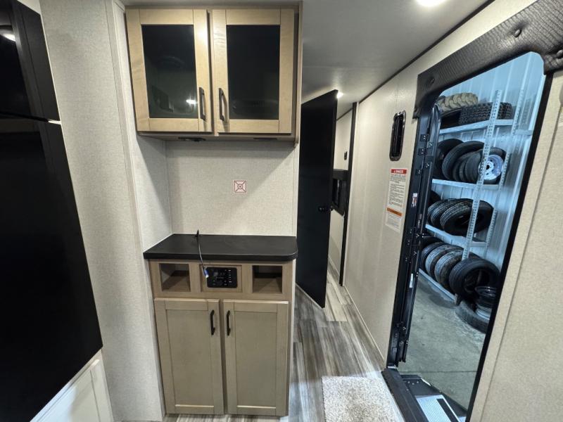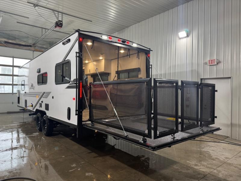 When you are ready to ride your off-road toys, relax in the great outdoors and unwind after a ride and do it all over again the next day, then load up and head to the campsite! You will have 5' 11" of cargo space plus a little more space in between the kitchen amenities and the flip-up bar top with stools to load more gear and such. The 7' 3" opening and 7' ramp door makes unloading easy as well. The convertible sofas and removable table allow more to dine, and the double entry bathroom will keep everyone clean before bedtime. The front bedroom offers privacy for the owners, and comfortable nights on a queen bed. And the power awning offers shade during the daytime when you want to relax outside.