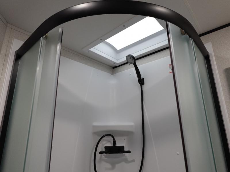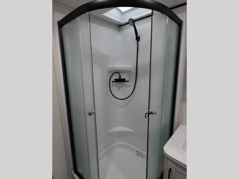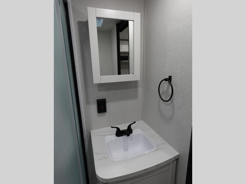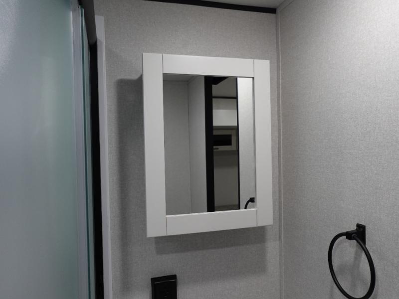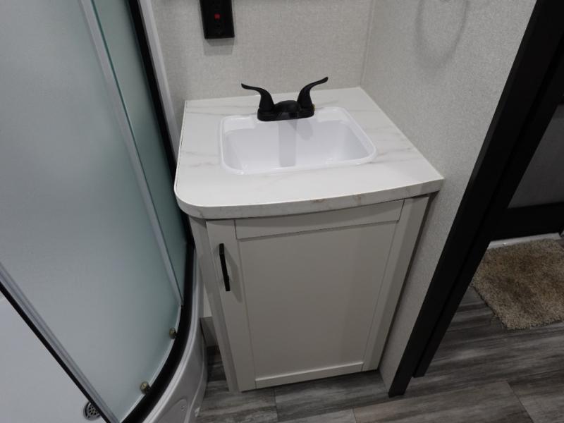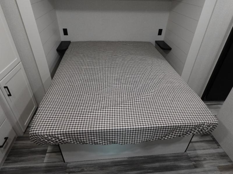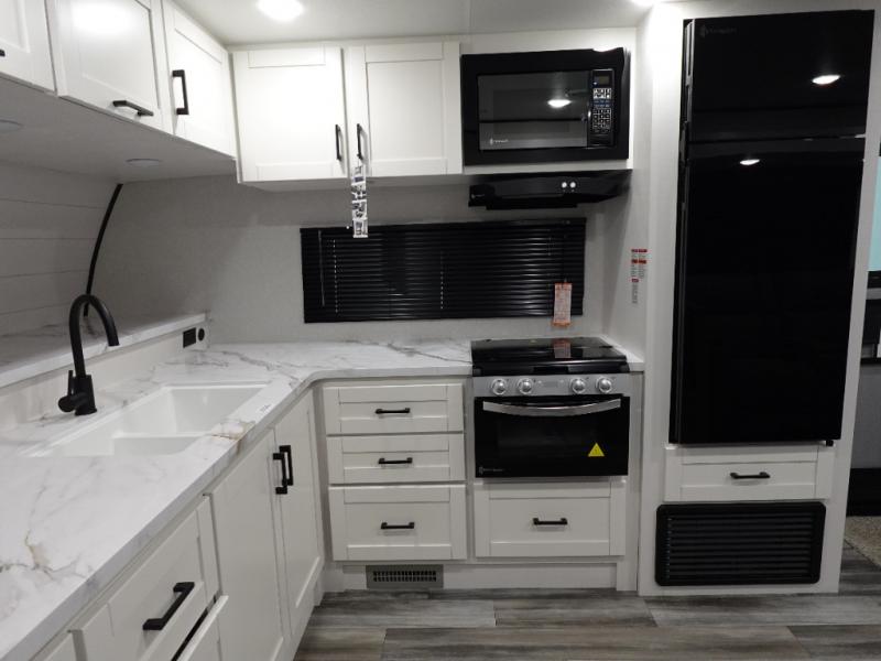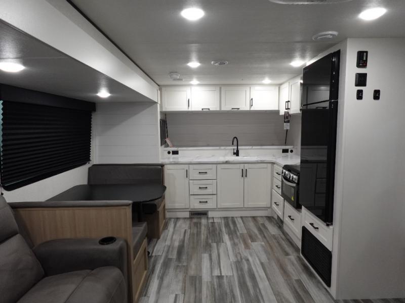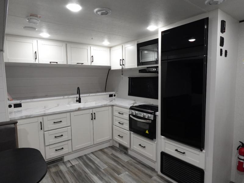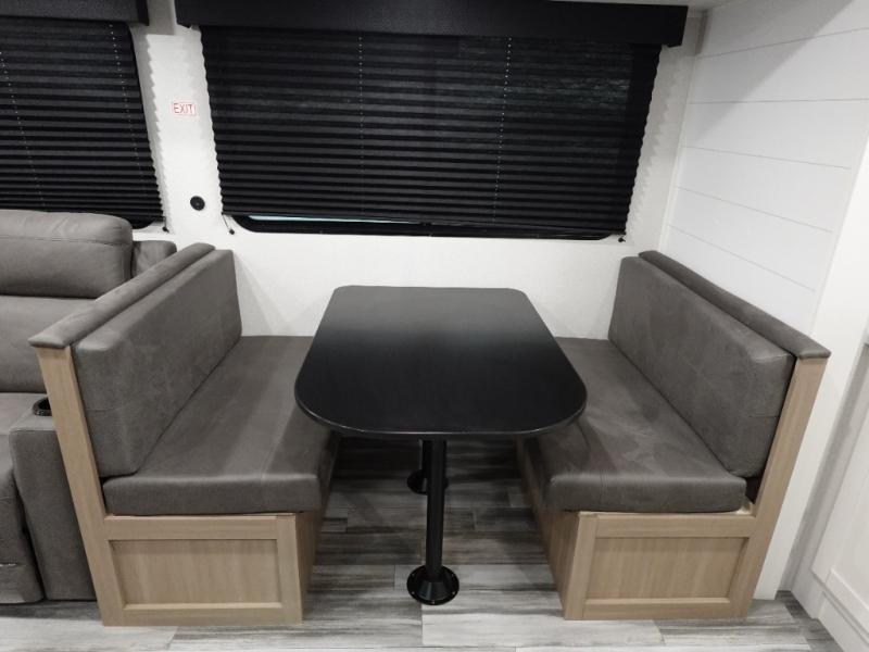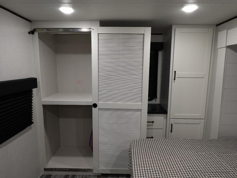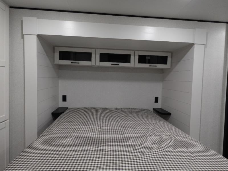 This front kitchen travel trailer is perfect for weekend trips or extended stays at the location of your choice! You'll love the ample counter space to prep meals, and there is a booth dinette where you can dine together each day. A theater seat is in great view of the entertainment center if you want to add a TV, or you may just find yourselves outdoors under the 20' power awning. This unit features a dual entry bath with a private entrance into the rear master bedroom. This room also includes a queen bed slide, a wardrobe and two dressers, plus additional storage with washer and dryer prep. And one of the dual entry doors is found here so you can slip out in the morning for some early fishing!