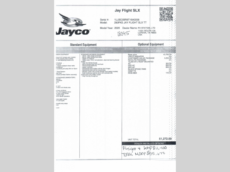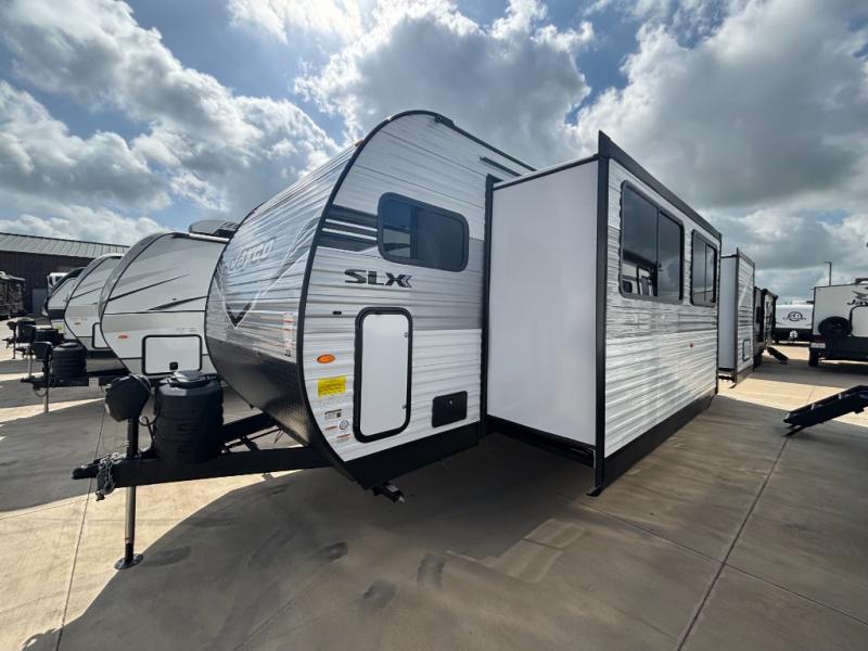 The Jayco Jay Flight SLX travel trailer is quite easy to own because it is lightweight for an easier towing experience. Built on a fully integrated A-frame with galvanized-steel, impact-resistant wheel wells, the Jay Flight SLX has quality at its very foundation. That quality continues on to the electric self-adjusting brakes, easy-lube hubs, Magnum Truss roof system, and LP quick connect. Some of what the mandatory Customer Value Package includes is backup camera prep, Keyed-Alike entry and baggage doors, marine grade exterior speakers, and an on-demand tankless water heater.