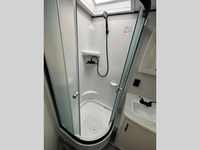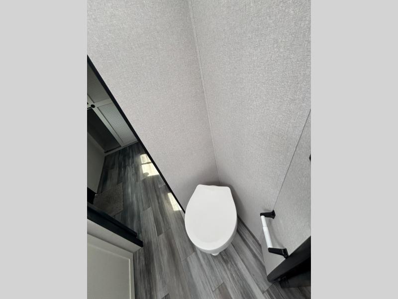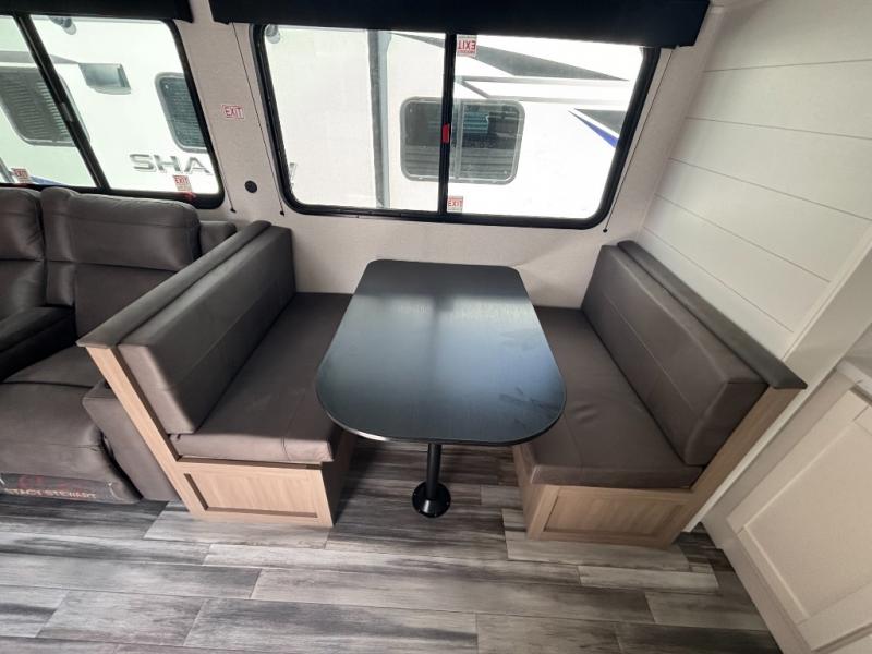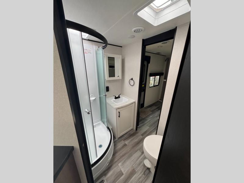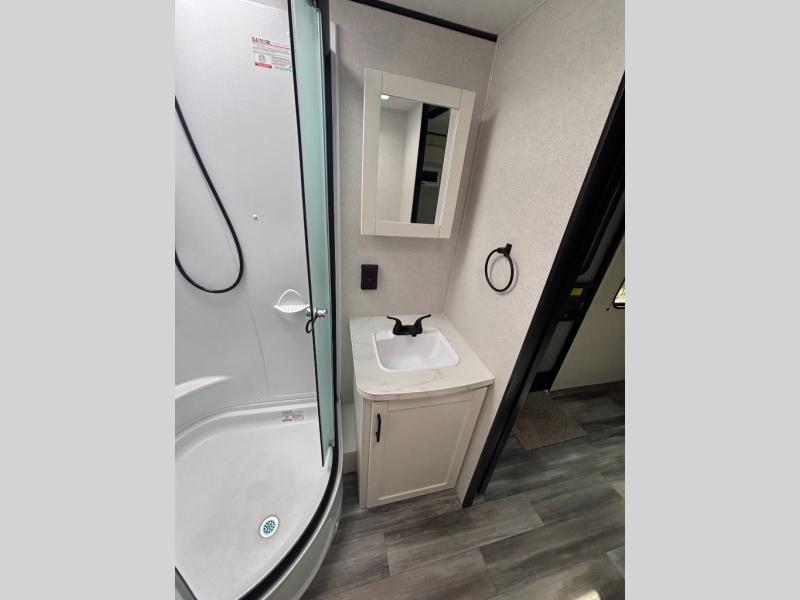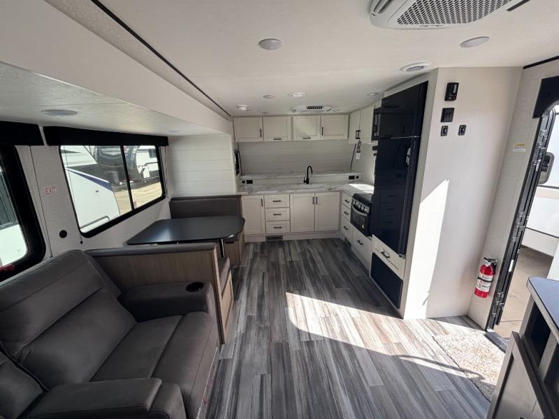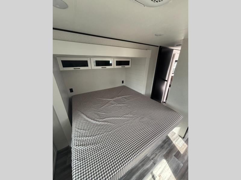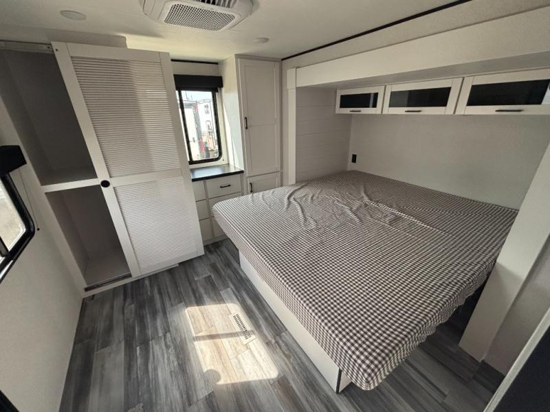 This front kitchen travel trailer is perfect for weekend trips or extended stays at the location of your choice! You'll love the ample counter space to prep meals, and there is a booth dinette where you can dine together each day. A theater seat is in great view of the entertainment center if you want to add a TV, or you may just find yourselves outdoors under the 20' power awning. This unit features a dual entry bath with a private entrance into the rear master bedroom. This room also includes a queen bed slide, a wardrobe and two dressers, plus additional storage with washer and dryer prep. And one of the dual entry doors is found here so you can slip out in the morning for some early fishing!