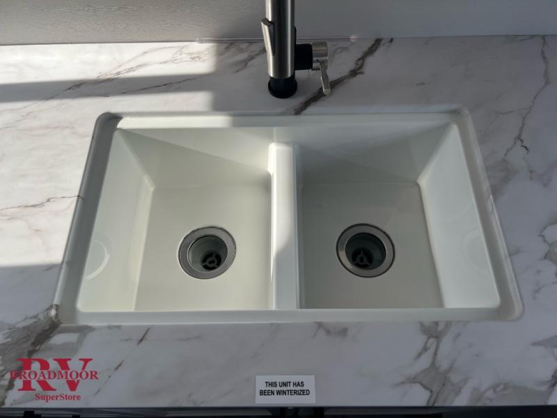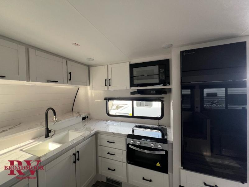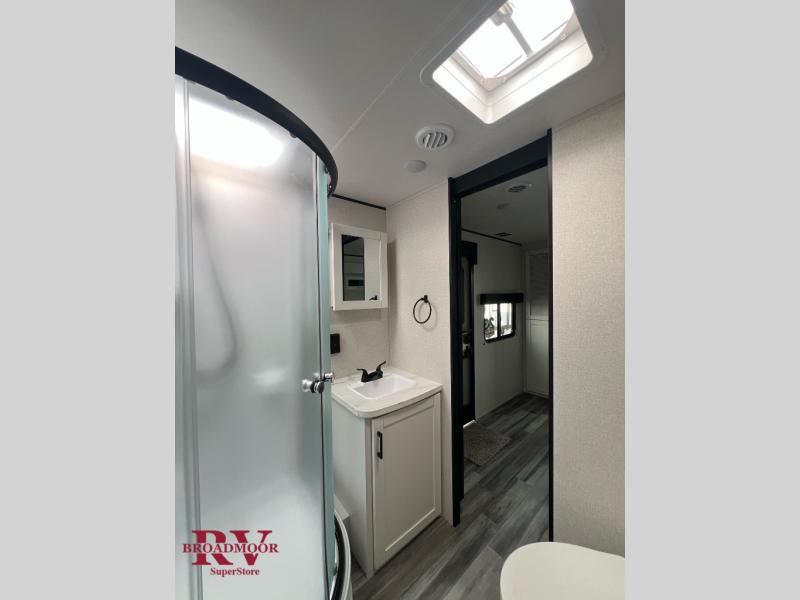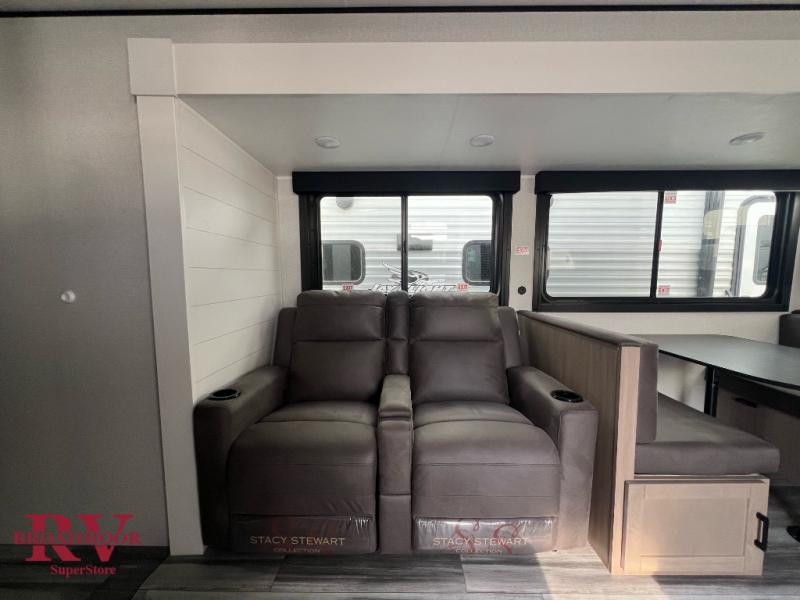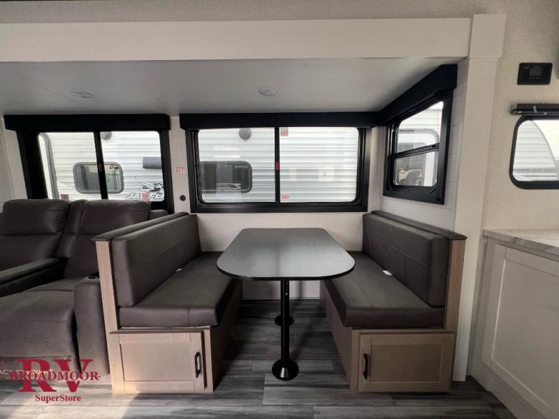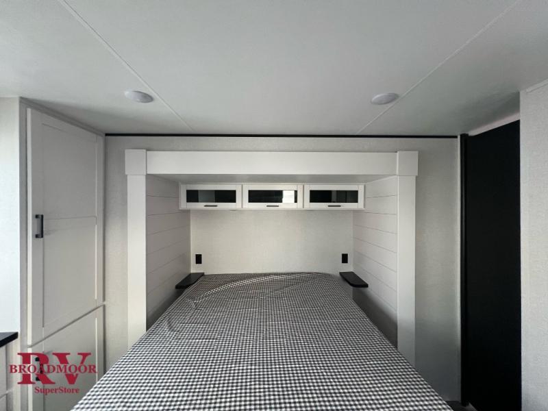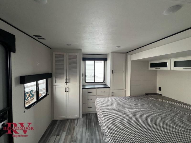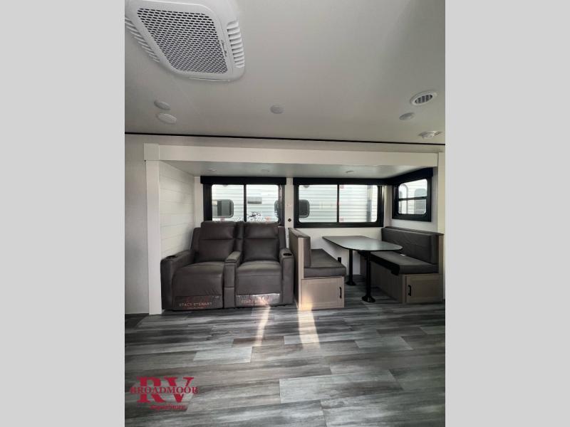 This front kitchen travel trailer is perfect for weekend trips or extended stays at the location of your choice! You'll love the ample counter space to prep meals, and there is a booth dinette where you can dine together each day. A theater seat is in great view of the entertainment center if you want to add a TV, or you may just find yourselves outdoors under the 20' power awning. This unit features a dual entry bath with a private entrance into the rear master bedroom. This room also includes a queen bed slide, a wardrobe and two dressers, plus additional storage with washer and dryer prep. And one of the dual entry doors is found here so you can slip out in the morning for some early fishing!