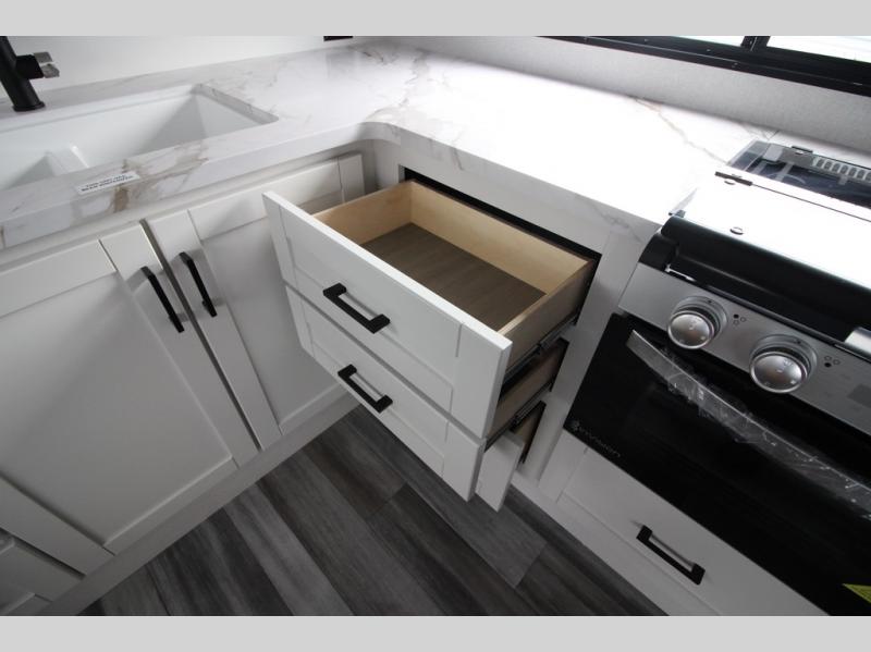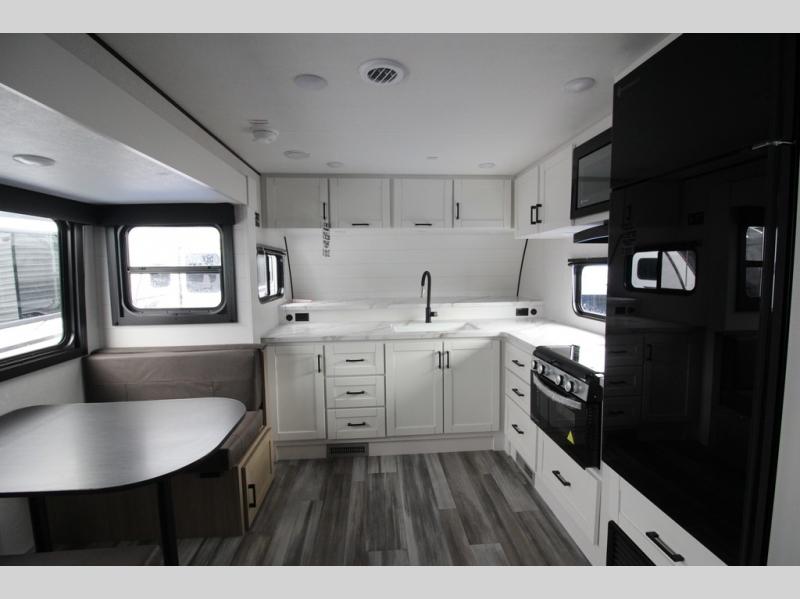 This front kitchen travel trailer is perfect for weekend trips or extended stays at the location of your choice! You'll love the ample counter space to prep meals, and there is a booth dinette where you can dine together each day. A theater seat is in great view of the entertainment center if you want to add a TV, or you may just find yourselves outdoors under the 20' power awning. This unit features a dual entry bath with a private entrance into the rear master bedroom. This room also includes a queen bed slide, a wardrobe and two dressers, plus additional storage with washer and dryer prep. And one of the dual entry doors is found here so you can slip out in the morning for some early fishing!