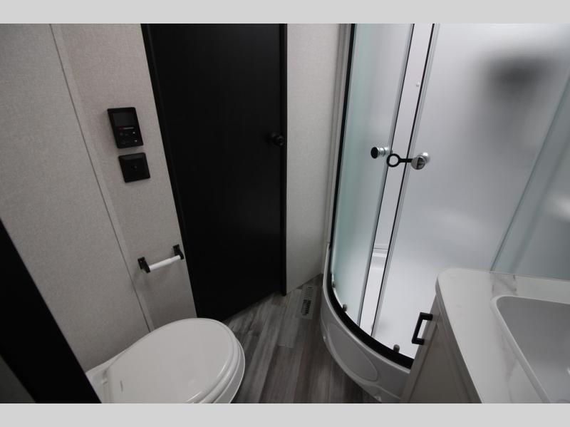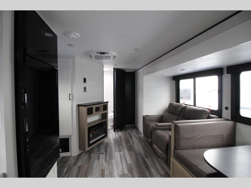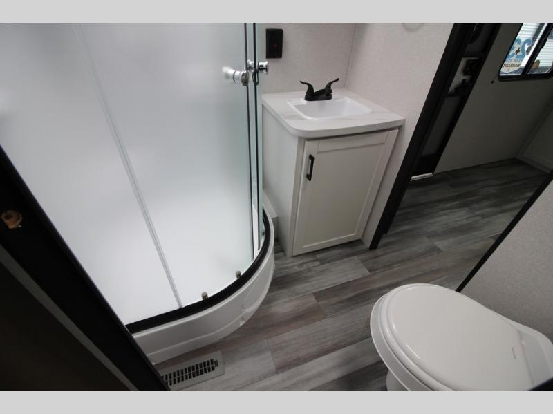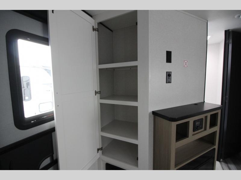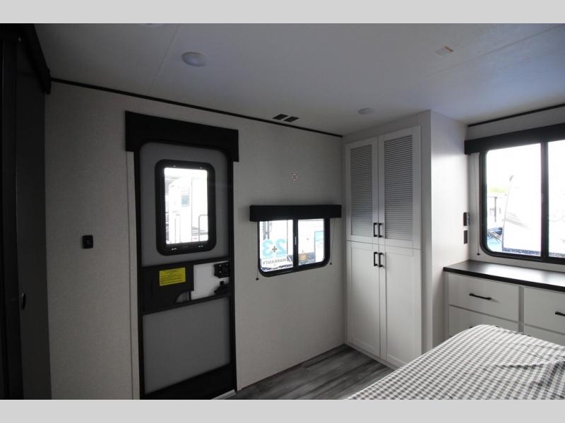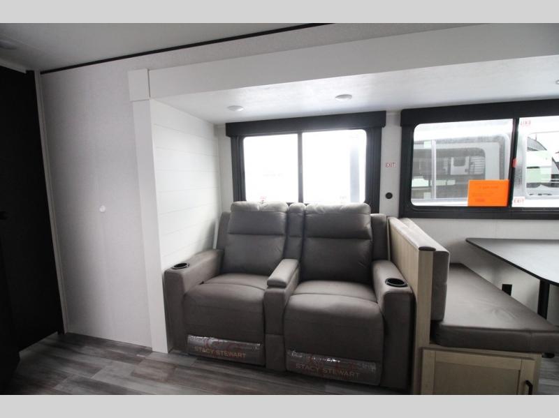 This front kitchen travel trailer is perfect for weekend trips or extended stays at the location of your choice! You'll love the ample counter space to prep meals, and there is a booth dinette where you can dine together each day. A theater seat is in great view of the entertainment center if you want to add a TV, or you may just find yourselves outdoors under the 20' power awning. This unit features a dual entry bath with a private entrance into the rear master bedroom. This room also includes a queen bed slide, a wardrobe and two dressers, plus additional storage with washer and dryer prep. And one of the dual entry doors is found here so you can slip out in the morning for some early fishing!