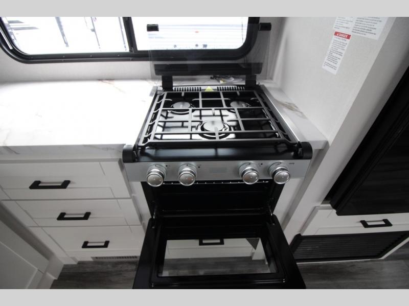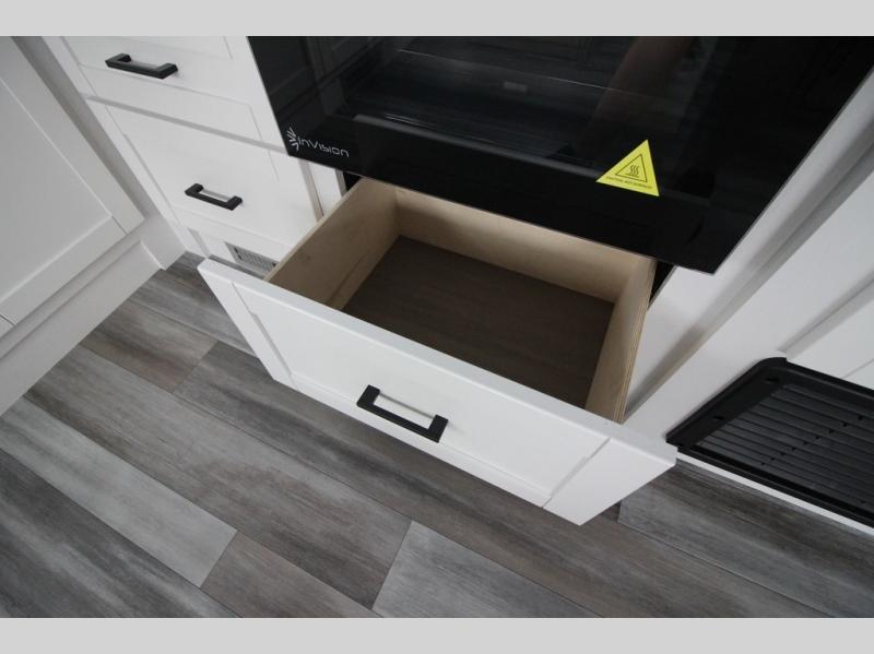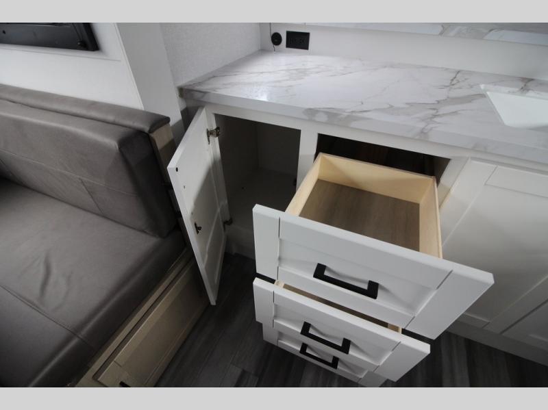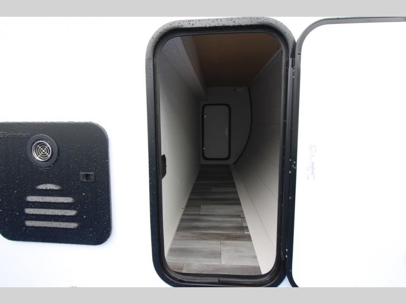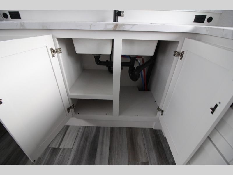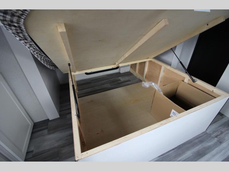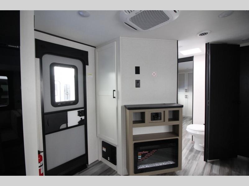 This front kitchen travel trailer is perfect for weekend trips or extended stays at the location of your choice! You'll love the ample counter space to prep meals, and there is a booth dinette where you can dine together each day. A theater seat is in great view of the entertainment center if you want to add a TV, or you may just find yourselves outdoors under the 20' power awning. This unit features a dual entry bath with a private entrance into the rear master bedroom. This room also includes a queen bed slide, a wardrobe and two dressers, plus additional storage with washer and dryer prep. And one of the dual entry doors is found here so you can slip out in the morning for some early fishing!