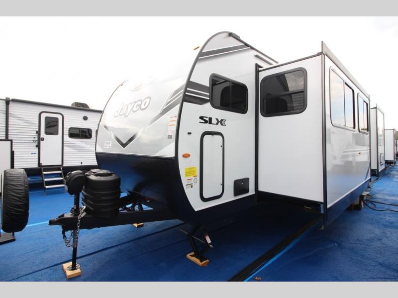 The Jayco Jay Flight SLX travel trailer is quite easy to own because it is lightweight for an easier towing experience. Built on a fully integrated A-frame with galvanized-steel, impact-resistant wheel wells, the Jay Flight SLX has quality at its very foundation. That quality continues on to the electric self-adjusting brakes, easy-lube hubs, Magnum Truss roof system, and LP quick connect. Some of what the mandatory Customer Value Package includes is backup camera prep, Keyed-Alike entry and baggage doors, marine grade exterior speakers, and an on-demand tankless water heater.