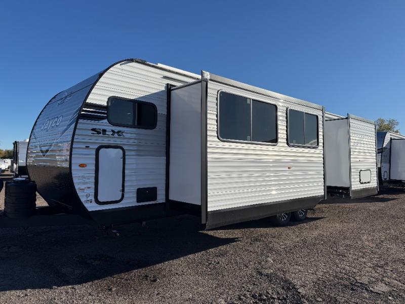 The Jayco Jay Flight SLX travel trailer is quite easy to own because it is lightweight for an easier towing experience. Built on a fully integrated A-frame with galvanized-steel, impact-resistant wheel wells, the Jay Flight SLX has quality at its very foundation. That quality continues on to the electric self-adjusting brakes, easy-lube hubs, Magnum Truss roof system, and LP quick connect. Some of what the mandatory Customer Value Package includes is backup camera prep, Keyed-Alike entry and baggage doors, and an on-demand tankless water heater.
