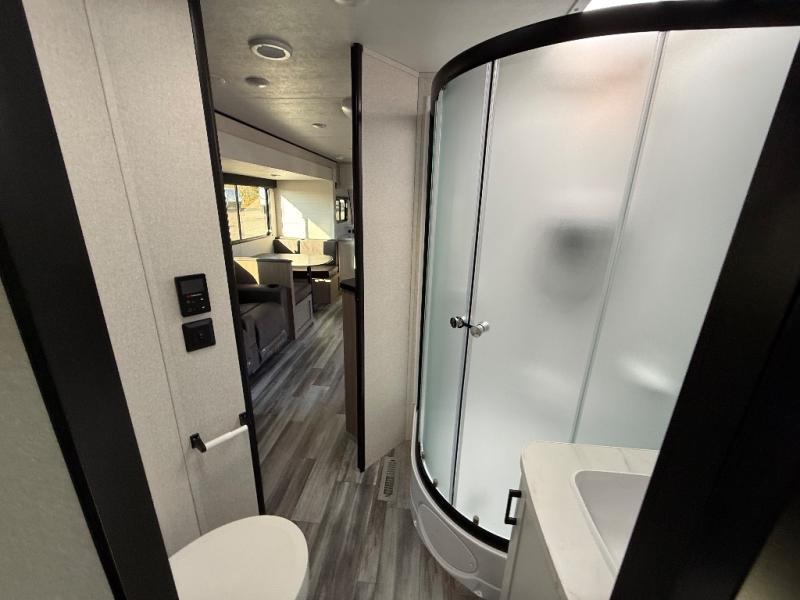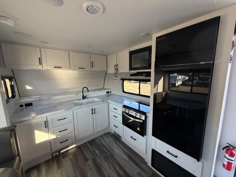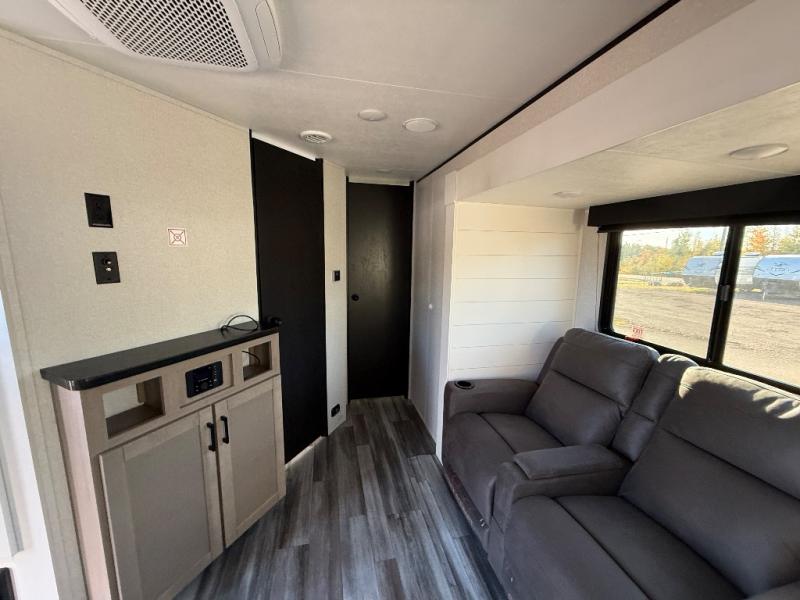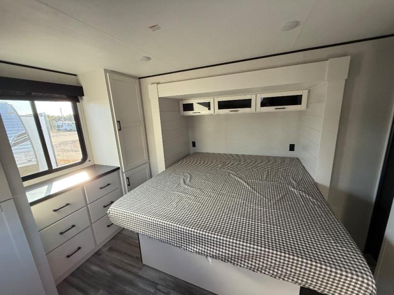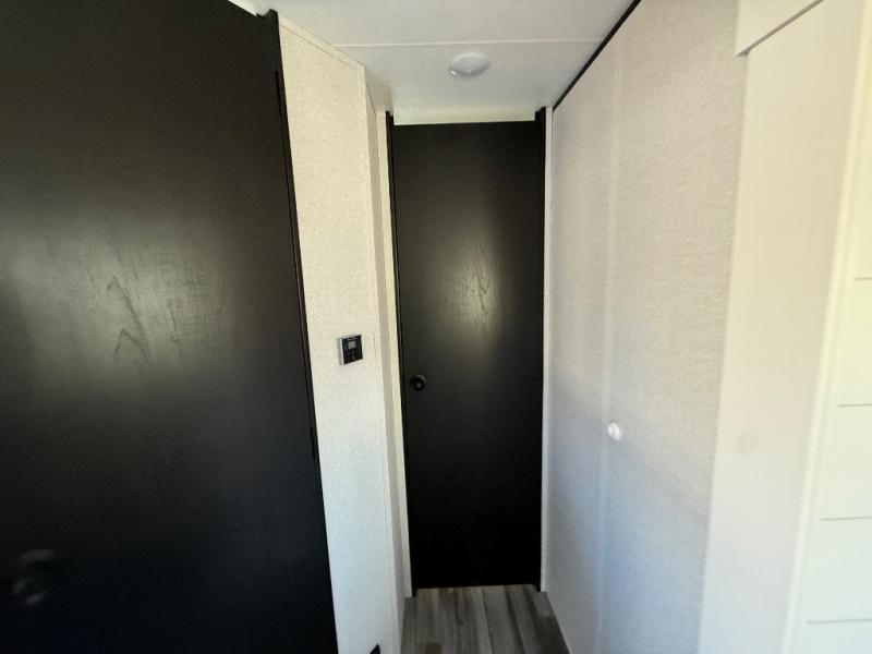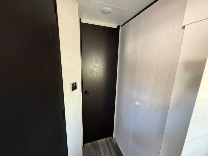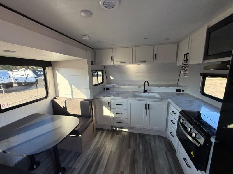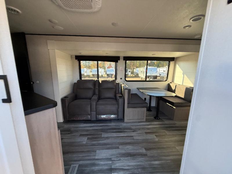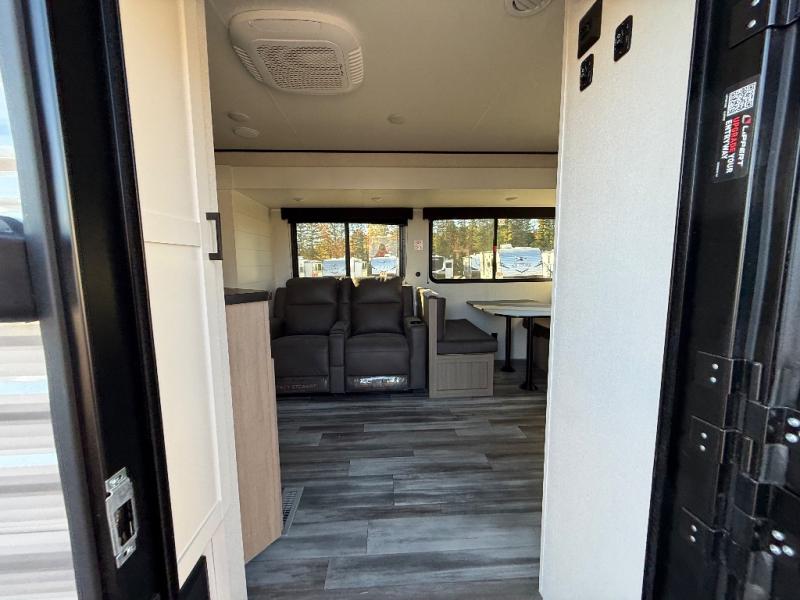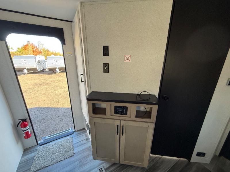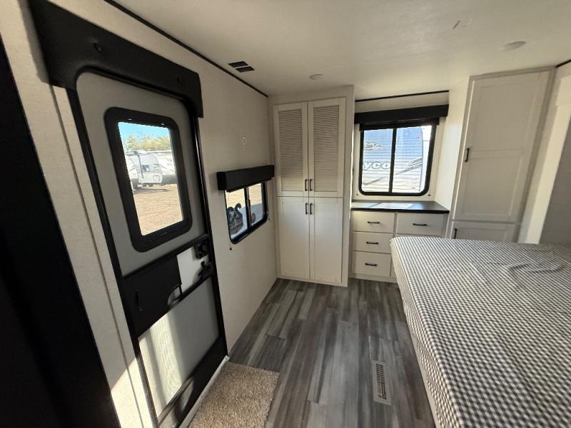 This front kitchen travel trailer is perfect for weekend trips or extended stays at the location of your choice! You'll love the ample counter space to prep meals, and there is a booth dinette where you can dine together each day. A theater seat is in great view of the entertainment center if you want to add a TV, or you may just find yourselves outdoors under the 20' power awning. This unit features a dual entry bath with a private entrance into the rear master bedroom. This room also includes a queen bed slide, a wardrobe and two dressers, plus additional storage with washer and dryer prep. And one of the dual entry doors is found here so you can slip out in the morning for some early fishing!