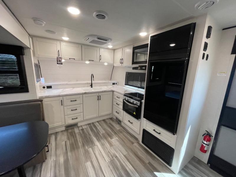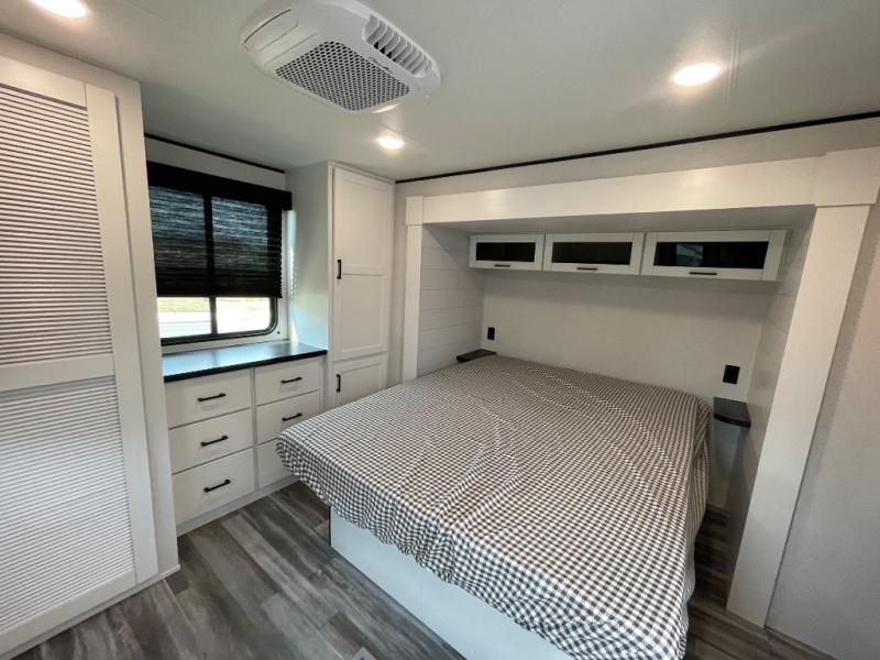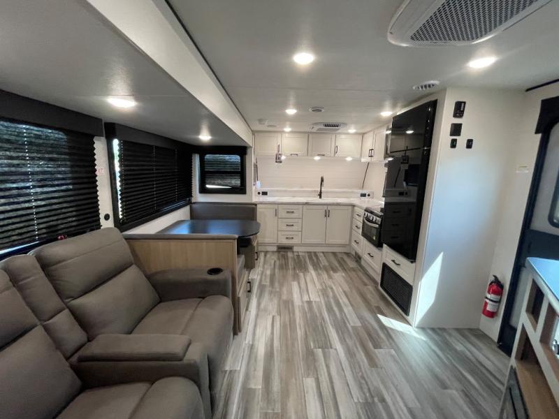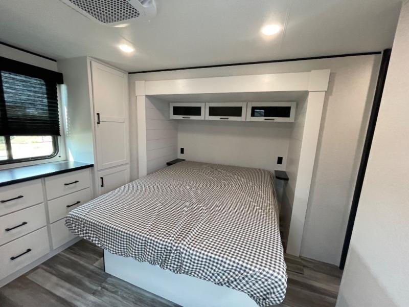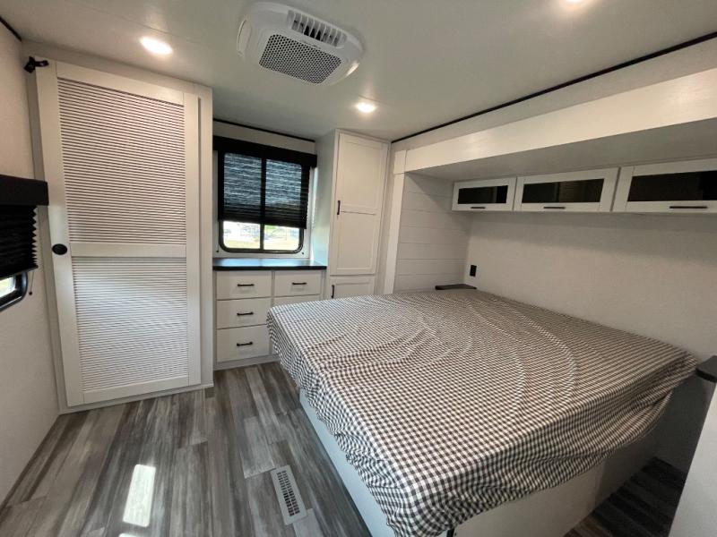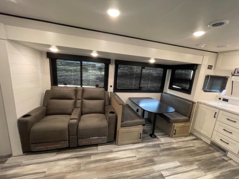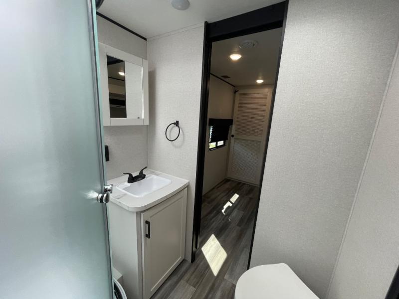 This front kitchen travel trailer is perfect for weekend trips or extended stays at the location of your choice! You'll love the ample counter space to prep meals, and there is a booth dinette where you can dine together each day. A theater seat is in great view of the entertainment center if you want to add a TV, or you may just find yourselves outdoors under the 20' power awning. This unit features a dual entry bath with a private entrance into the rear master bedroom. This room also includes a queen bed slide, a wardrobe and two dressers, plus additional storage with washer and dryer prep. And one of the dual entry doors is found here so you can slip out in the morning for some early fishing!