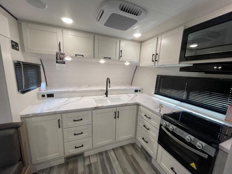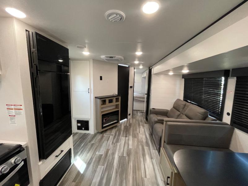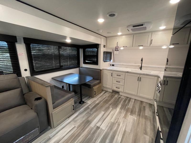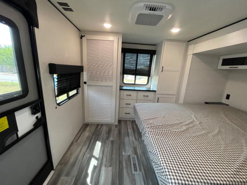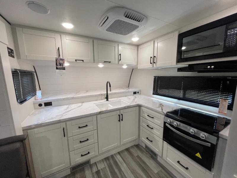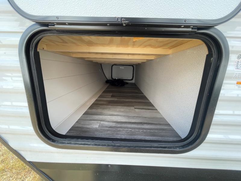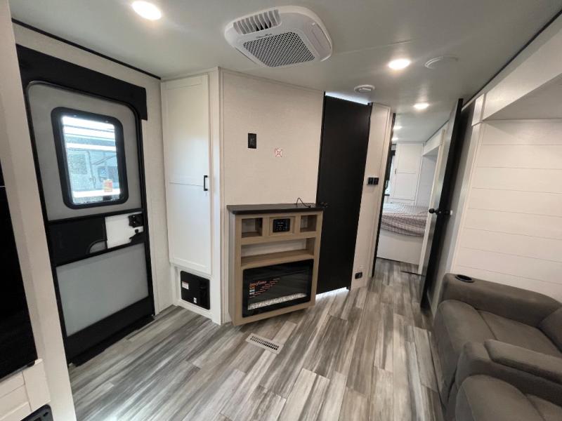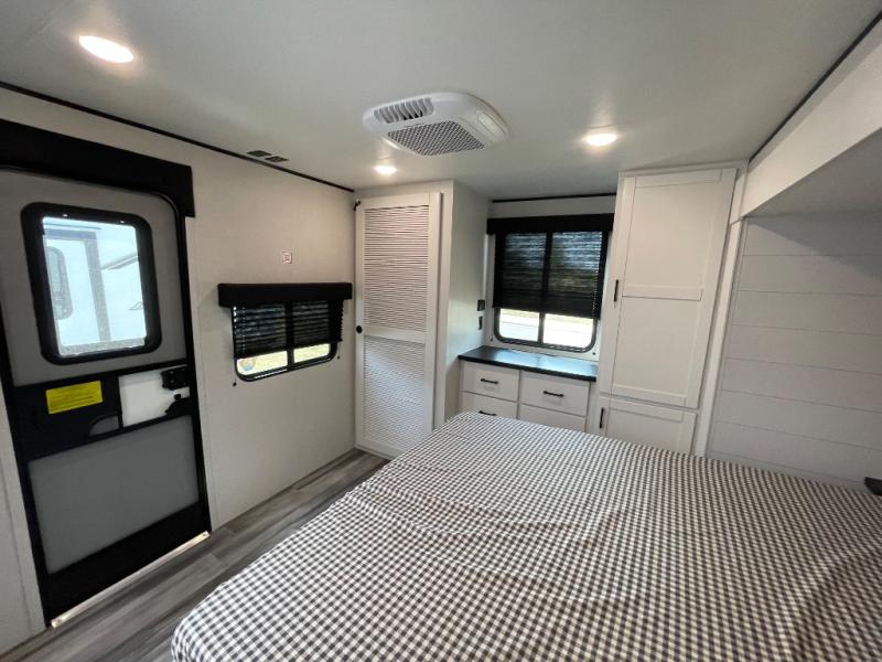 This front kitchen travel trailer is perfect for weekend trips or extended stays at the location of your choice! You'll love the ample counter space to prep meals, and there is a booth dinette where you can dine together each day. A theater seat is in great view of the entertainment center if you want to add a TV, or you may just find yourselves outdoors under the 20' power awning. This unit features a dual entry bath with a private entrance into the rear master bedroom. This room also includes a queen bed slide, a wardrobe and two dressers, plus additional storage with washer and dryer prep. And one of the dual entry doors is found here so you can slip out in the morning for some early fishing!