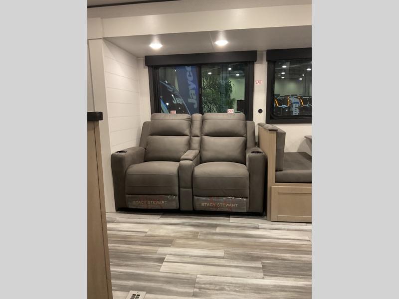 This front kitchen travel trailer is perfect for weekend trips or extended stays at the location of your choice! You'll love the ample counter space to prep meals, and there is a booth dinette where you can dine together each day. A theater seat is in great view of the entertainment center if you want to add a TV, or you may just find yourselves outdoors under the 20' power awning. This unit features a dual entry bath with a private entrance into the rear master bedroom. This room also includes a queen bed slide, a wardrobe and two dressers, plus additional storage with washer and dryer prep. And one of the dual entry doors is found here so you can slip out in the morning for some early fishing!